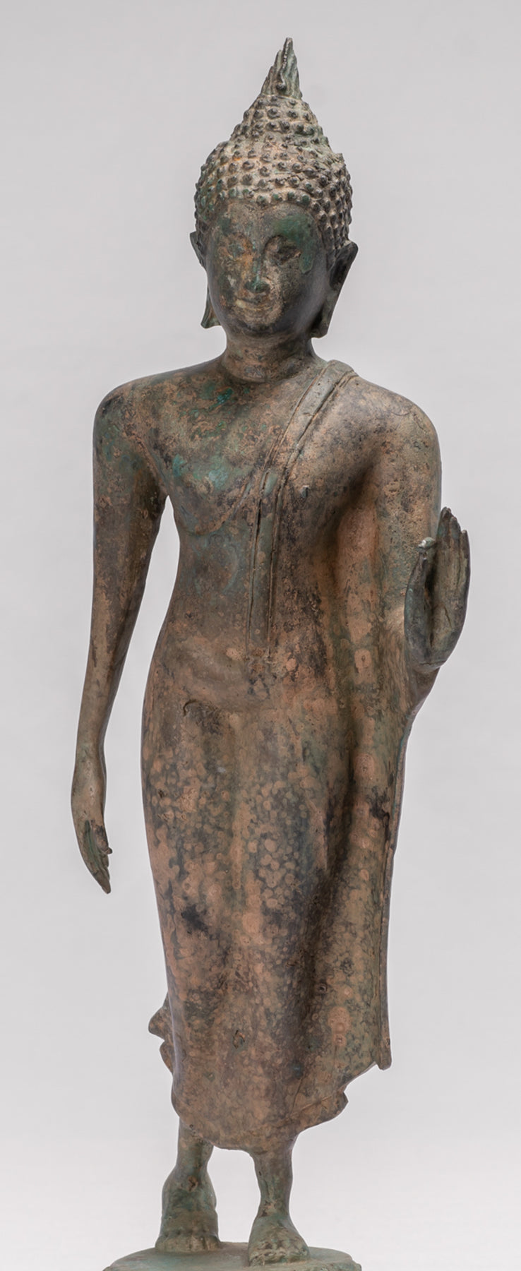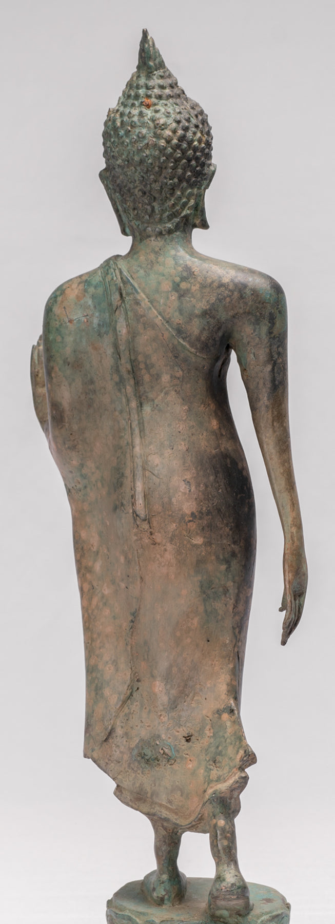 Der große, flammende Ushnisha-Vorsprung auf seinem Kopf, der typisch für die Sukhothai-Zeit ist, symbolisiert seinen hohen spirituellen Entwicklungsstand.