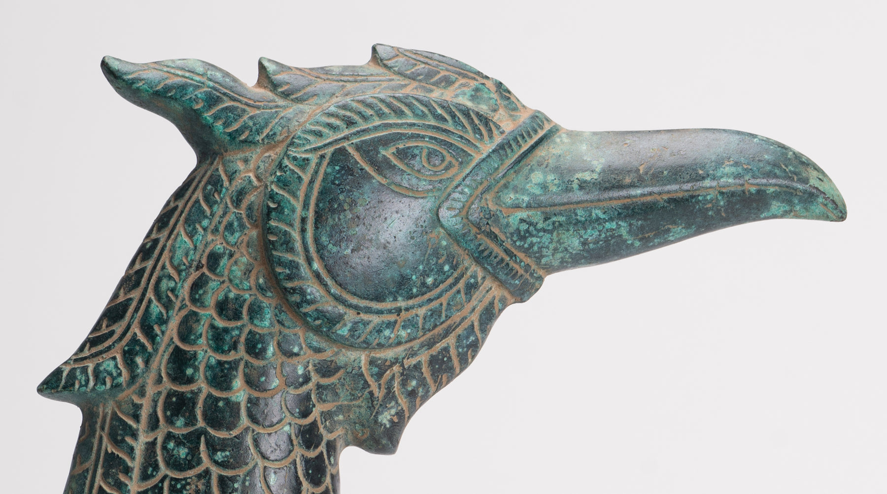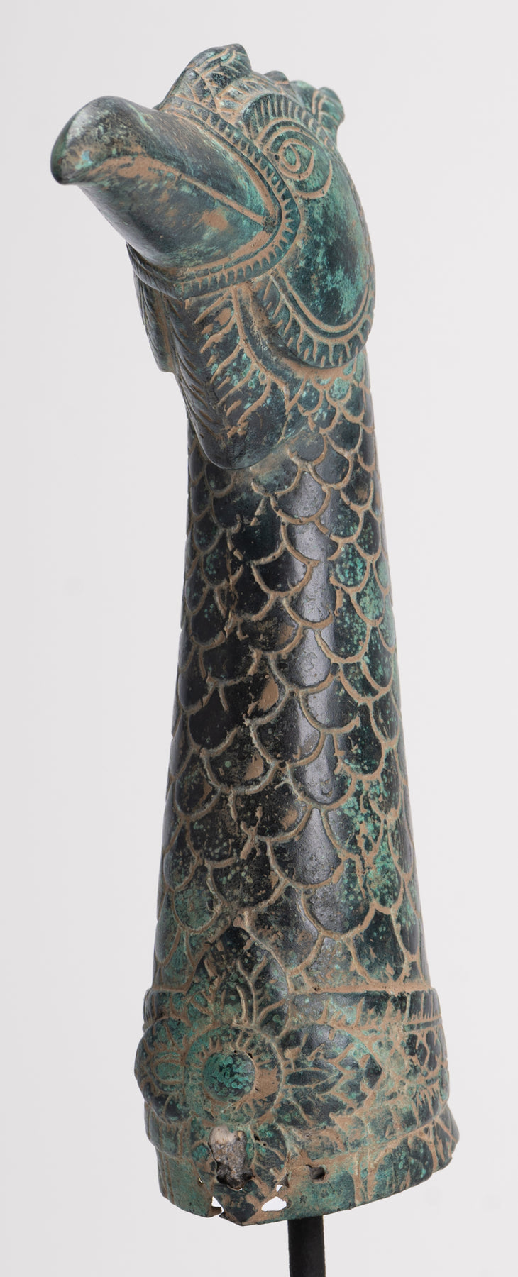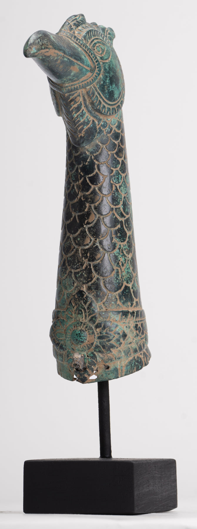 Eine antike Skulptur im thailändischen Stil eines mythischen Vogels (Gans oder Pfau?). In vielen hinduistischen und buddhistischen Kontexten wird der Wildvogel (hier in stark stilisierter Form zu sehen) mit dem Schweben hoch über der Erde und damit mit Distanziertheit und spiritueller Erlangung in Verbindung gebracht.