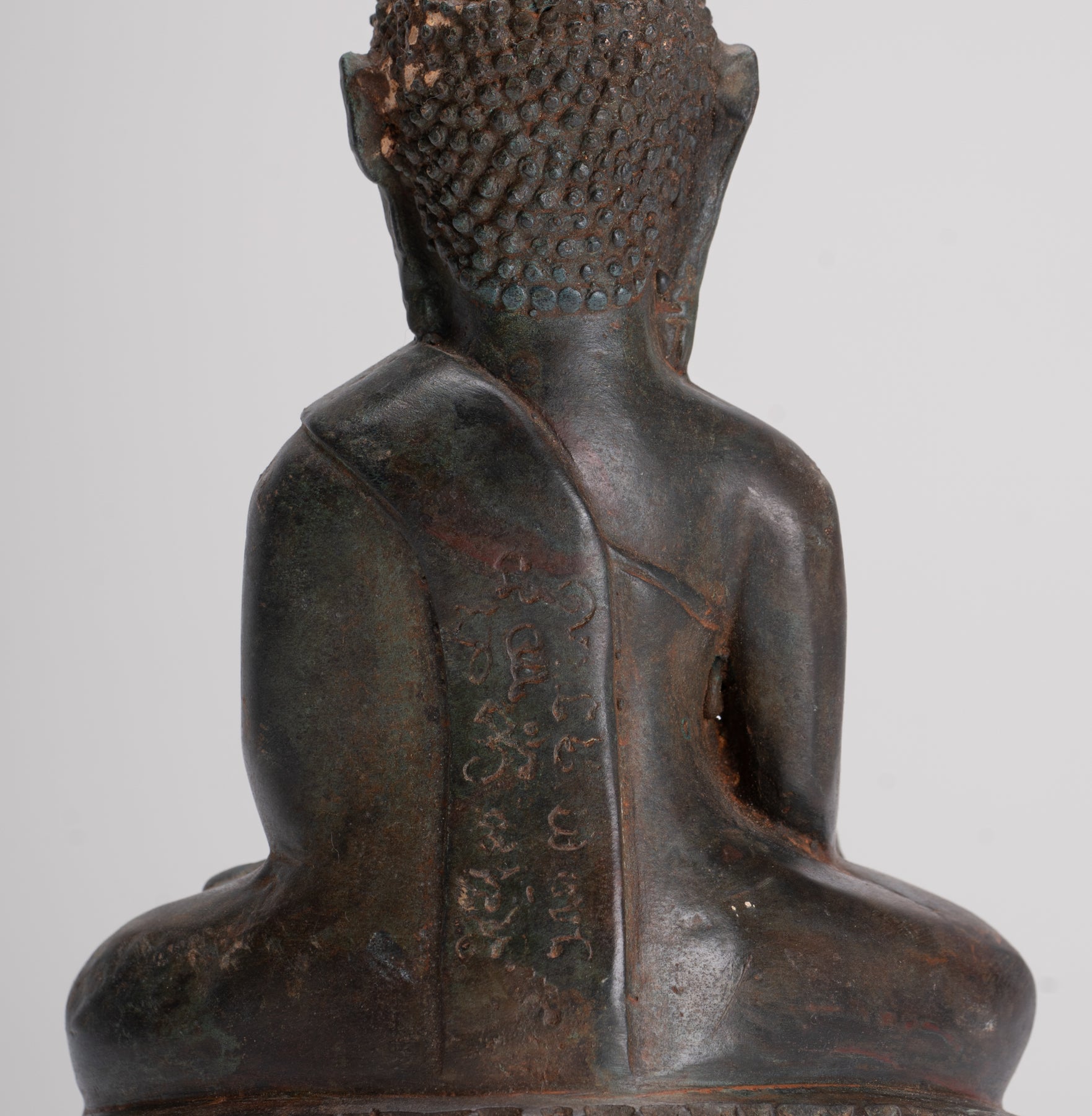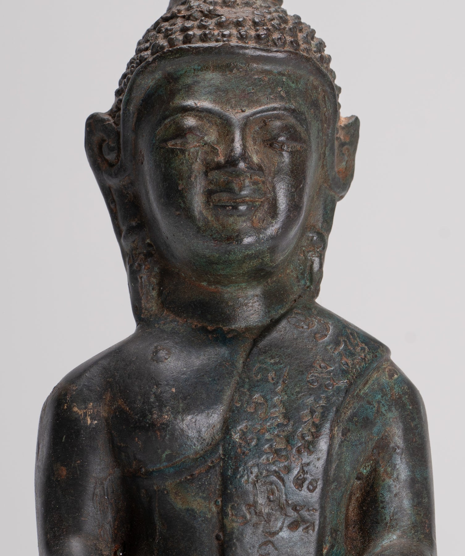 Die Vorhänge von ihm Mönchsgewand ist elegant gerendert, seine Falten sind mit etwas verziert, das zu sein scheint Sanskrit-Inschriften, möglicherweise unter Berufung auf Segnungen oder heilige Verse. Das Gesamtdesign spiegelt beides wider hingebungsvolle Ehrfurcht und künstlerische Raffinesse, charakteristisch für die buddhistische Kunst Südostasiens.