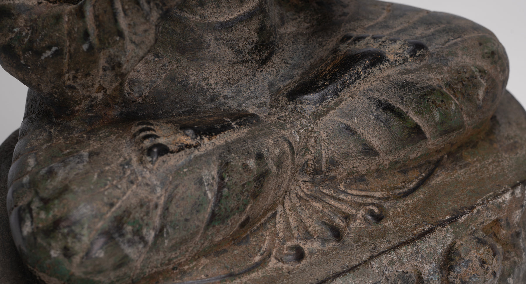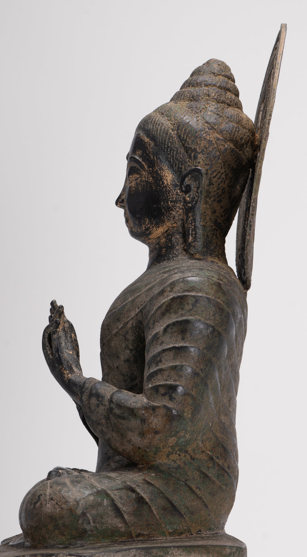 Das Körperprofil weist breite Schultern und eine schlanke Taille auf, die von einer verzierten Sanghati-Robe bedeckt sind, die über beiden Schultern getragen wird.