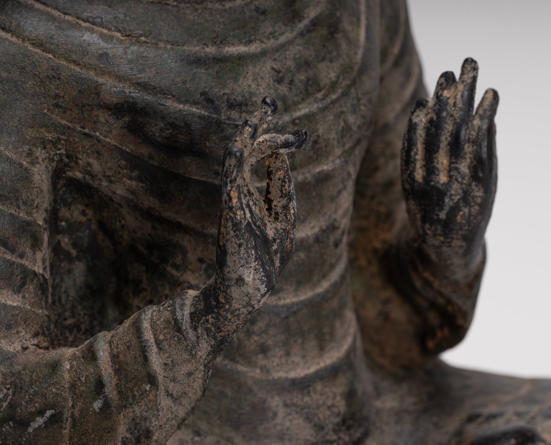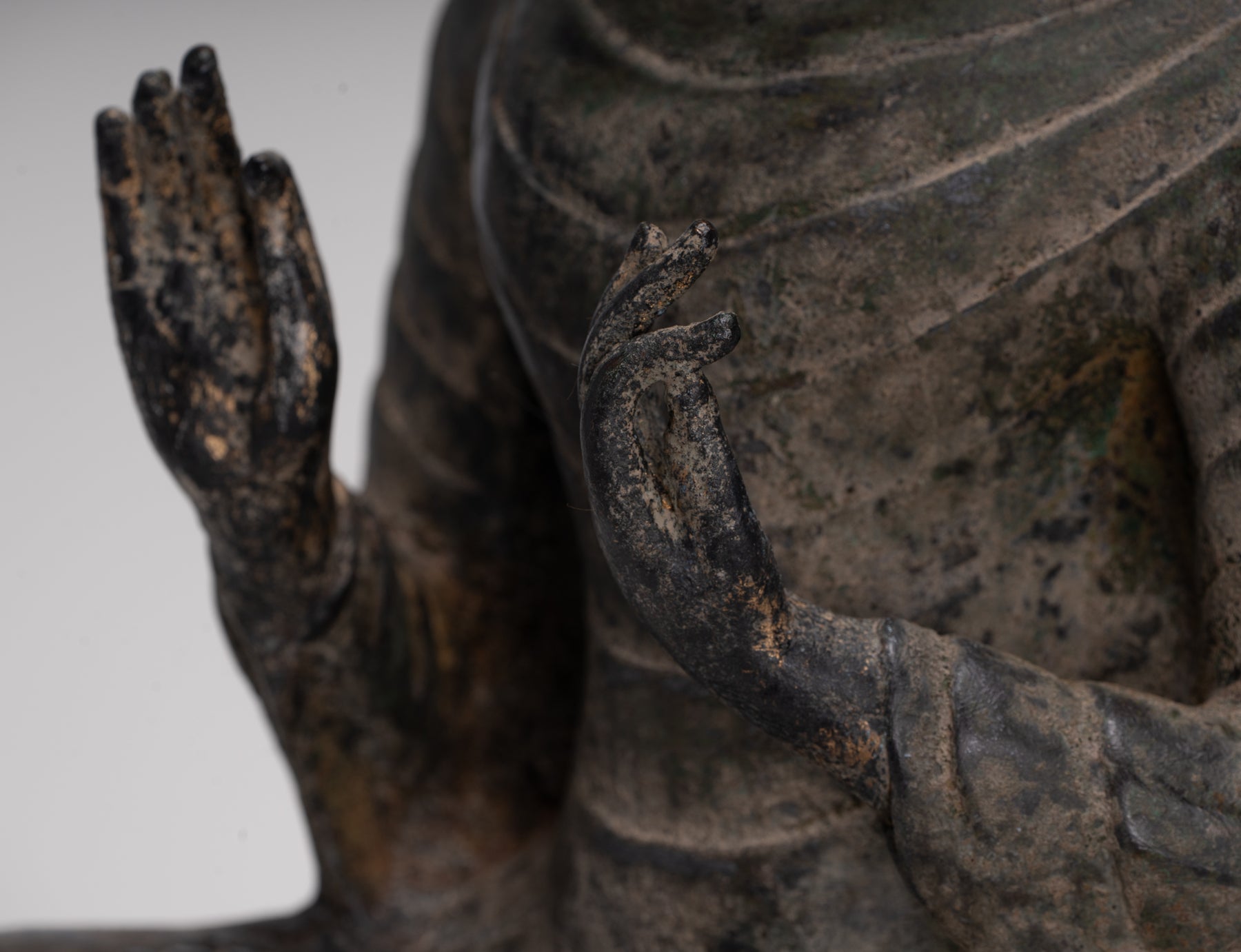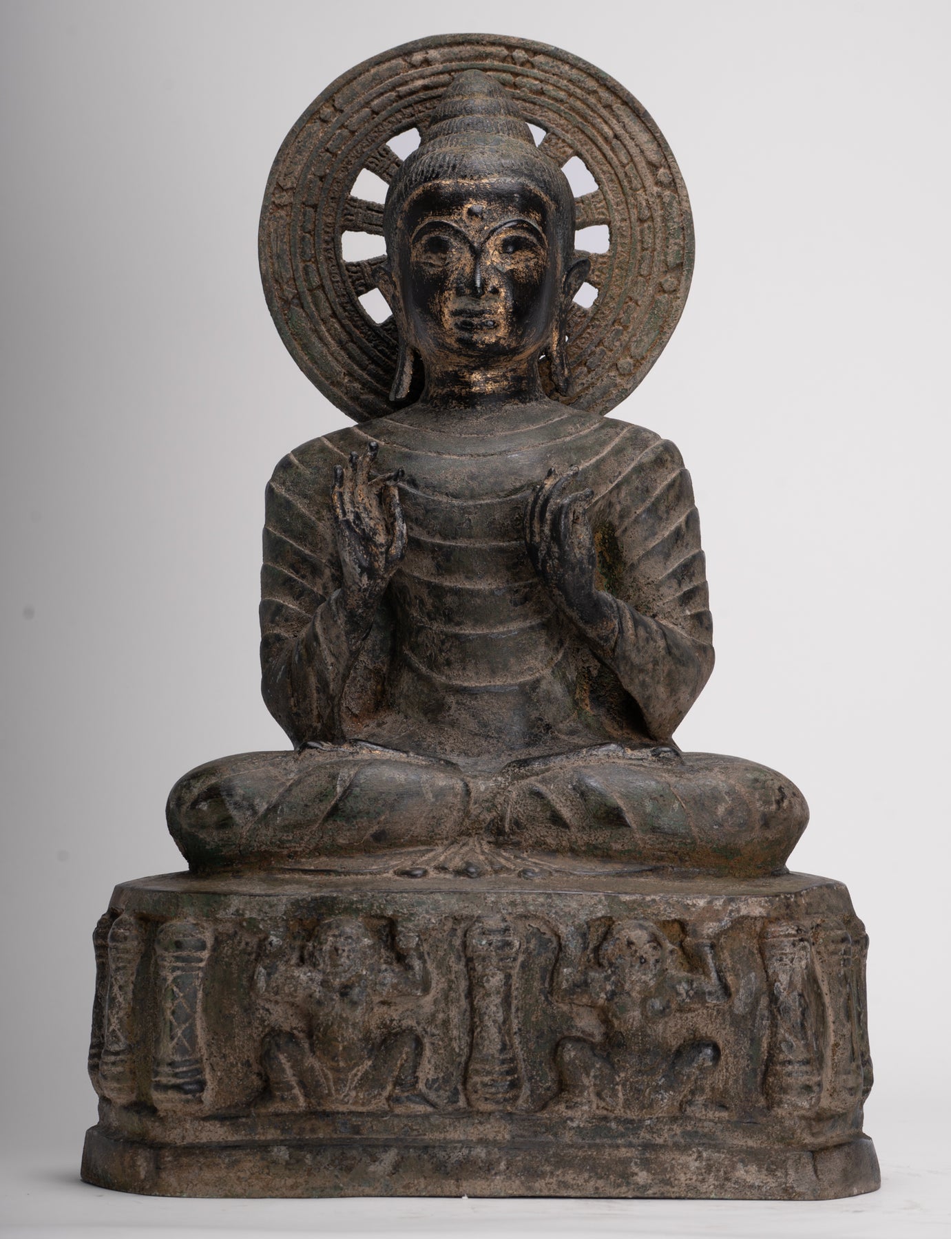 Ein antiker Buddha im thailändischen Stil, der im doppelten Dharmachakra-Mudra sitzt.