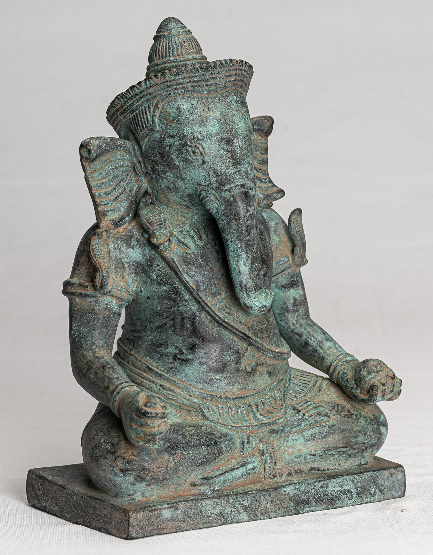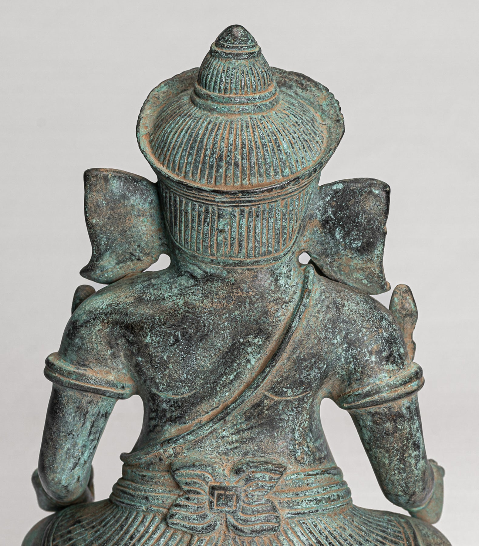 Auf der Rückseite ist der Sampot mit einer Schleife im Schmetterlingsstil im Post-Angkor-Wat-Stil befestigt. Besonders reizvoll ist die charakteristische Patina des Stückes. Ganesha ist der elefantenköpfige Sohn Shivas.