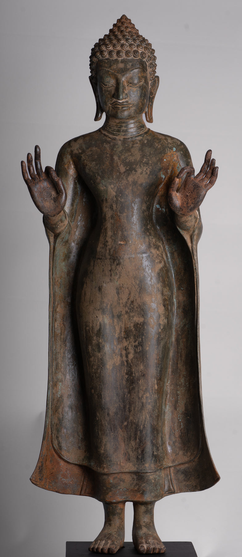 Ein Antiker stehender Buddha aus Bronze im thailändischen Stil, hergestellt in der Dvaravati-Stil aus dem 11. Jahrhundert, verkörpert die heitere Anmut und die raffinierte Kunstfertigkeit einer Zivilisation, die einst im Zentrum blühte Thailand. Die Dvaravati-Zeit, die ungefähr vom 6. bis zum 11. Jahrhundert reichte, markierte eine lebendige Ära der kulturellen Synthese – der Vermischung Mon-, indische und frühe Khmer-Einflüsse in eine klare Bildsprache, die Spiritualität, Harmonie und kontemplative Haltung ausstrahlt.