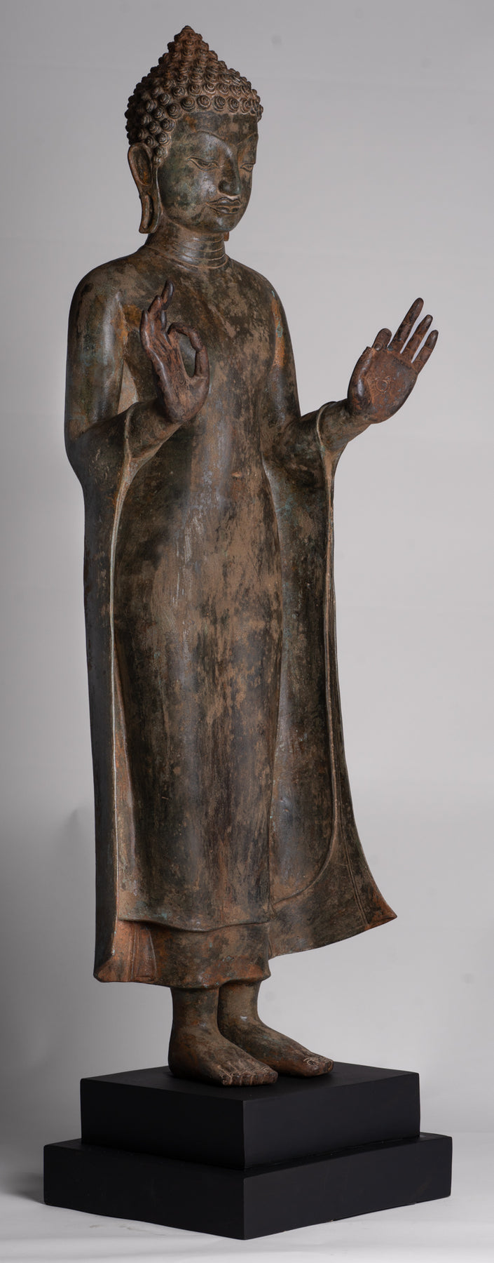 Die Dvaravati-Buddha-Skulpturen werden für ihr Gleichgewicht, ihre Symmetrie und ihre ruhige Würde gefeiert. Diese außergewöhnliche Figur steht im Samapada Haltung – gestreckte Beine und aufrecht – verankert auf einem wunderschön geschnitzten Holzsockel. Der Buddha ist in die klösterlichen Gewänder der Theravāda-Tradition gehüllt und trägt zwei fließende Gewänder: ein um die Hüften geschlungenes Untergewand und ein langes Außengewand, das beide Schultern umhüllt. Die Drapierung schmiegt sich sinnlich an der Form, die auf subtile Weise die darunter liegende Anatomie enthüllt und den Einfluss der Gupta widerspiegelt Thailand durch frühen indischen künstlerischen Austausch.