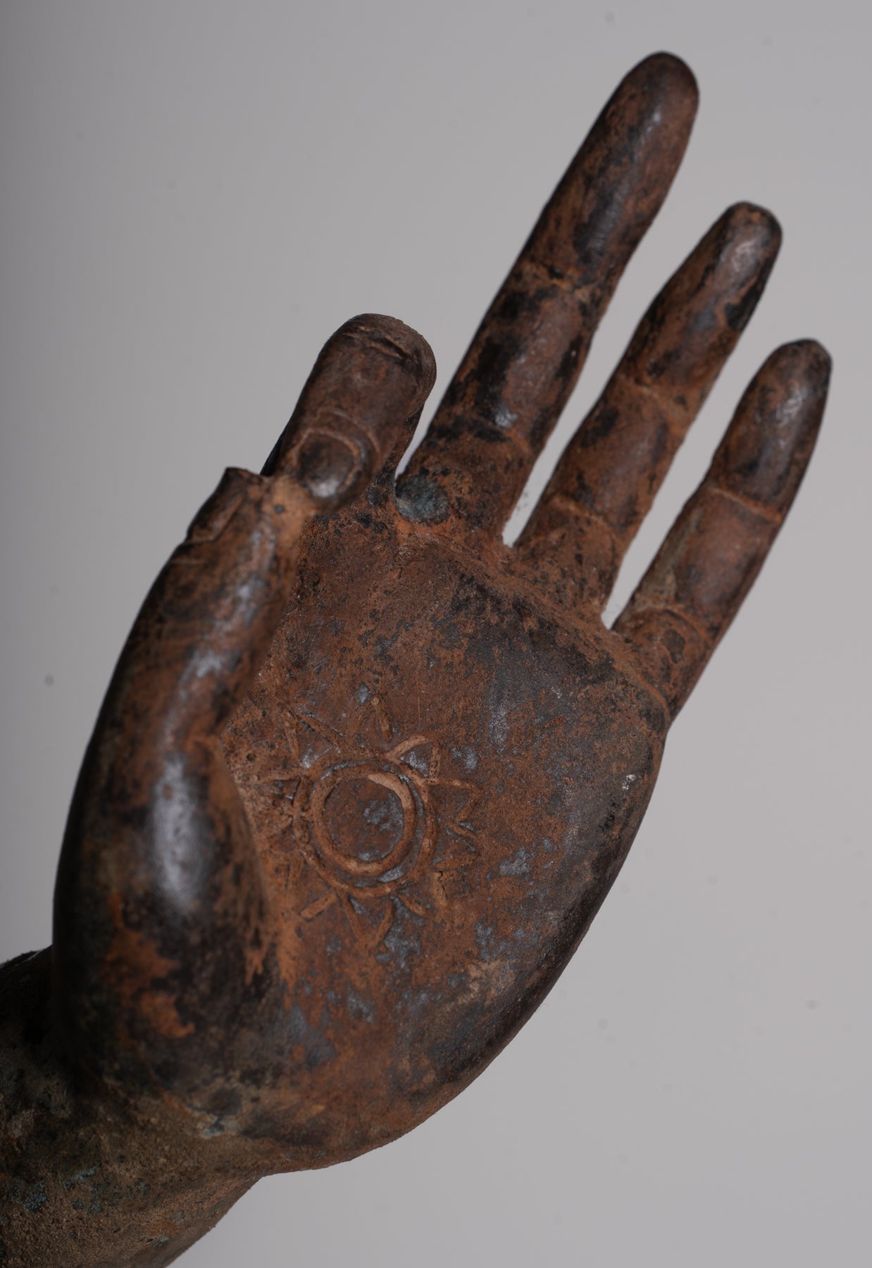 Hier führt der Buddha das aus doppeltes Dharmachakra Mudraoder „Geste des Lehrens“. Auf Sanskrit, Dharmachakra bedeutet wörtlich „Rad des Dharma“. Diese heilige Geste erinnert an Buddhas erste Predigt im Deer Park in Sarnath, als er das ewige Rad der spirituellen Wahrheit in Bewegung setzte. Beide Hände sind vor der Brust erhoben, mit dem Daumen und Zeigefinger berühren sich Kreise zu bilden – Symbole des endlosen Kreislaufs des kosmischen Gesetzes und des Vereinigung von Weisheit und Methode. Dieses Mudra stellt einen der tiefgreifendsten Momente in der buddhistischen Geschichte dar: die Übertragung der Erleuchtung vom Lehrer zum Schüler und die mitfühlende Entschlossenheit, andere zur Befreiung vom Leiden zu führen.