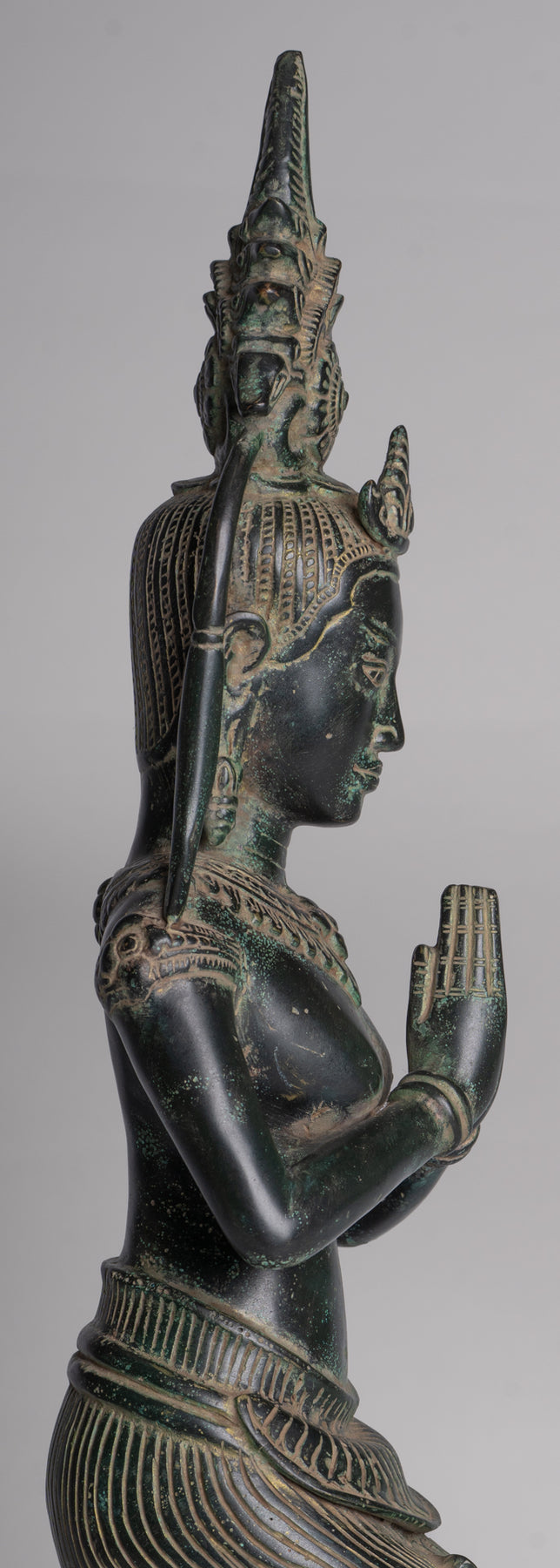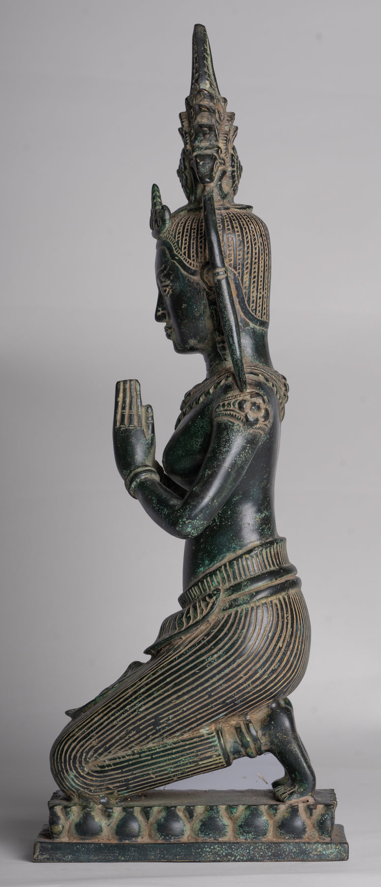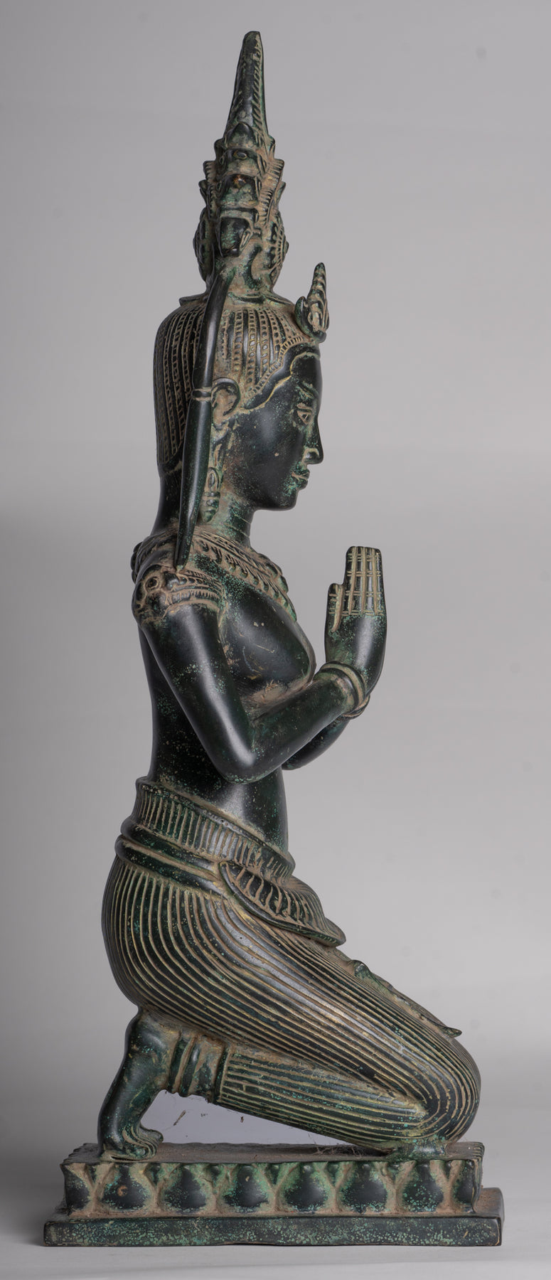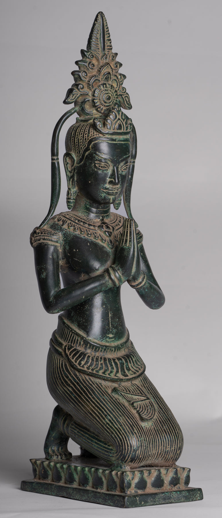 Eine antike Bronze im Khmer-Stil Apsara, oder himmlischer Engel, im Angkor Wat-Stil. Mit respektvoll vor der Brust gefalteten Händen kniet sie in einer Haltung der Anbetung und Hingabe und verkörpert gelassene Anmut und stille Ehrfurcht.