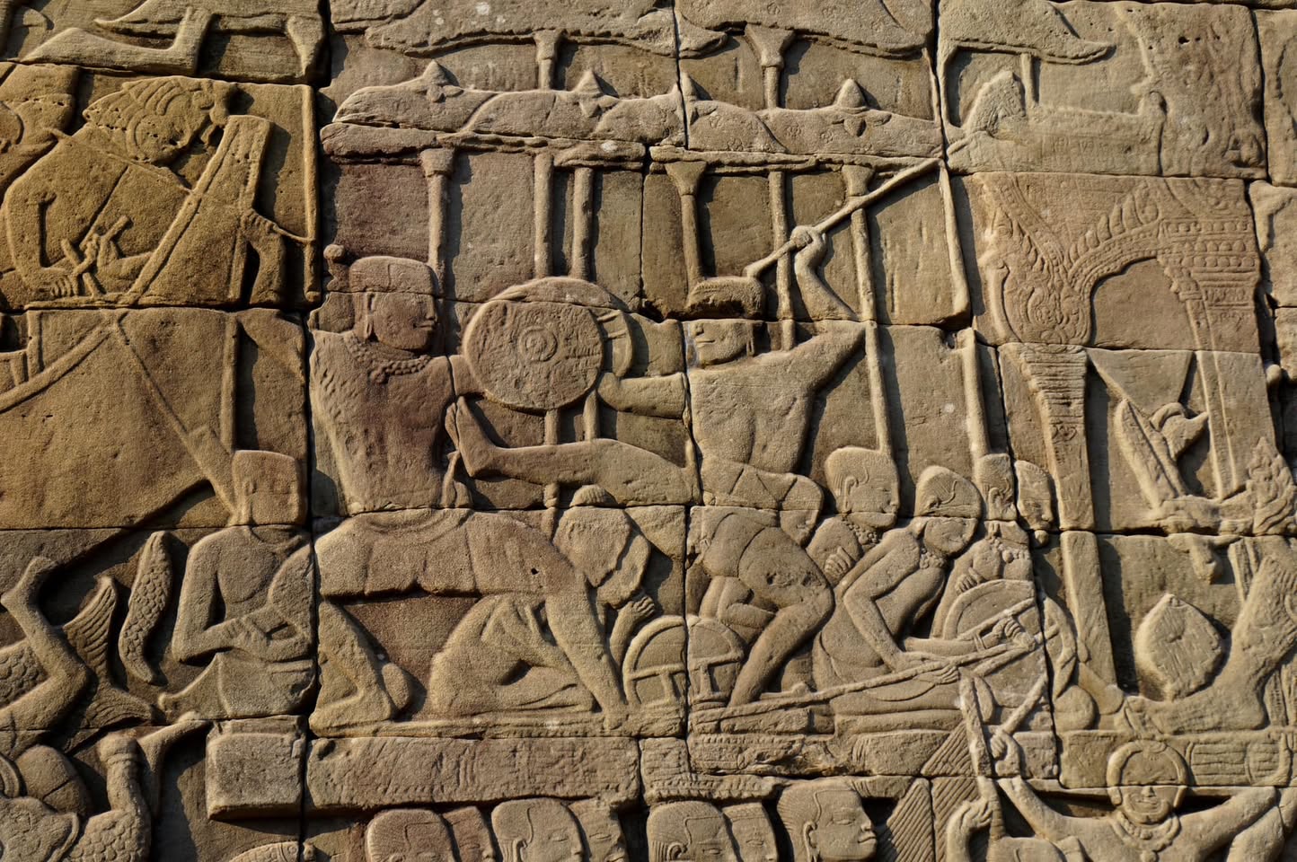 Zusammenfassend zeigen die Flachreliefs die allgemeine Zusammensetzung der Sicherheitskräfte des Königs, zu denen Fußsoldaten und Elefanten gehörten, von denen einige möglicherweise weiblich waren und alle mit zeitgenössischen Waffen wie Speeren und Schilden bewaffnet waren.In den allgemein verfügbaren Reliefs oder zugehörigen Inschriften sind keine spezifischen Namen seiner Leibwächter aufgeführt.Die in den Stein von Bayon eingravierten Schilde der Khmer-Waffen bieten ein mehrdimensionales Porträt der Antike Kambodscha– wo spirituelle Symbolik, innovatives Design und heroische Legenden ineinander greifen.