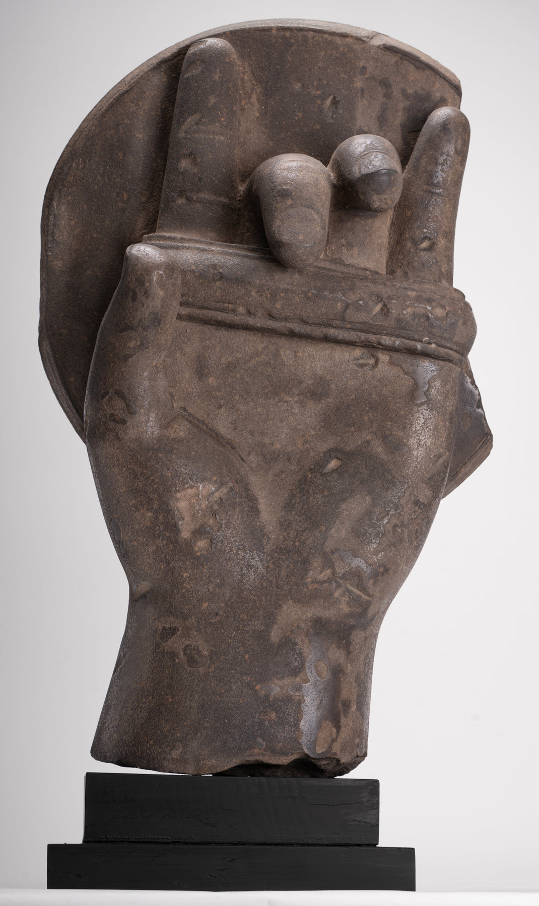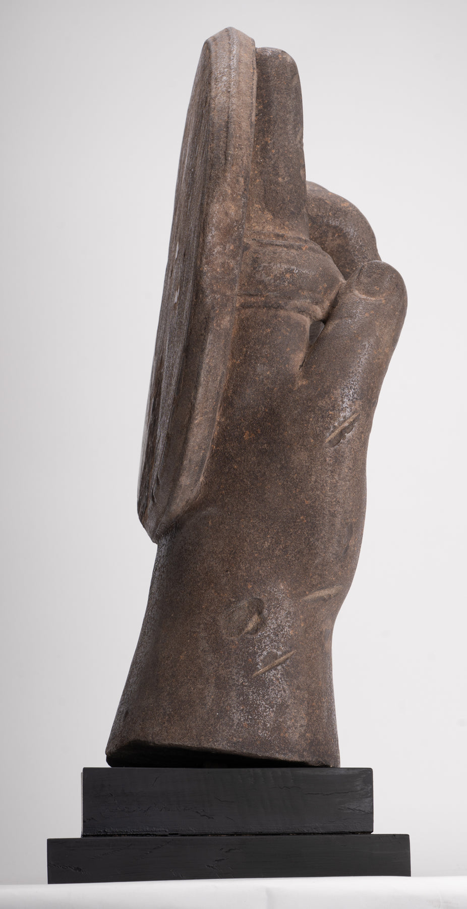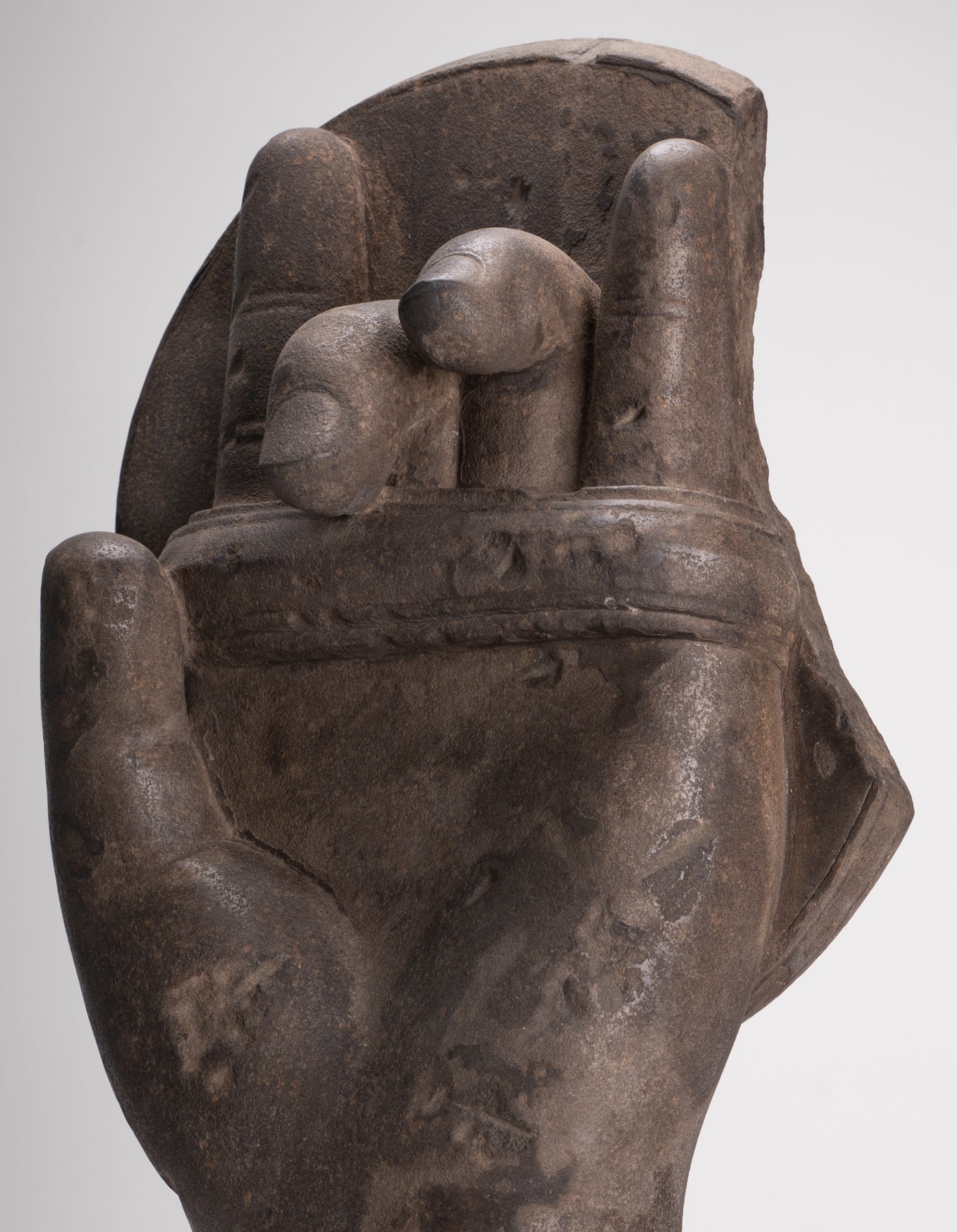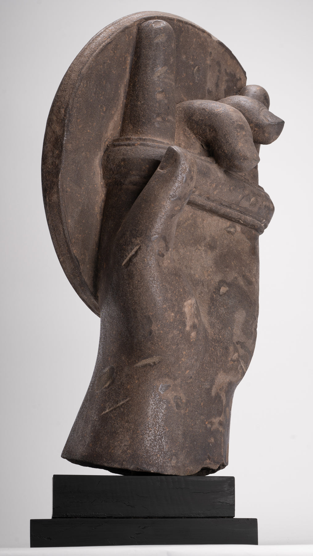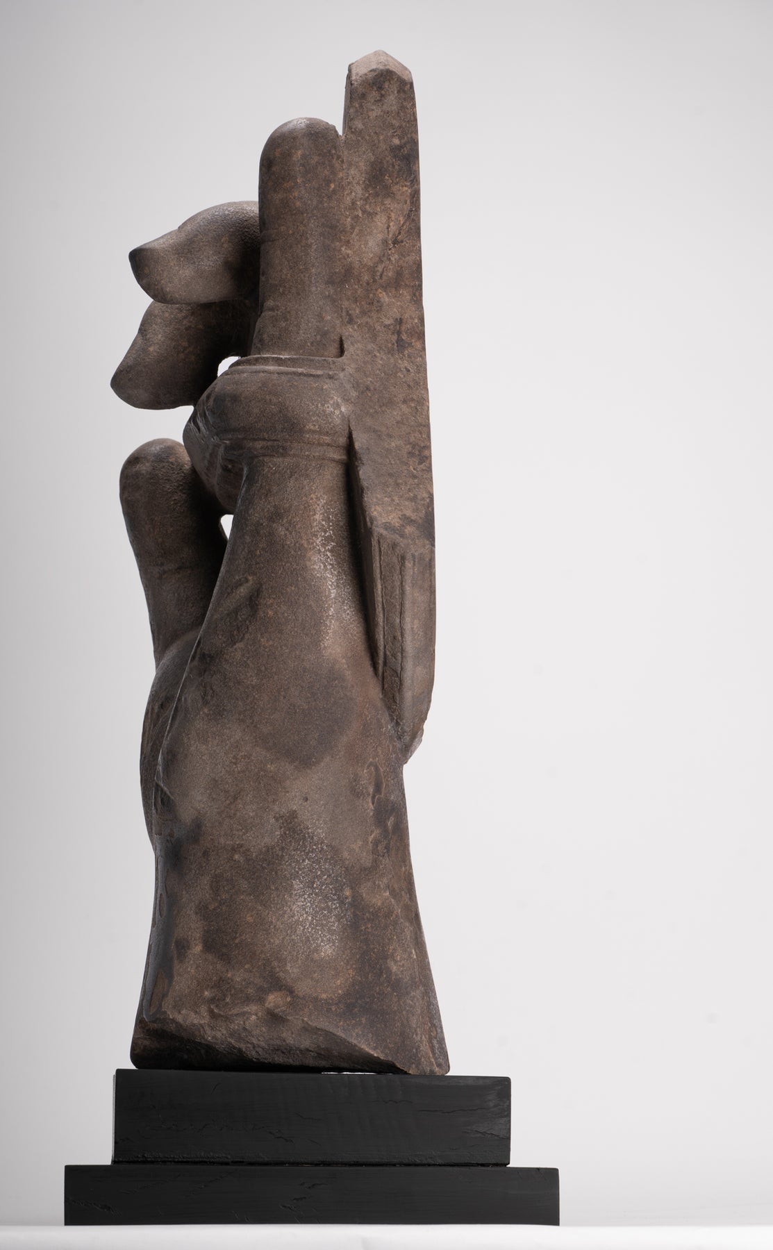 Ein fabelhafter und sehr ungewöhnlicher Sandstein-Hand- und Buckler-Schild aus dem 12. Jahrhundert im Post-Angkor-Bayon-Stil Kambodscha.