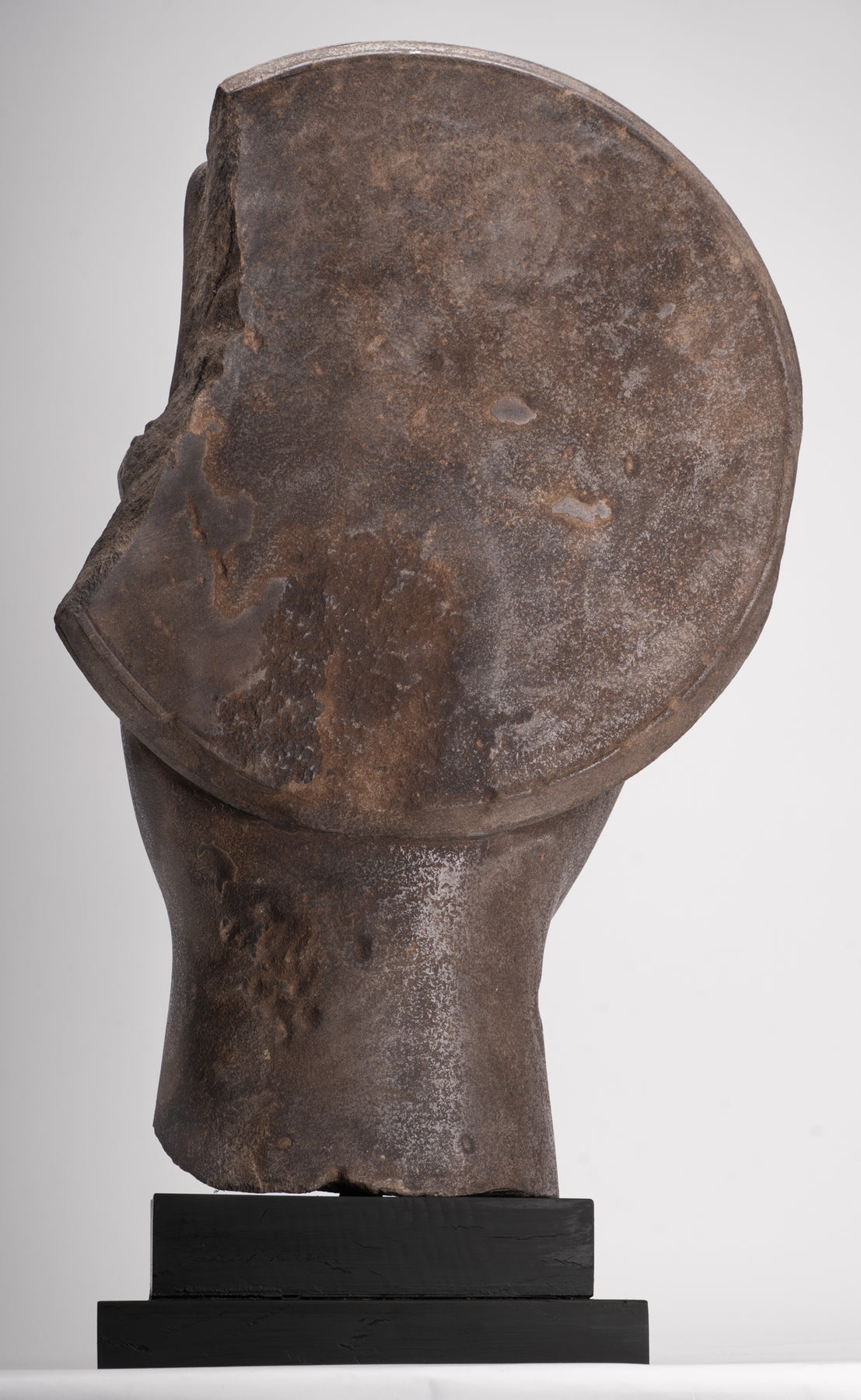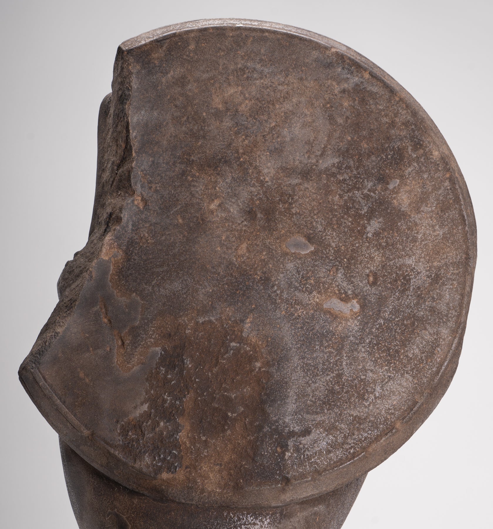 Diese Skulptur wird als Fundstück präsentiert, elegant aus einem massiven Sandsteinblock modelliert. Wie bei Bildern aus dieser Zeit spiegelt die Ornamentik eine perfekte Beherrschung der Bildhauerei und Fließfähigkeit wider. Die detaillierten Merkmale der Statue strahlen Größe aus und wirken gleichzeitig zart.