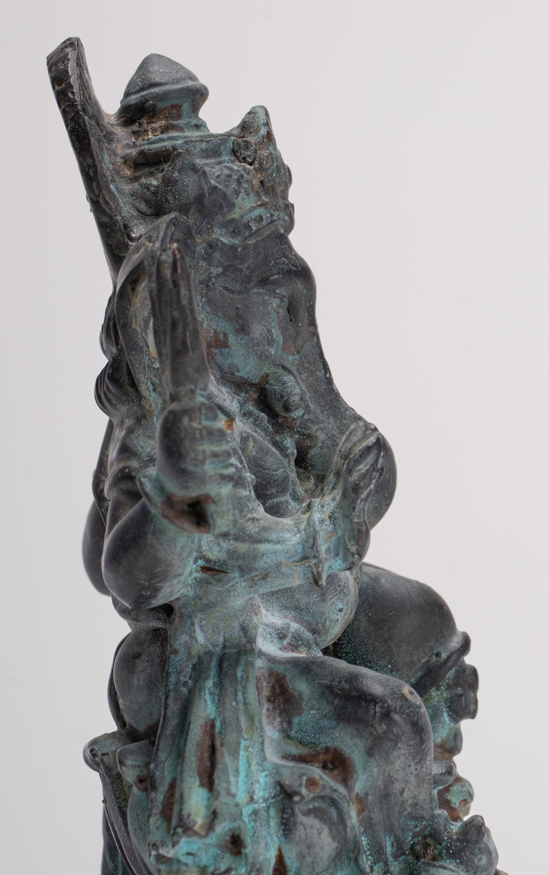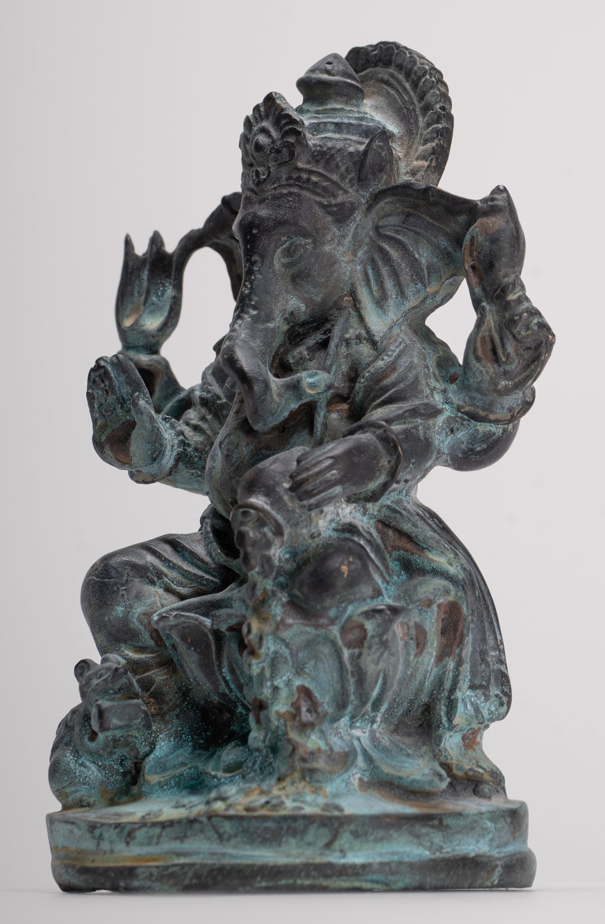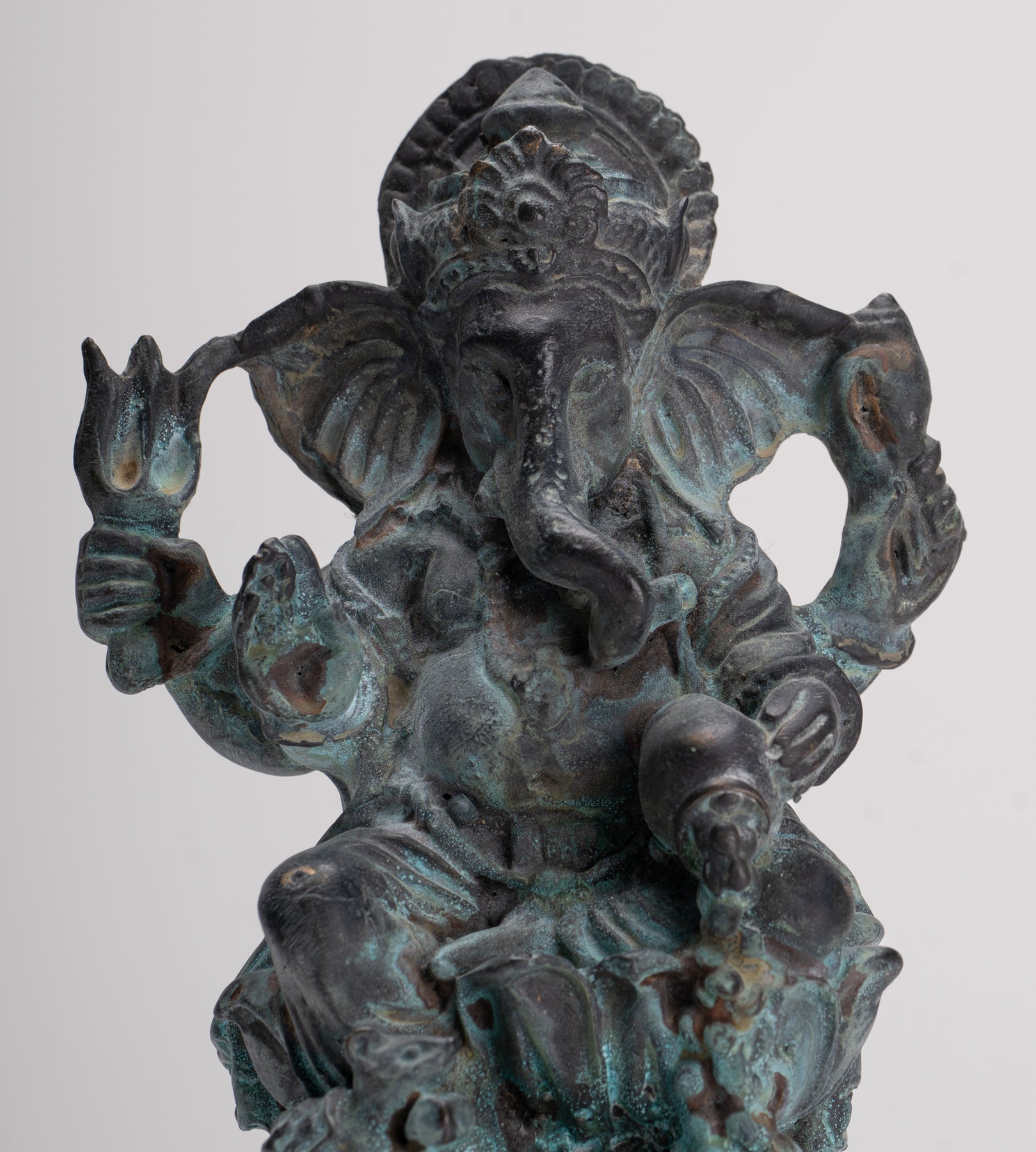 Eine ausdrucksstarke Besetzung aAntiker 4-armiger Vara Ganapati Ganesha aus Bronze im thailändischen Stil, sitzend auf einem einfachen Sockel.