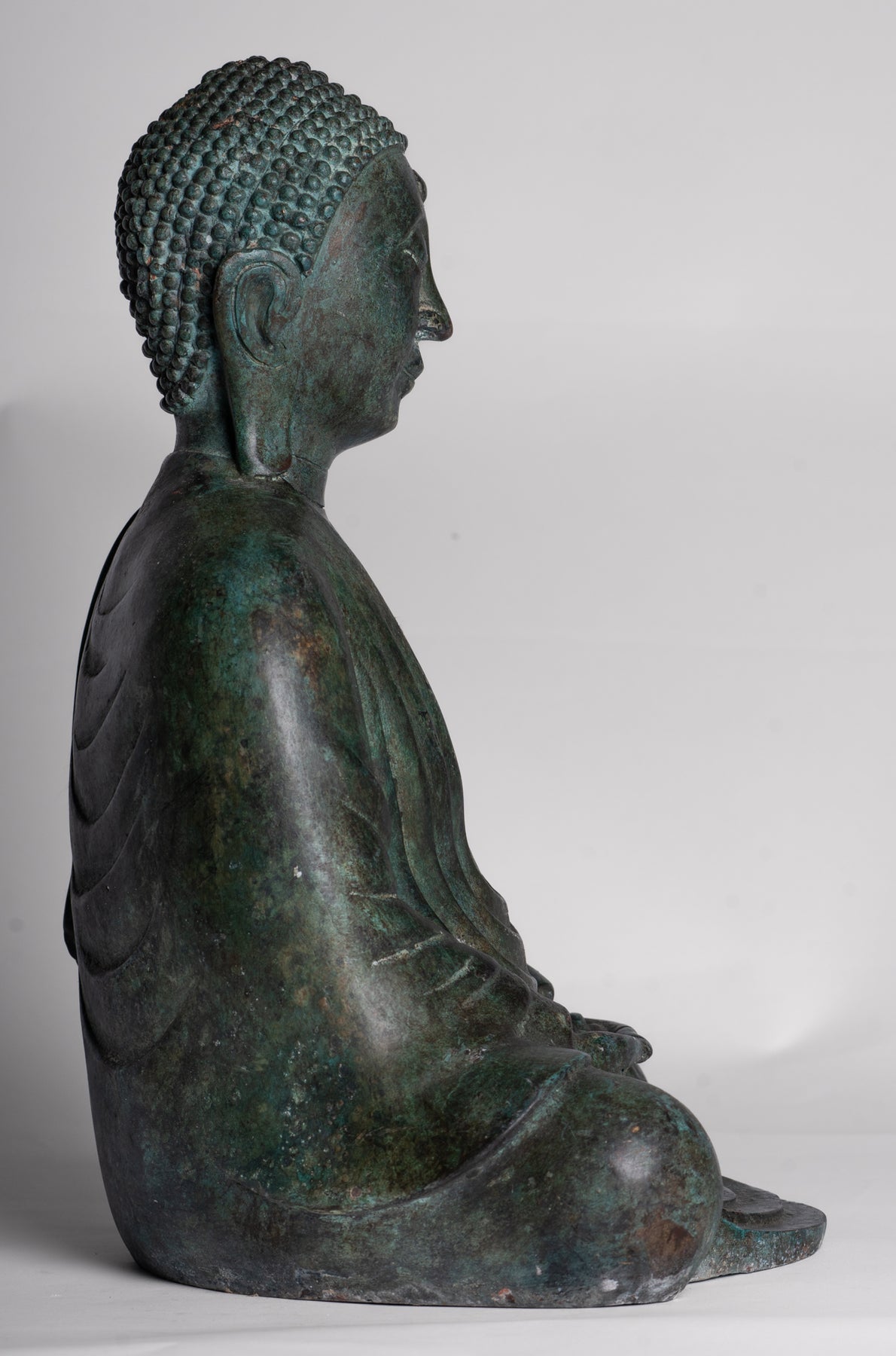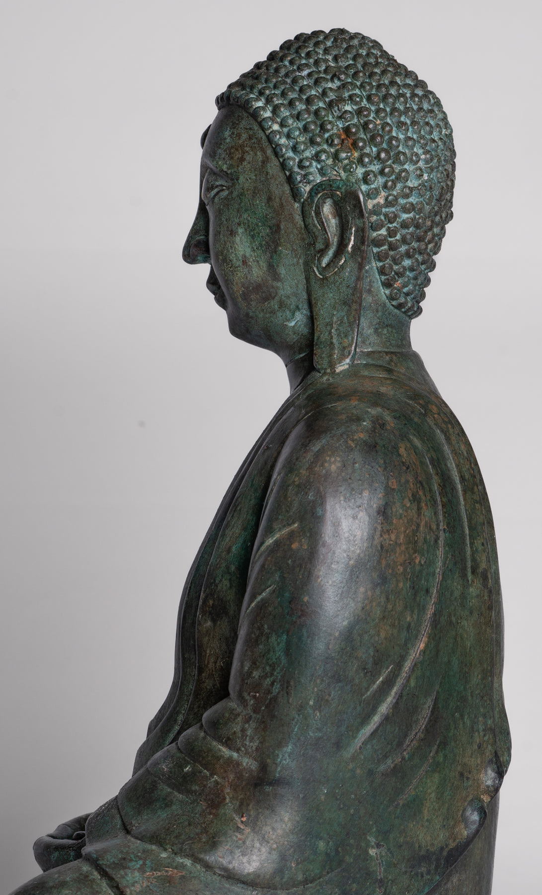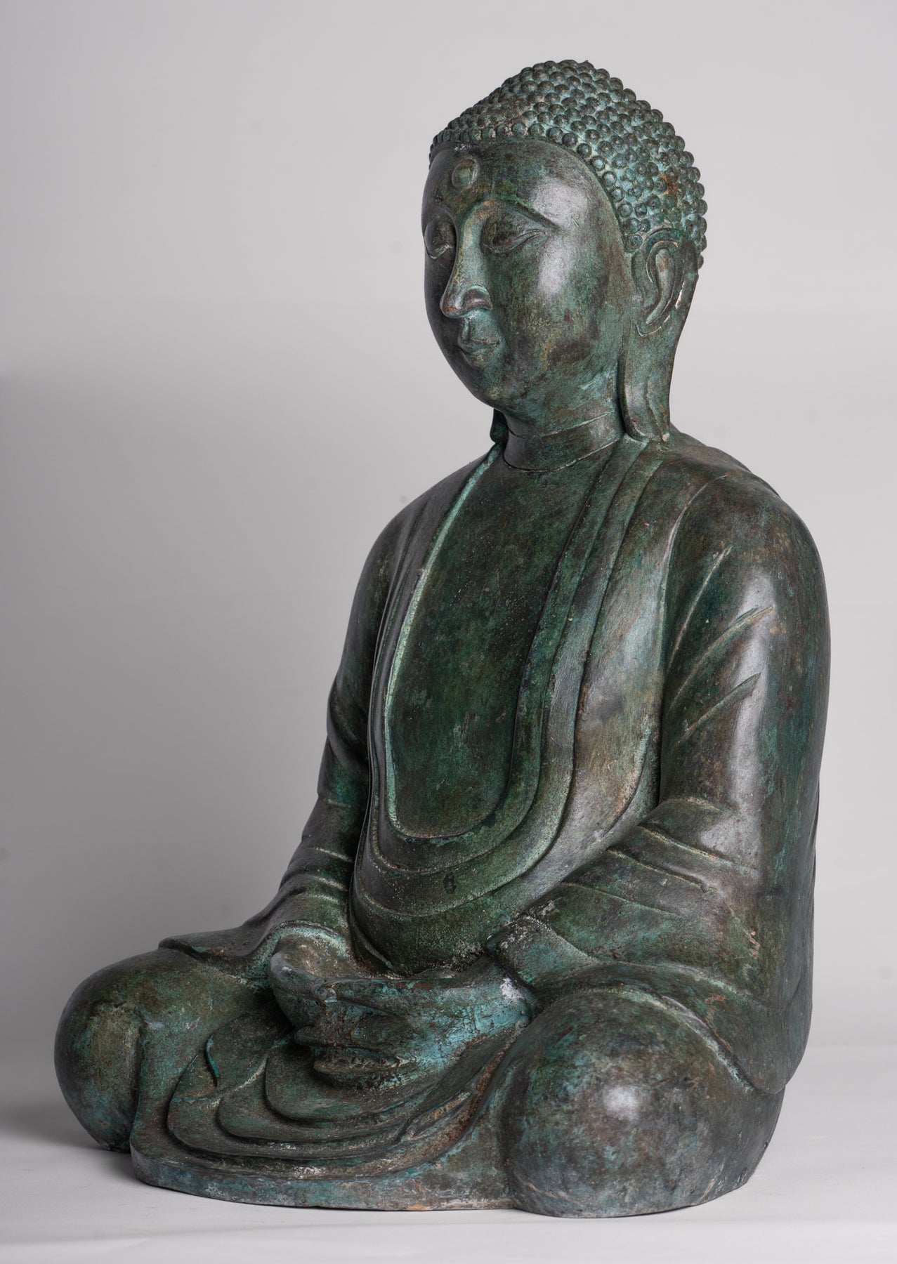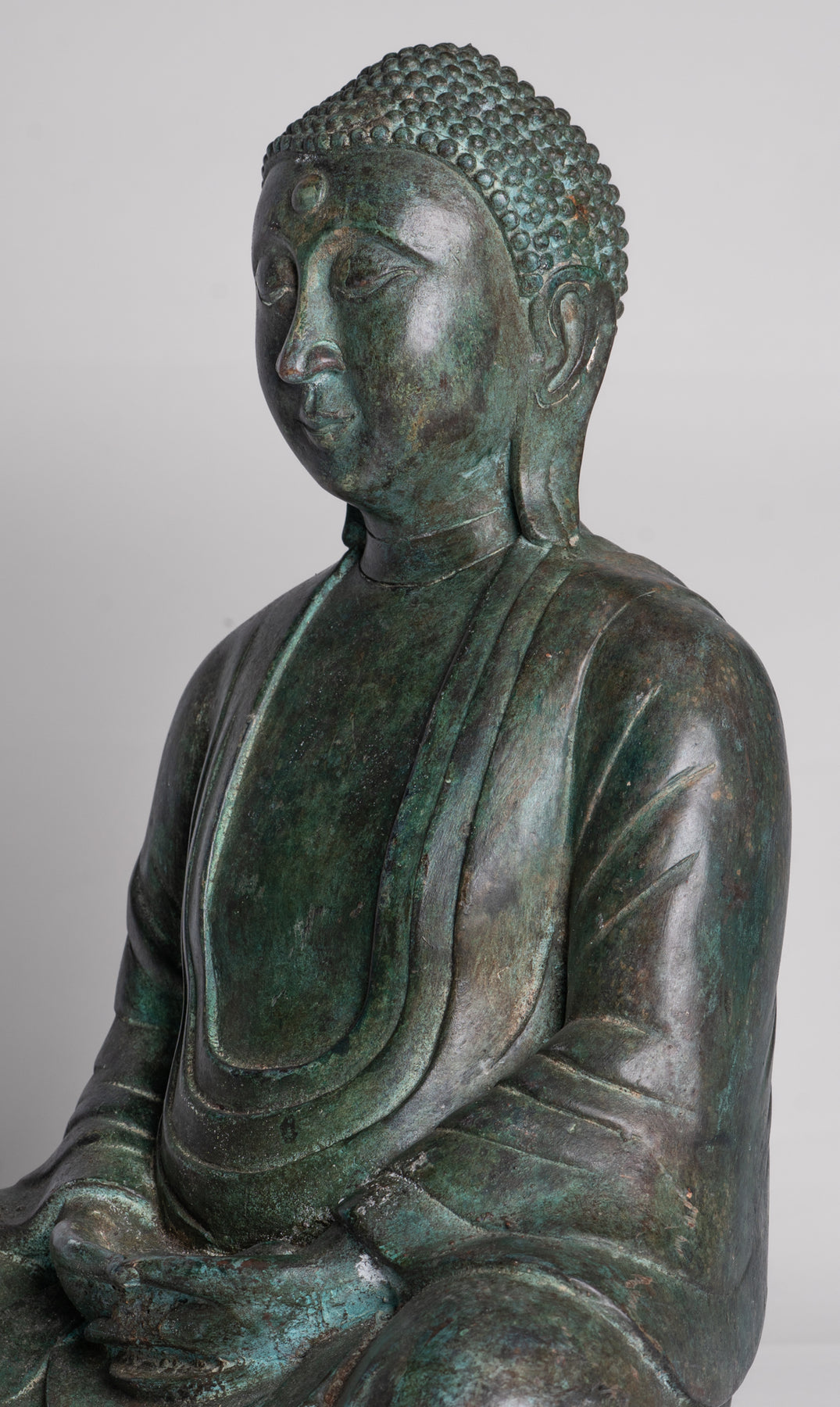 Wie es die traditionelle Ikonographie vorschreibt, wird der Buddha darin sitzend dargestellt Dhyana Mudra, auch bekannt als Meditation oder Samadhi Mudra. Beide Hände liegen anmutig in seinem Schoß, die rechte Hand liegt auf der linken Daumen berühren sich leicht ein perfektes Dreieck zu bilden – ein altes Symbol dafür Gleichgewicht, Konzentration und Einheit von Körper, Geist und Seele. Sein Rücken ist aufrecht, seine Schultern sanft nach hinten gezogen und sein Blick sanft gesenkt, was die zeitlose Haltung eines Menschen einfängt, der in tiefe Kontemplation versunken ist.