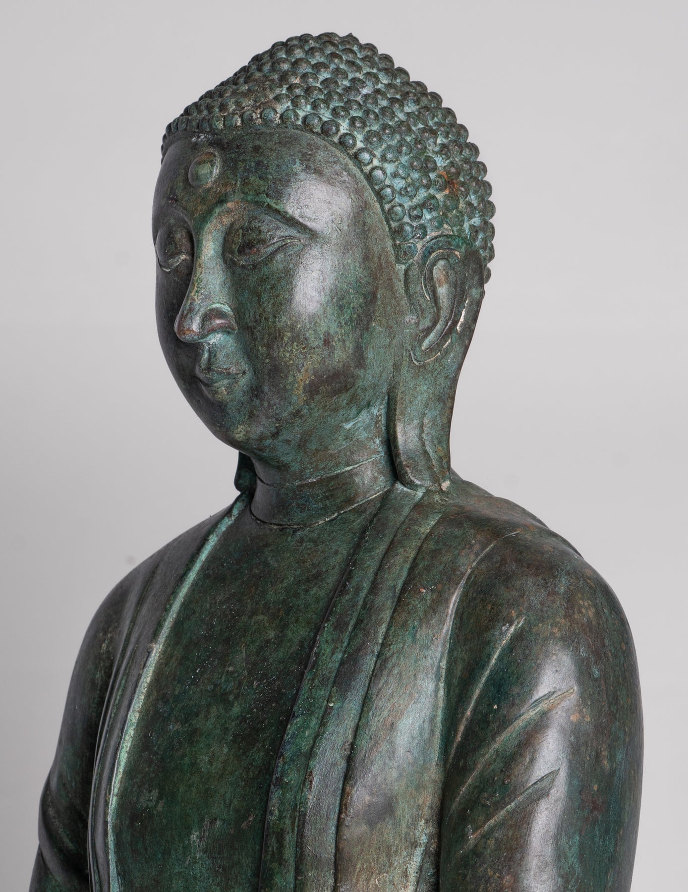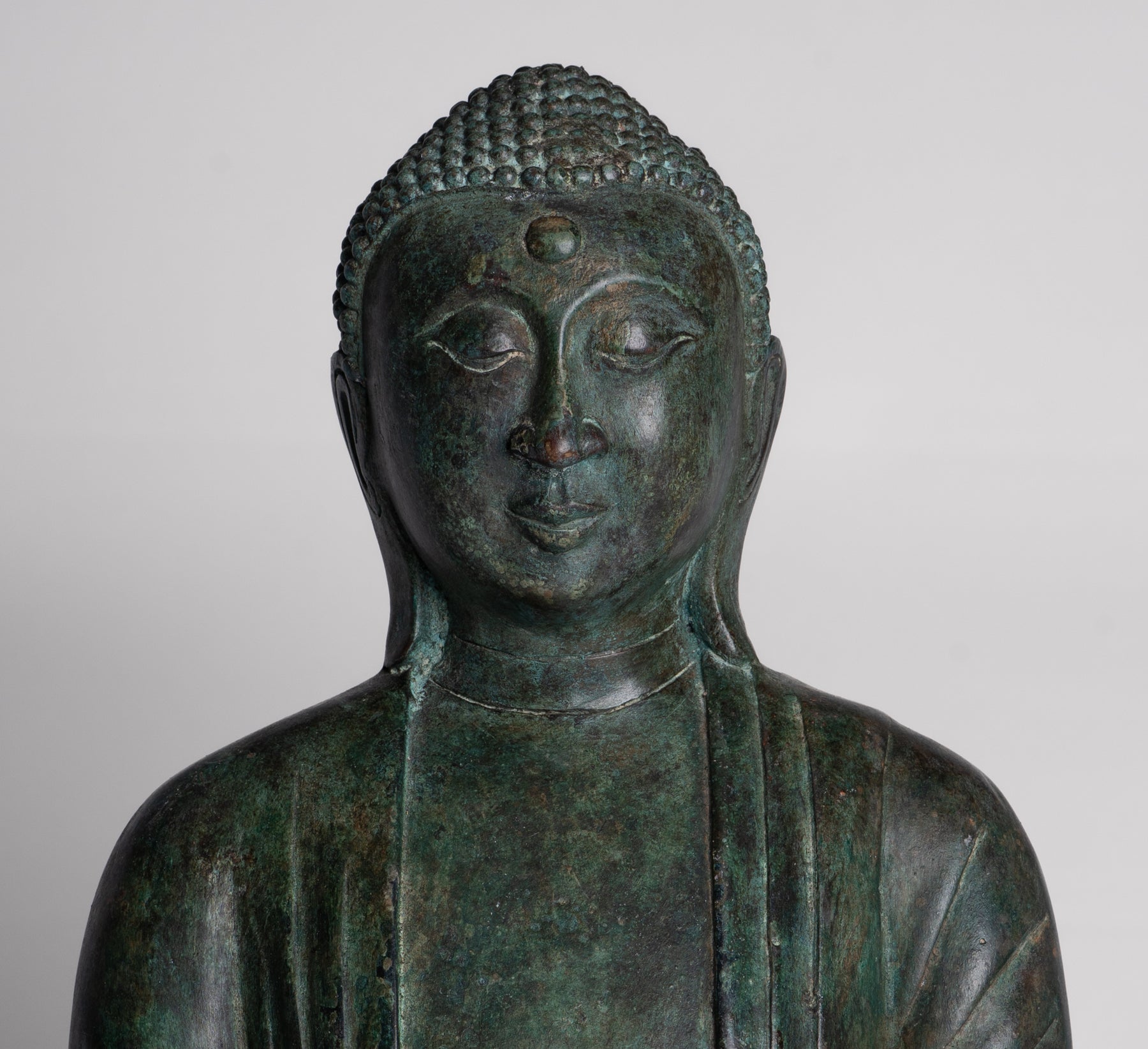 Die Gesichtsausdruck Dieser Buddha ist bemerkenswert sanft und introspektiv halbgeschlossene Augen vermittelt meditative Ruhe und Erleuchtung. Ein schwaches Lächeln mildert seine Gesichtszüge, während ein langes, verlängerte Ohrläppchen Erinnern Sie sich an seine fürstliche Herkunft und seinen Verzicht auf das weltliche Leben. Die urnaDas zart auf der Stirn platzierte dritte Auge symbolisiert transzendentale Einsicht – die Fähigkeit des Buddha, über die materielle Welt des Leidens hinauszuschauen.