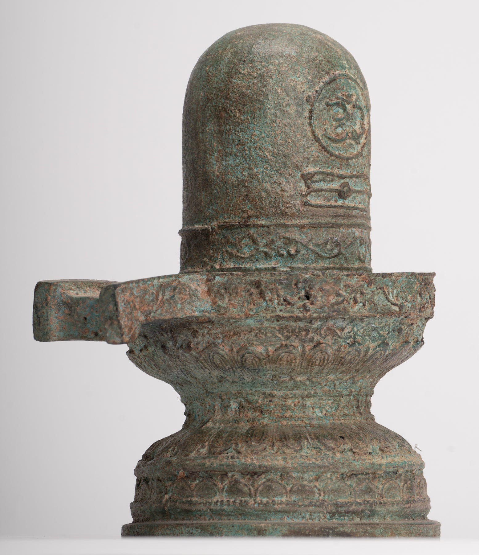 Die Oberfläche des Linga ziert das Om-Symbol, die Urschwingung und heilige Silbe der hinduistischen Tradition. Om verkörpert die Essenz des höchsten Bewusstseins– der Klang, von dem alles Dasein ausgeht und zu dem es letztendlich zurückkehrt. Seine Einbeziehung verstärkt die spirituelle Kraft und kontemplative Präsenz der Skulptur.
