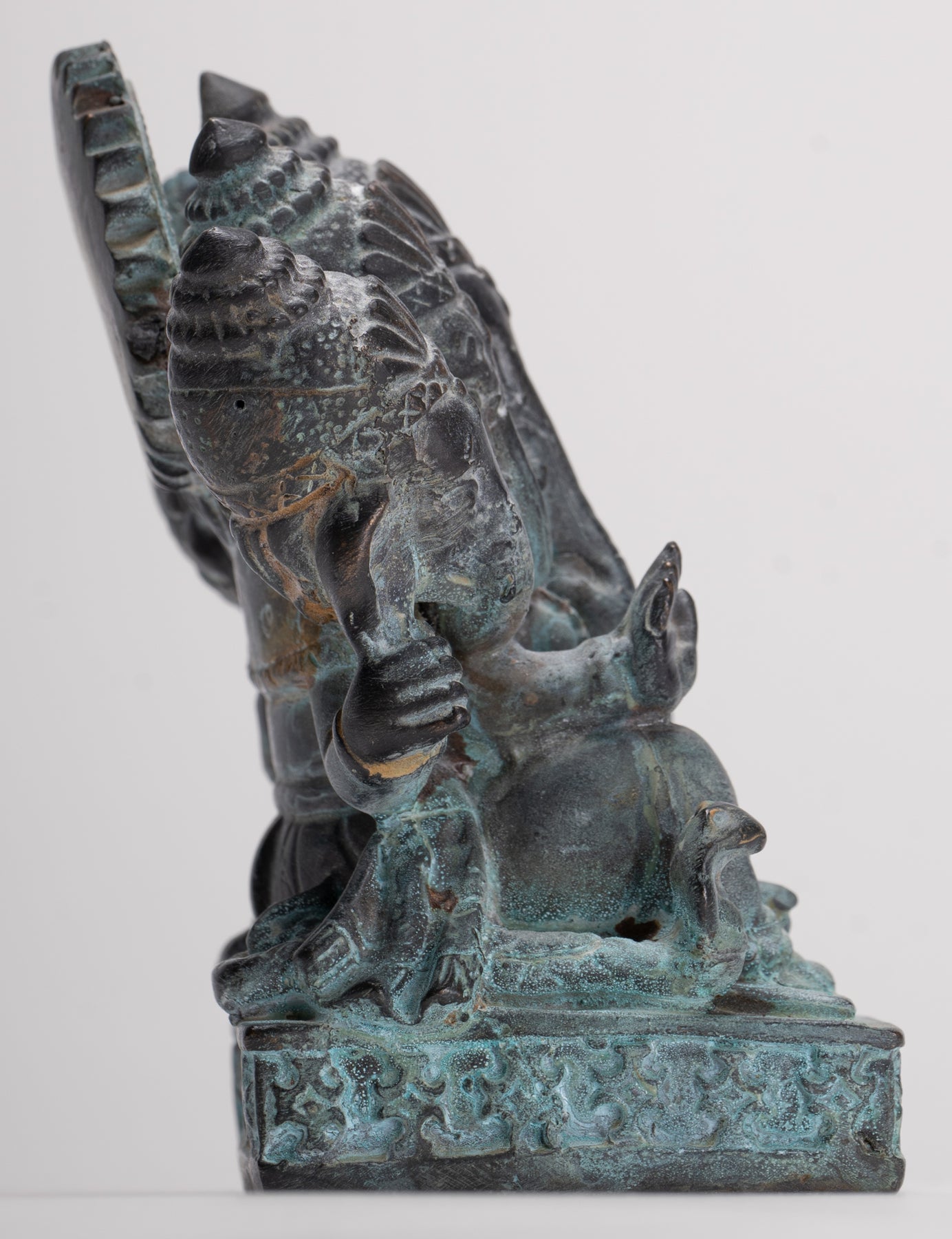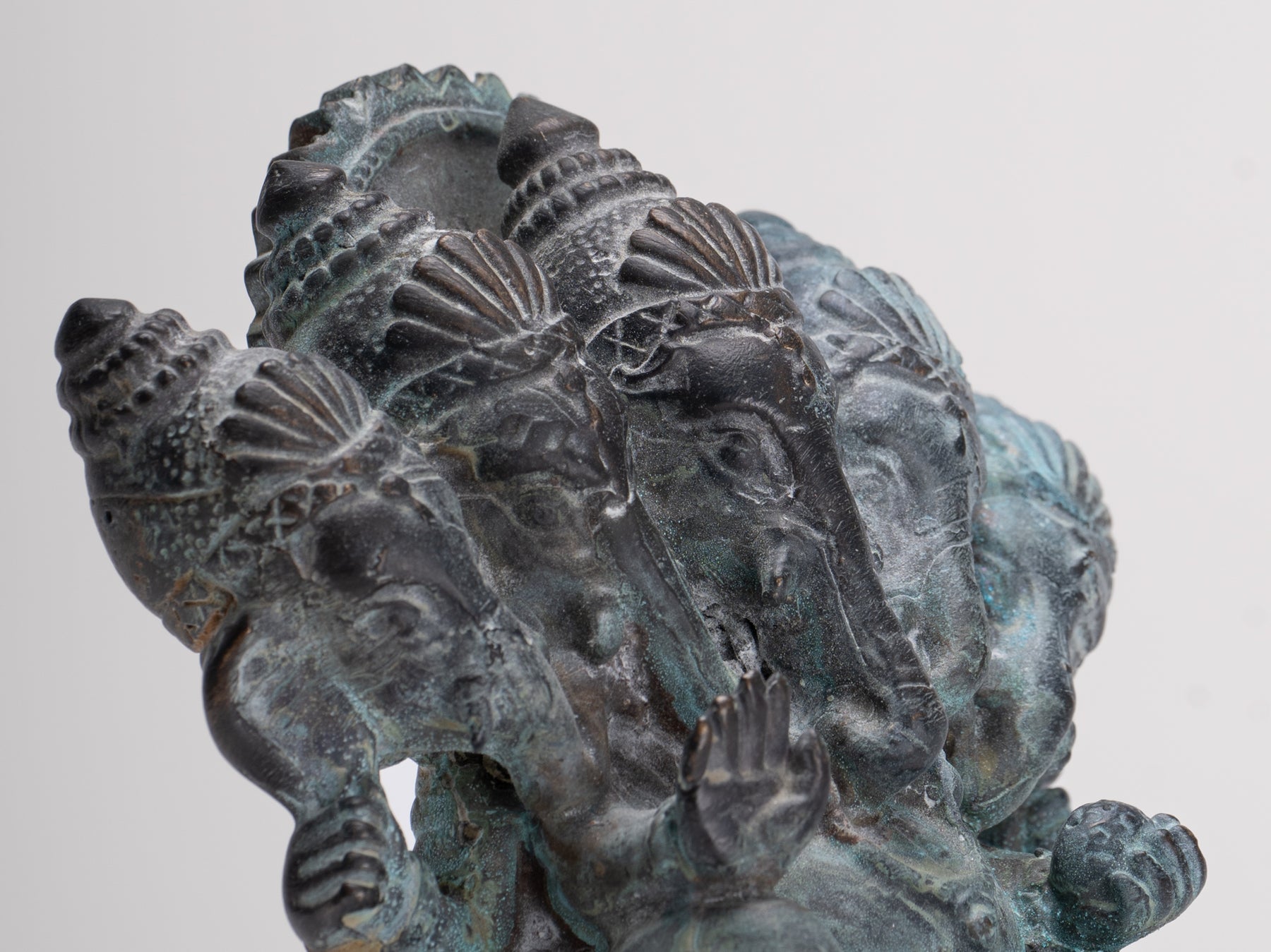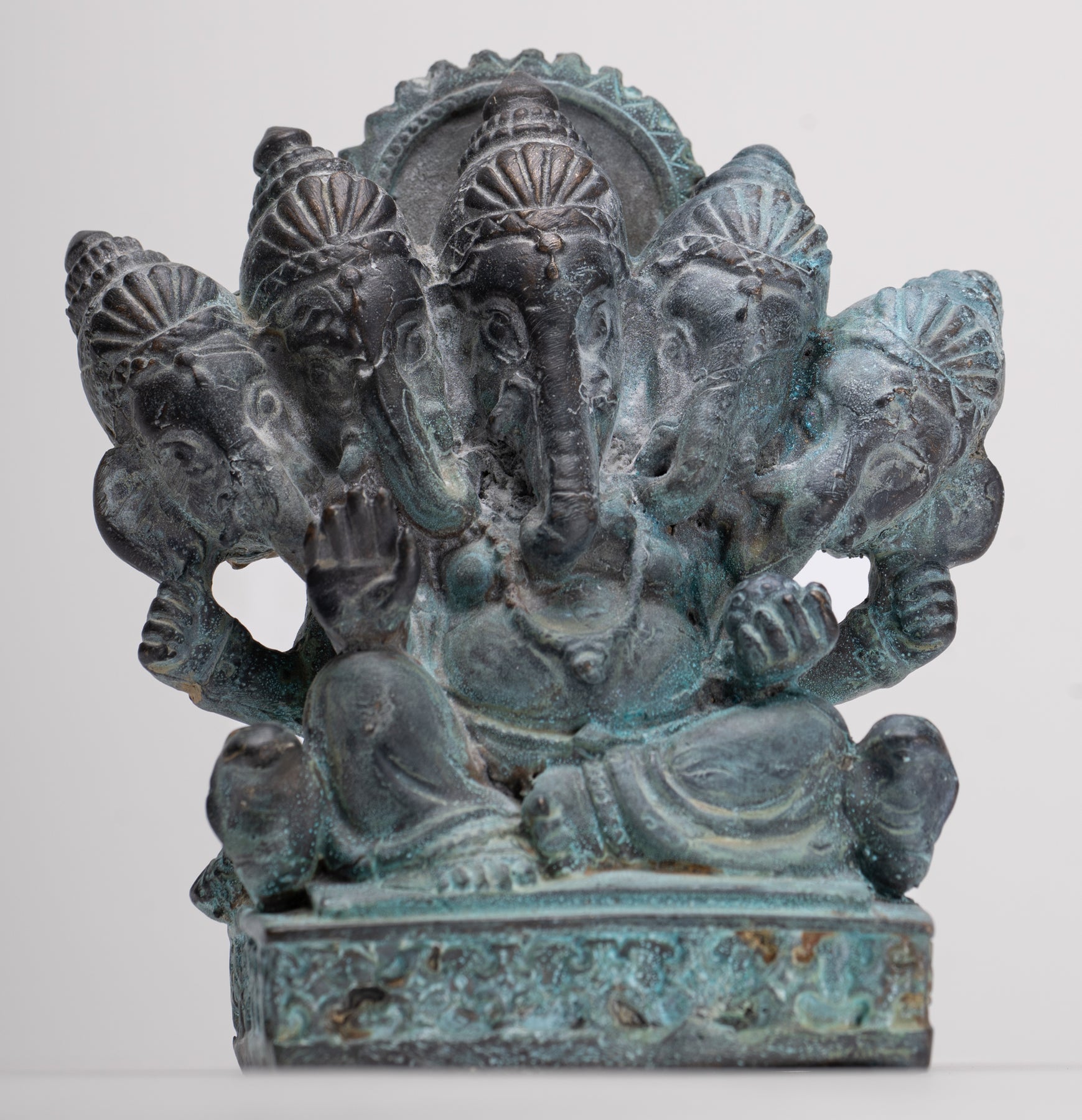 An exquisite antique Thai-style bronze seated Heramba Ganesha, beautifully crafted with intricate details and a rich, aged patina of malachite and azurite hues.