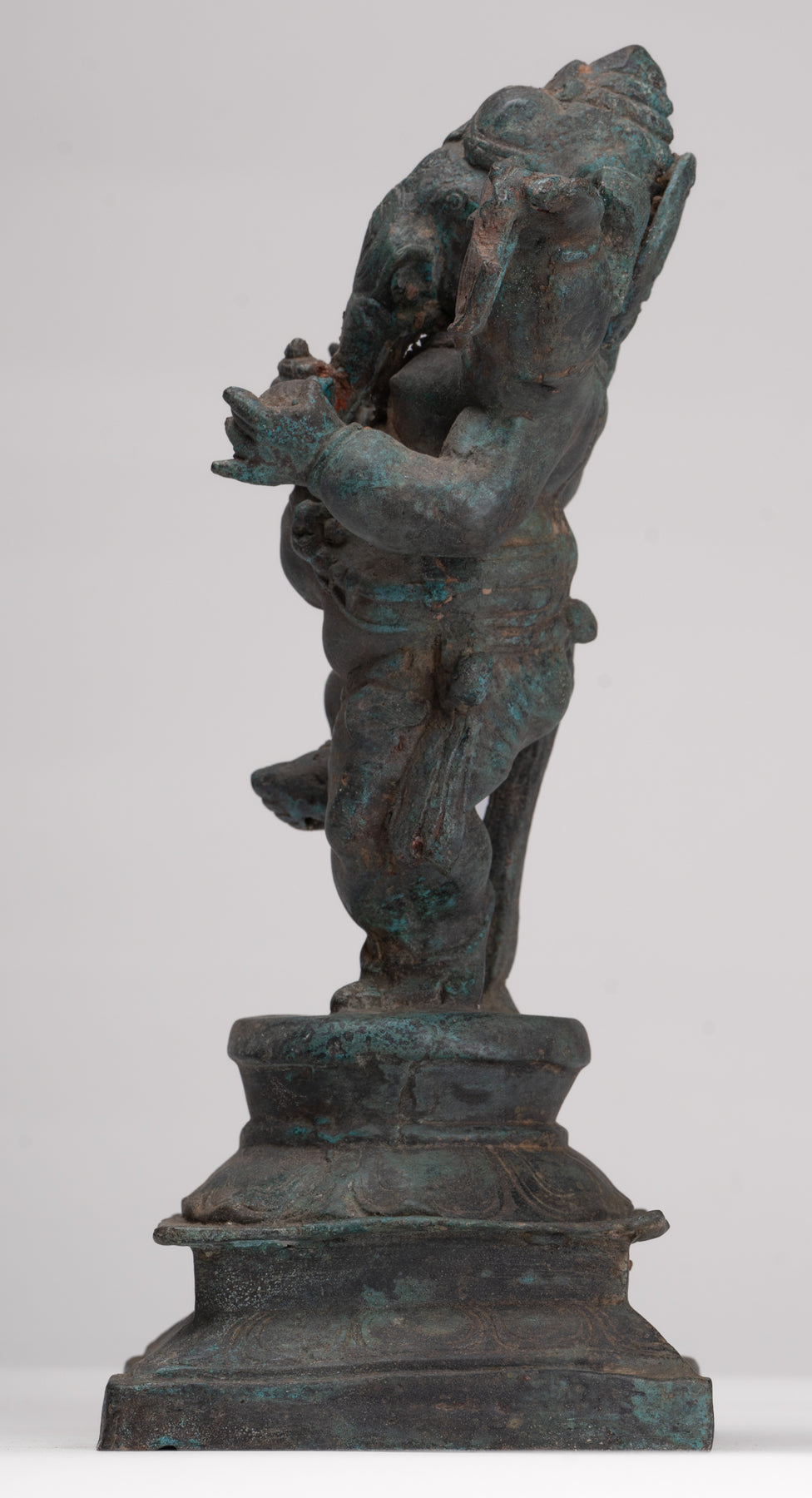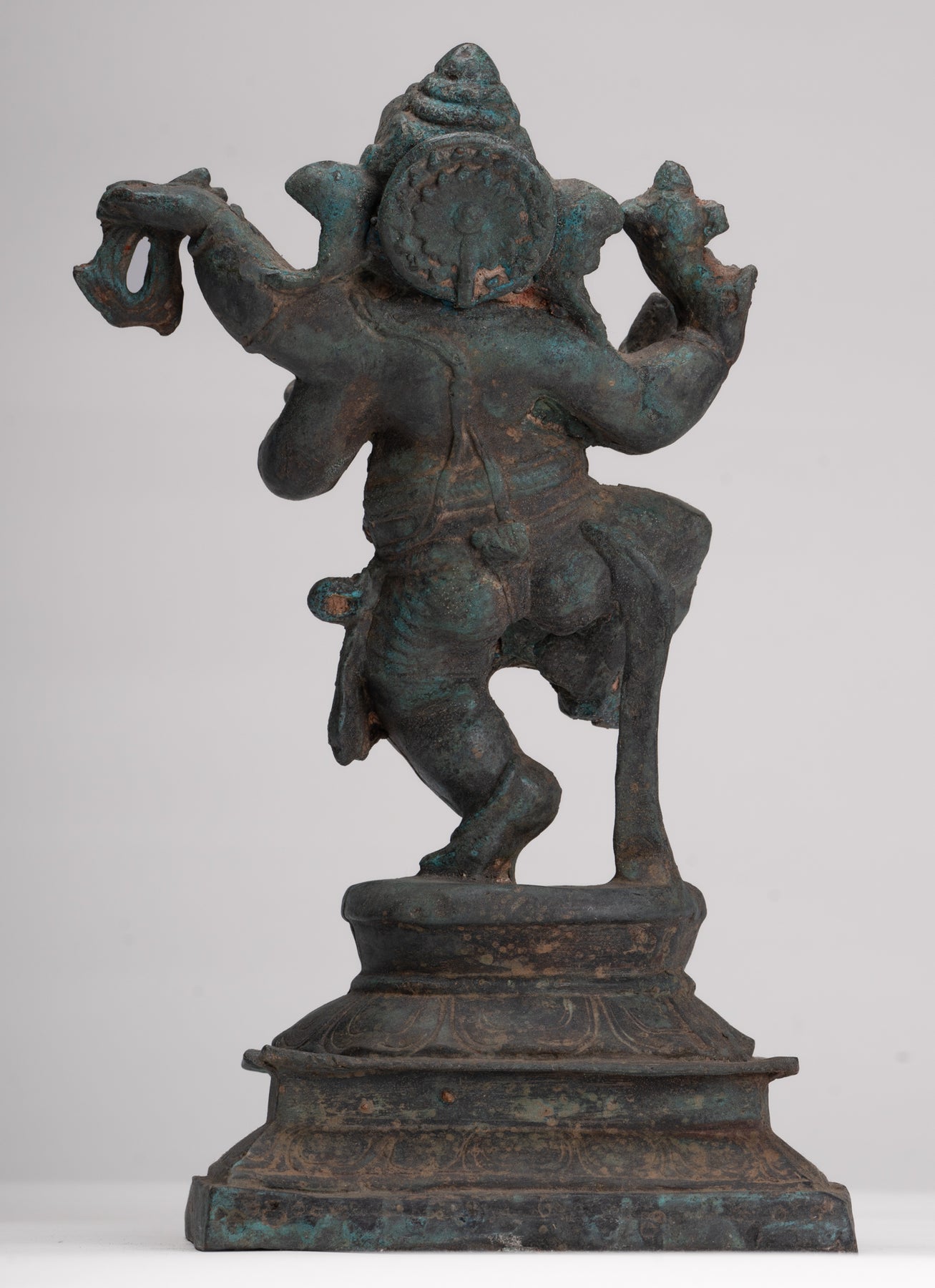 The distinctive patina of the piece is particularly delightful. Ganesha is the elephant headed son of Shiva. He holds his broken tusk in one hand, conch shell, laddus or sweetmeats and a noose in his other hands.