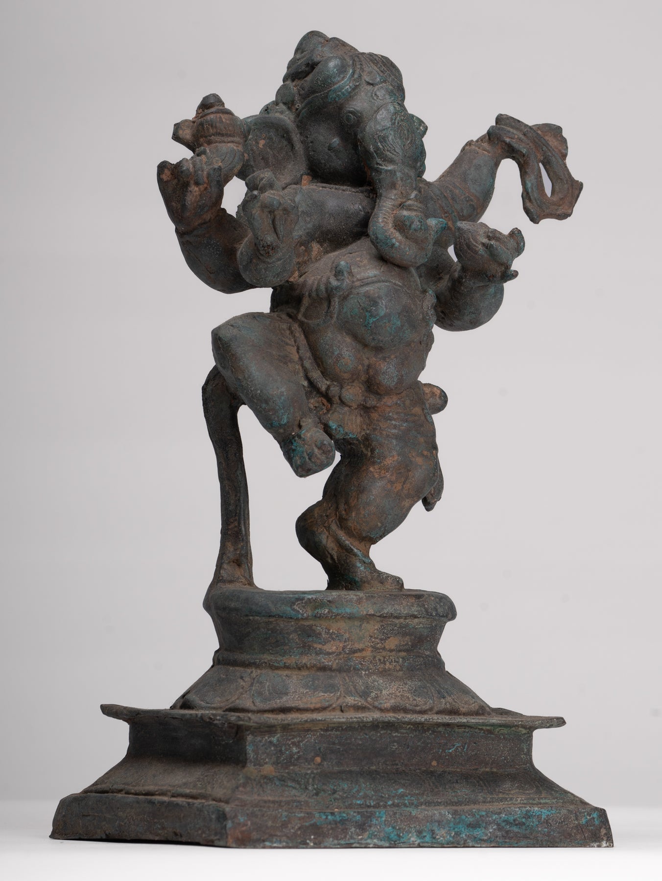 An expressively cast Antique Thai style bronze dancing Ganesha standing over a circular lotus leaf plinth, which is itself set upon a square pedestal. The elephant-headed god is wearing a short dhoti with crossed cloth around his portly waist