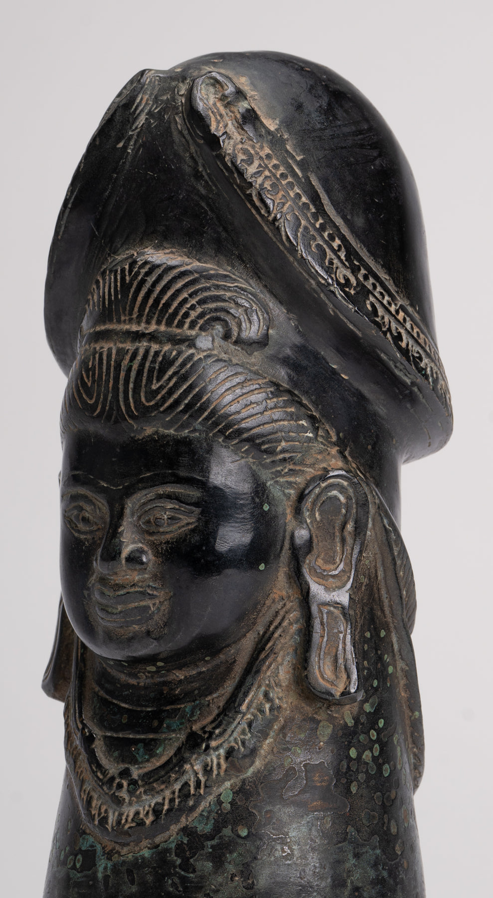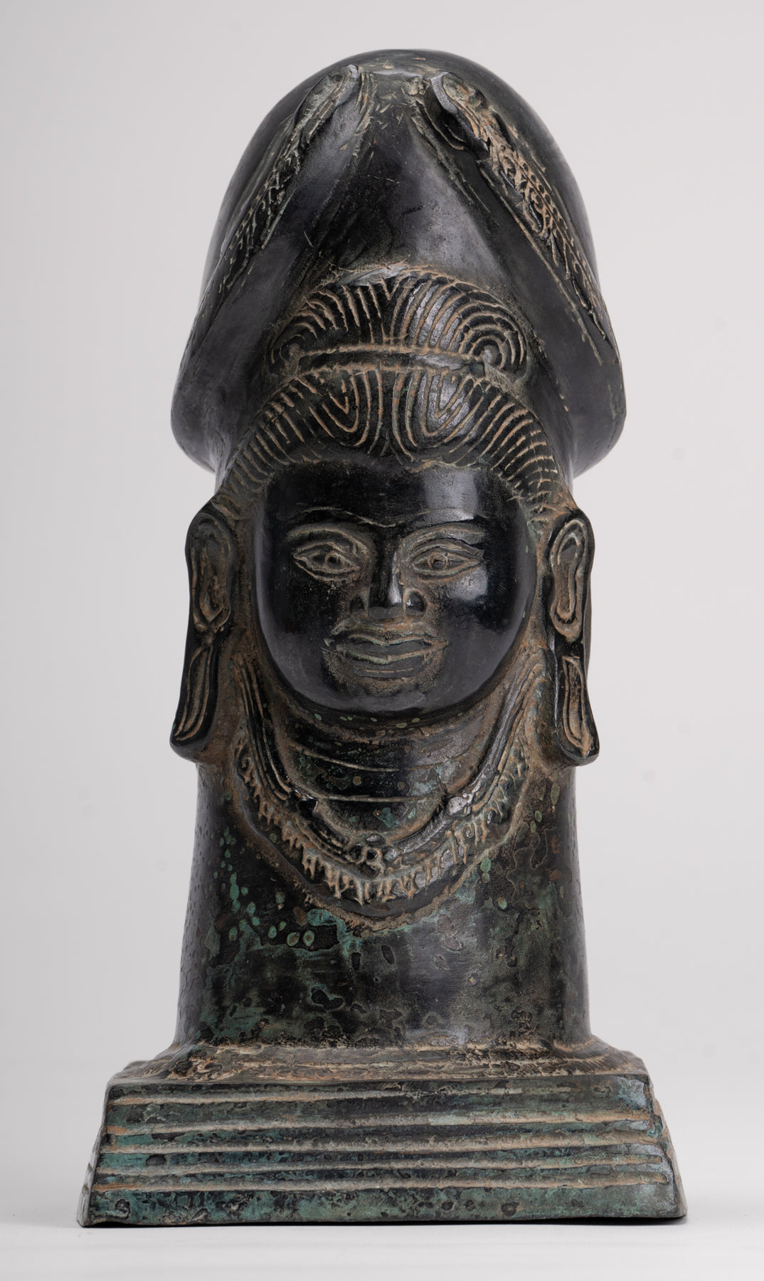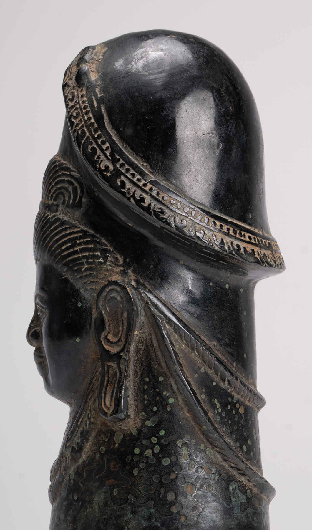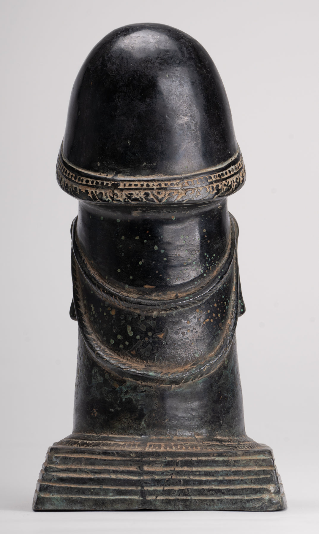 A fine quality antique Khmer style bronze linga showing the face of Shiva. A a symbol of fertility and energy it is an abstract or aniconic representation of the Hindu deity, Shiva. In traditional Indian society, the linga is rather seen as a symbol of the energy and potential of God, Shiva himself.