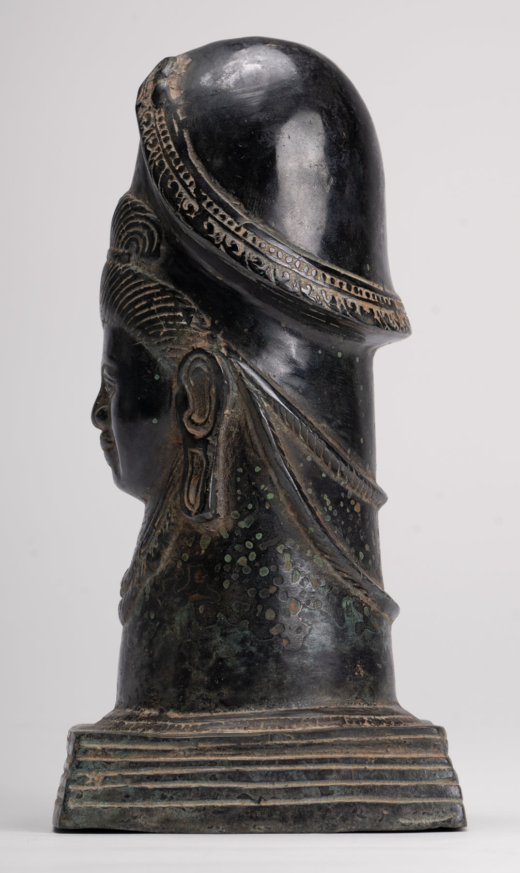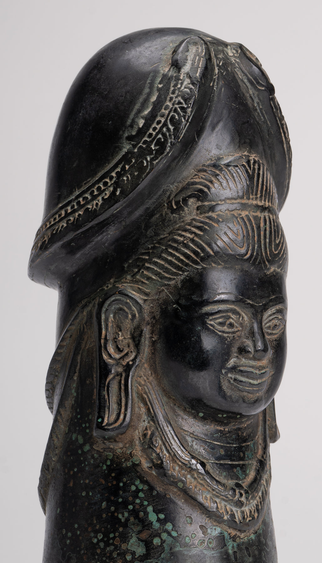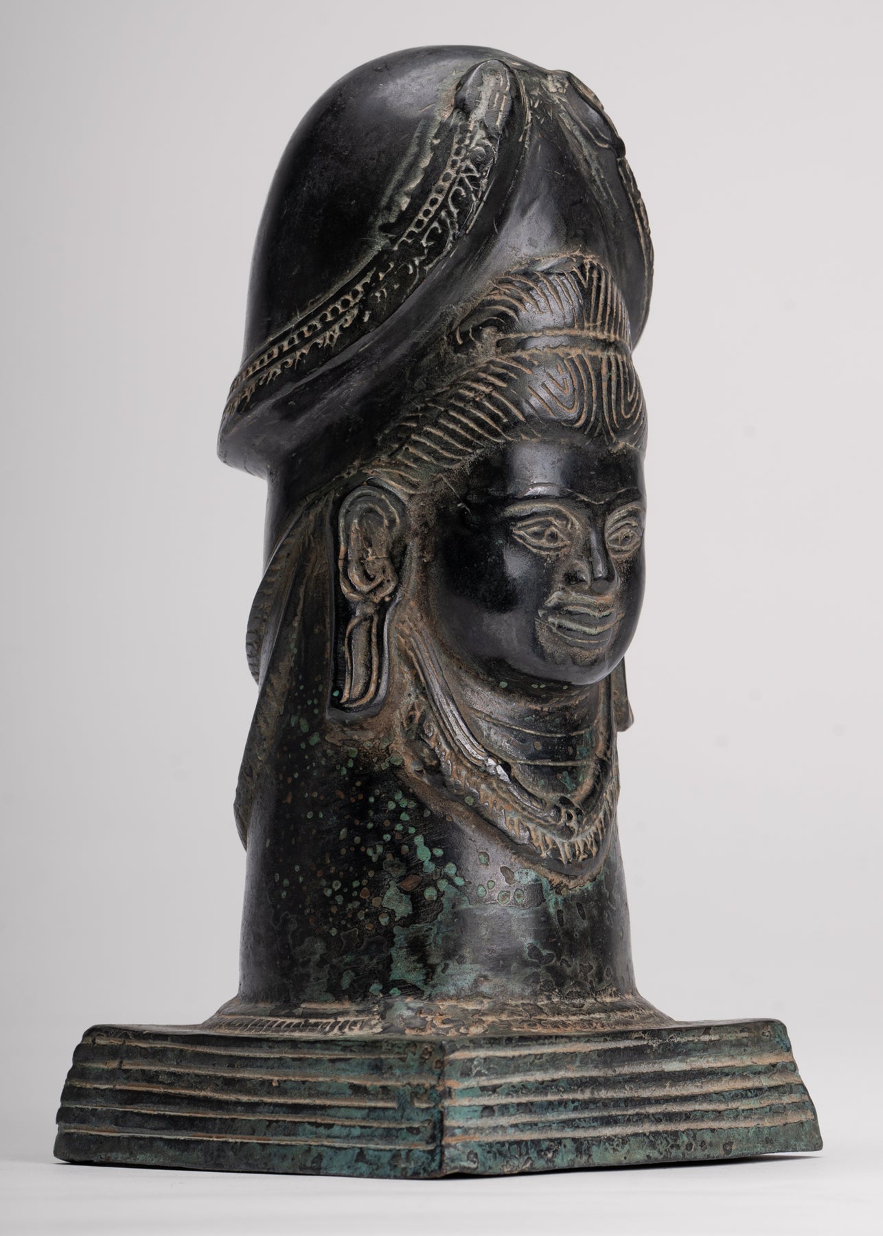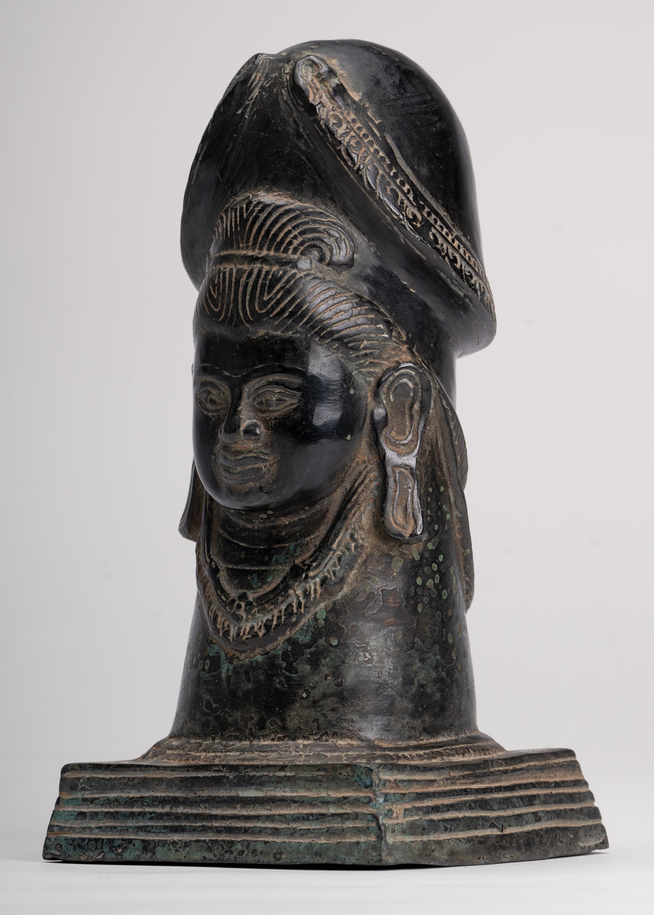 A fine quality antique Khmer style bronze linga showing the face of Shiva. A a symbol of fertility and energy it is an abstract or aniconic representation of the Hindu deity, Shiva. In traditional Indian society, the linga is rather seen as a symbol of the energy and potential of God, Shiva himself.