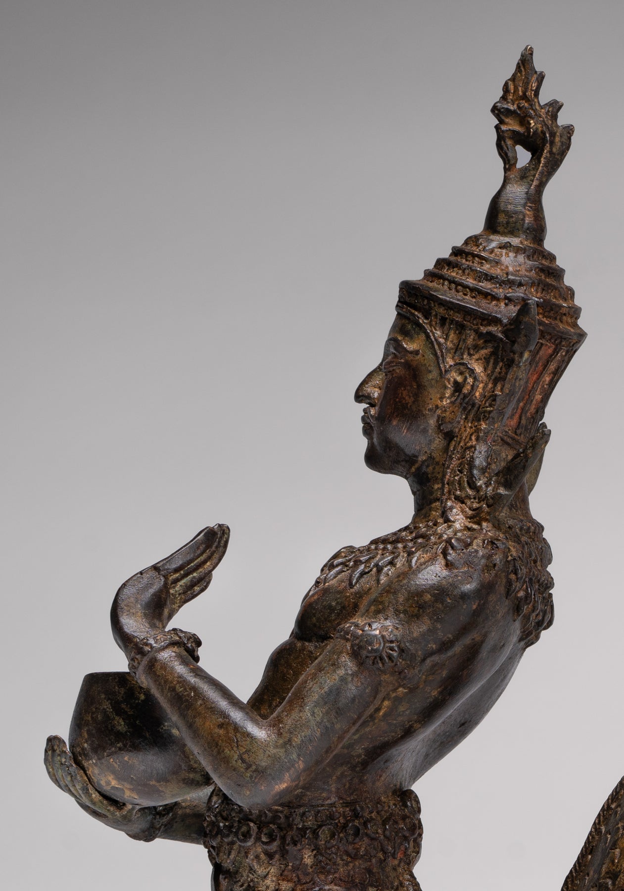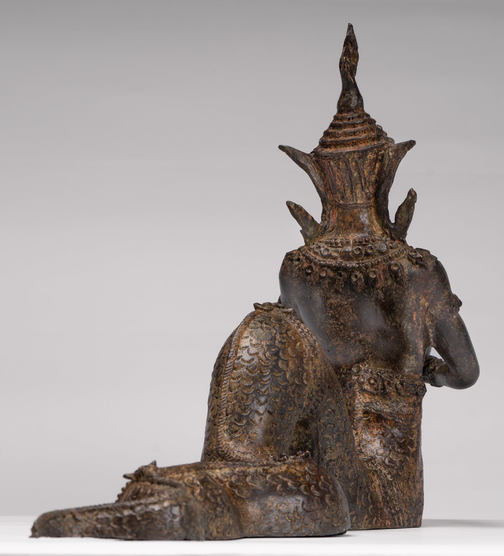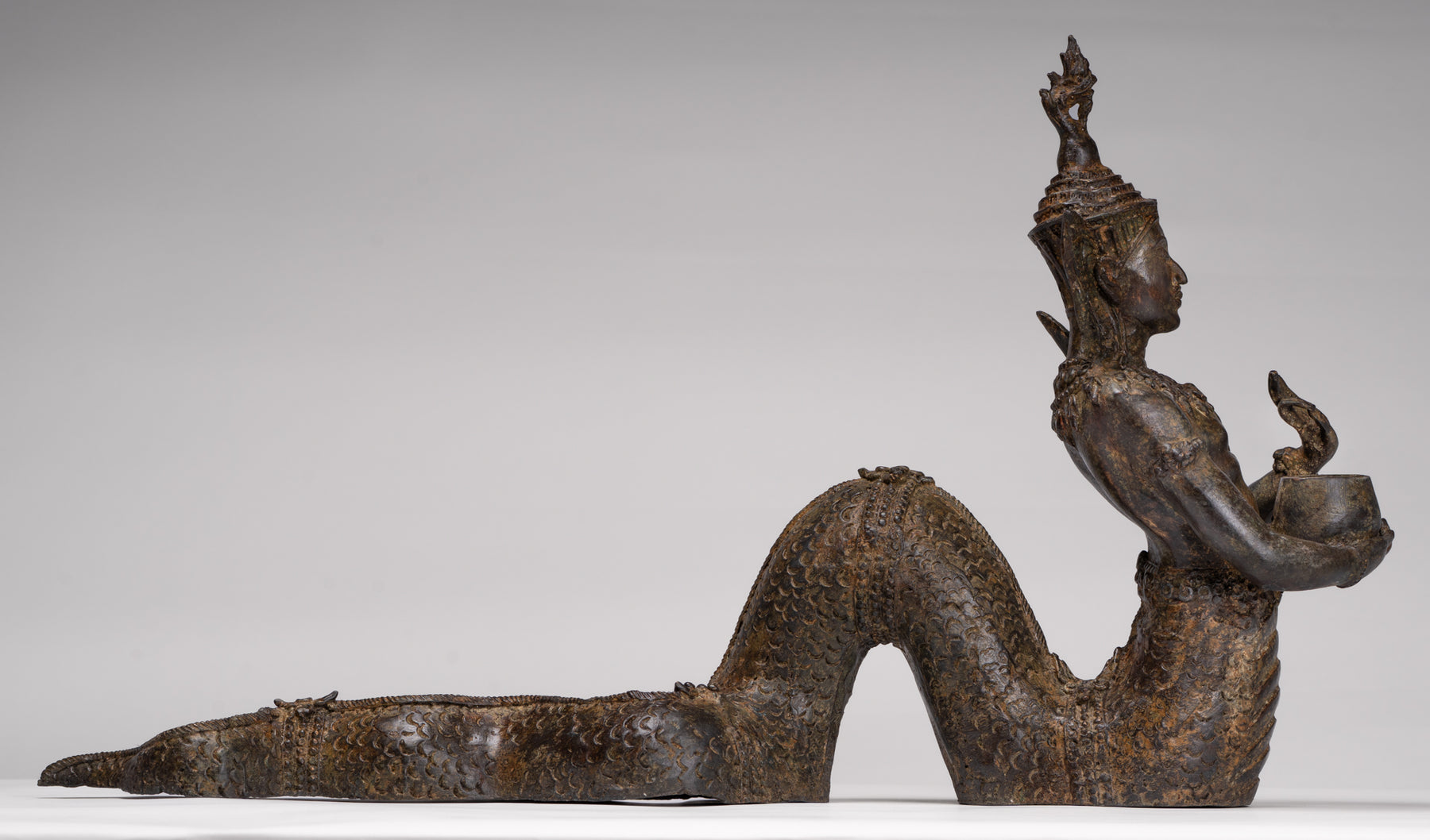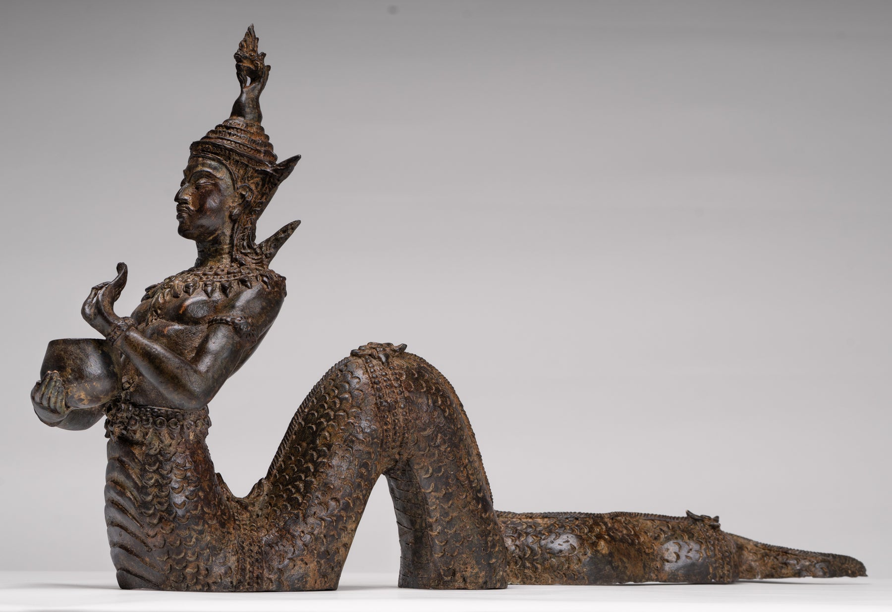 An antique Thai style Naga Prince statue, holding an alms bowl, with a Naga tail.