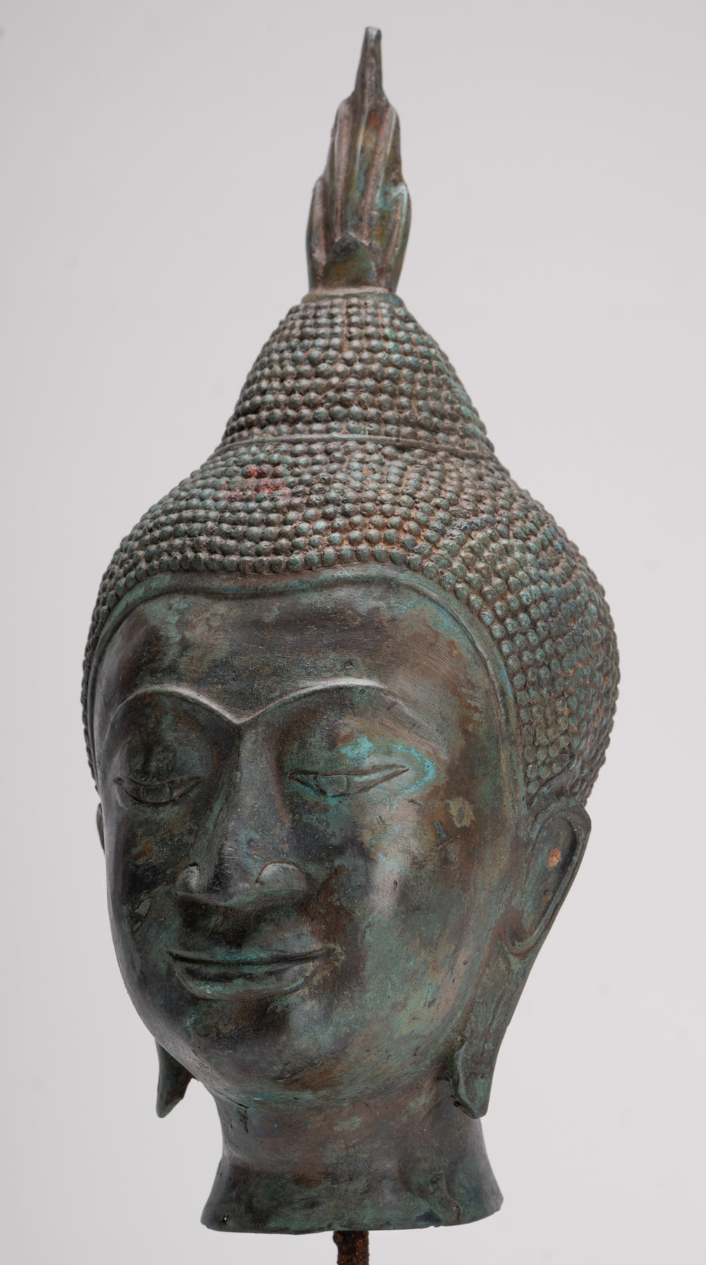 Buddha features a heart shaped face, covered in thorn-like hair curls, surmounted by a flamed 'Ushnisha', in the Sukhothai tradition. The surface has a beautifully aged malachite patina.