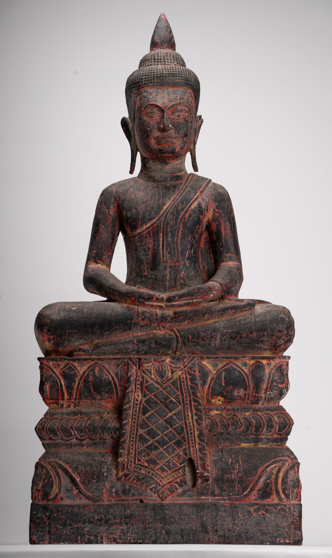 A substantial antique Khmer style seated wooden Buddha from Cambodia. Seated on a large, decorated pedestal.