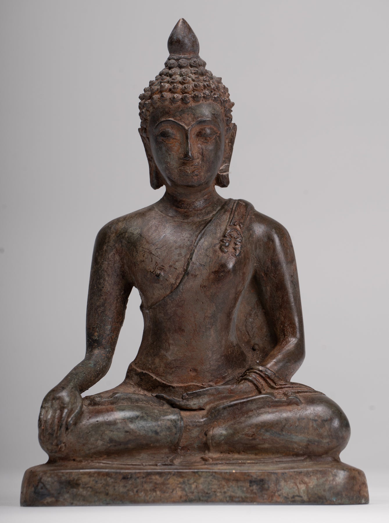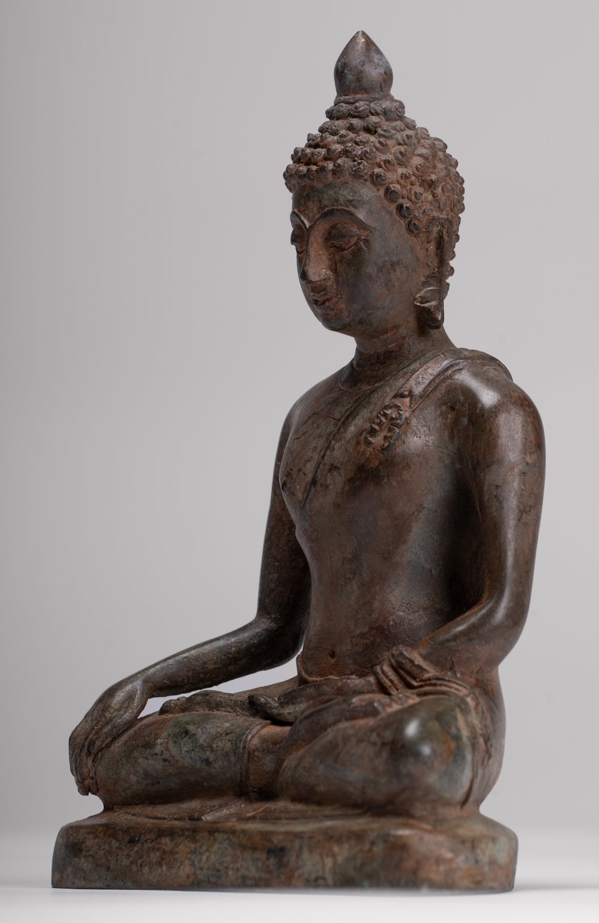 A serene antique Thai style seated bronze Buddha Shakyamuni in Chiang Saen style.