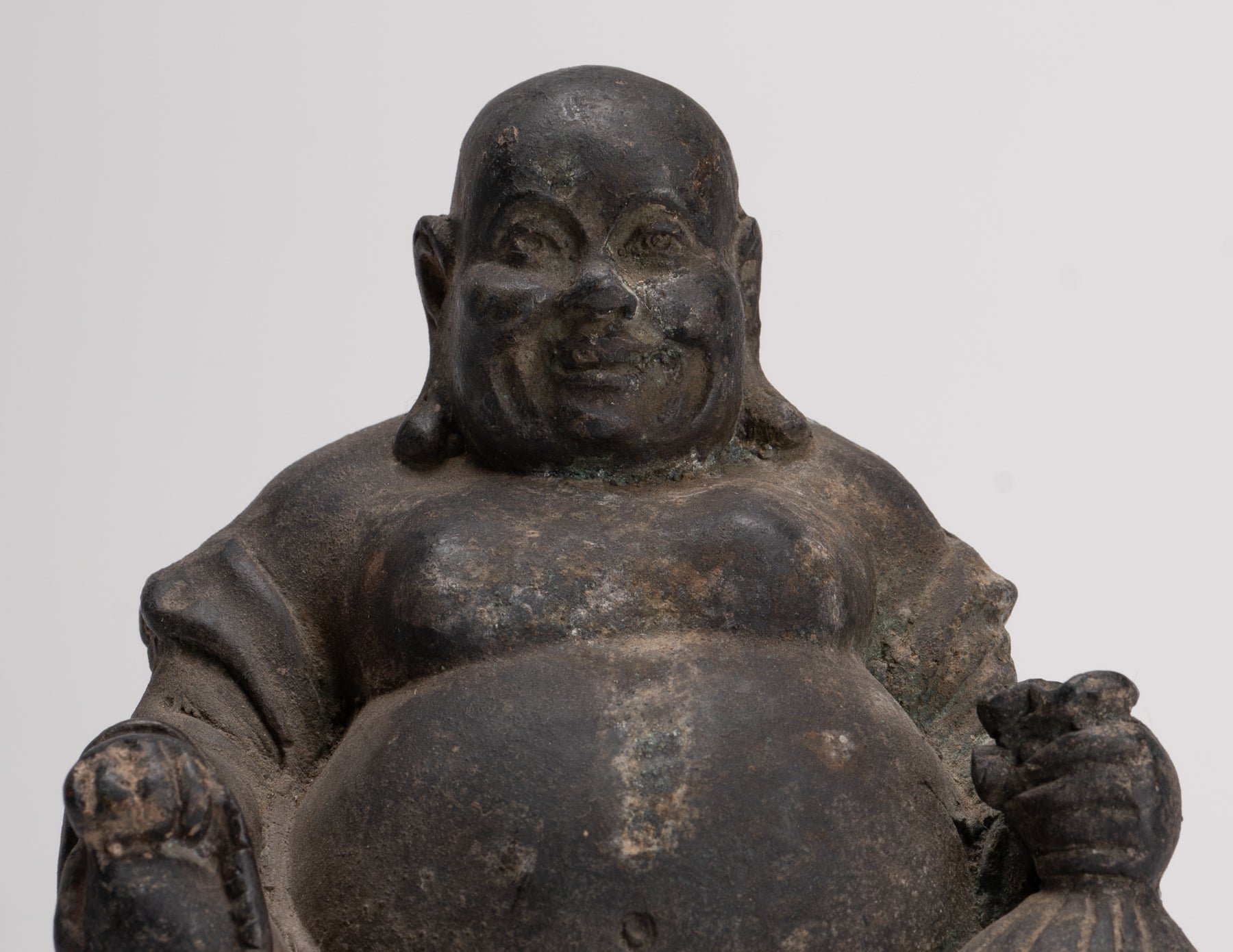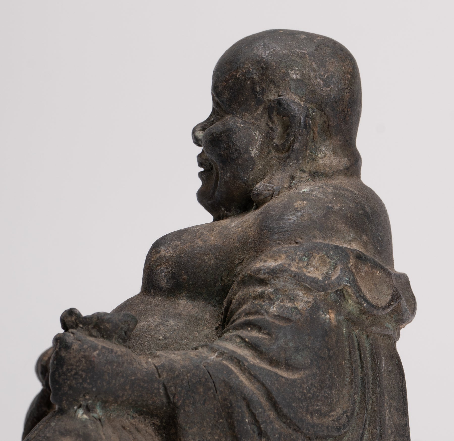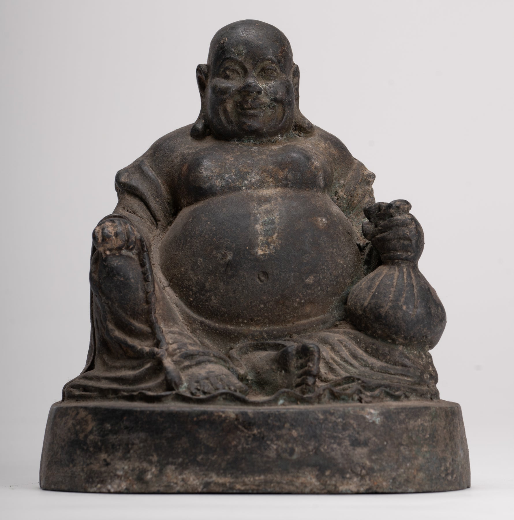 An antique Chinese style bronze Laughing Buddha or Budai. The Buddha has a peaceful countenance with downcast introspective eyes and a firm brow. His earlobes are stretched long from a youth spent as a prince wearing heavy gold earrings.