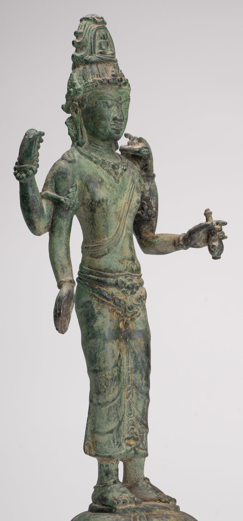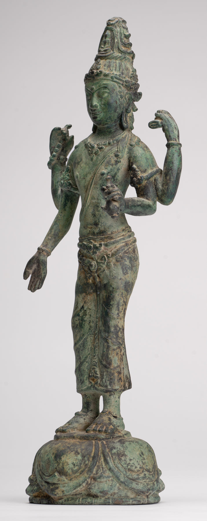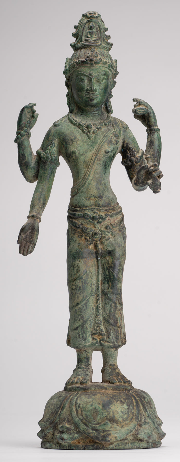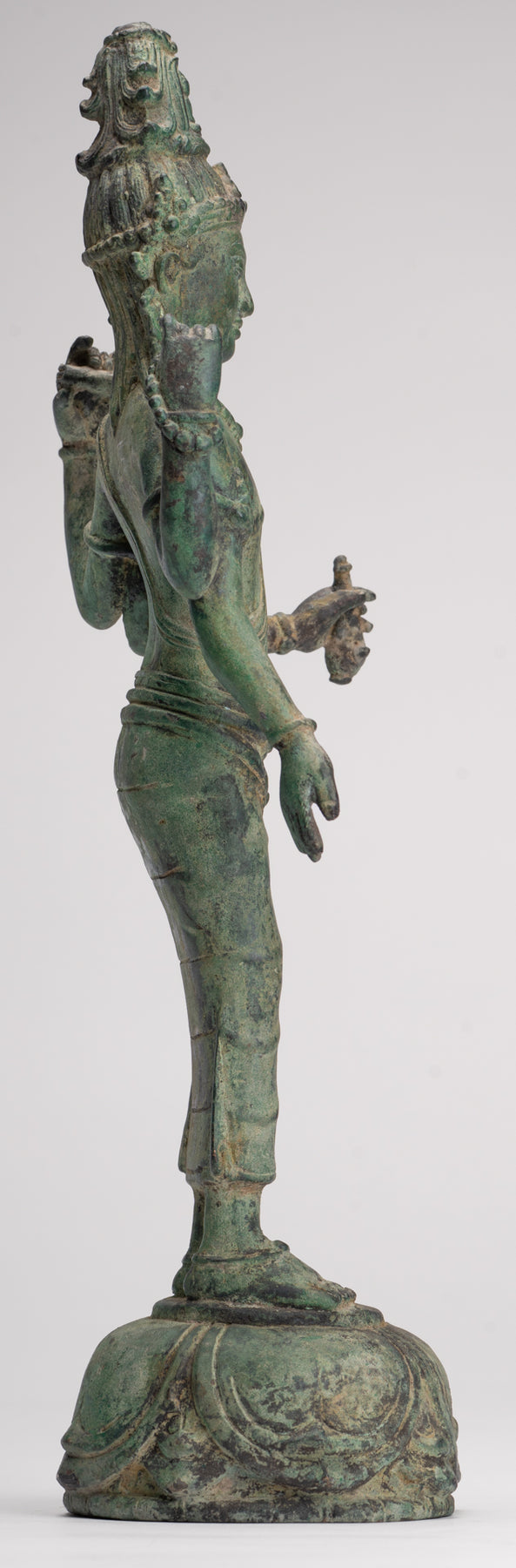Lokeshvara is stood samabhanga on a simple lotus flower pedestal. The lotus flower represents purity, compassion and the giving of great joy to all.