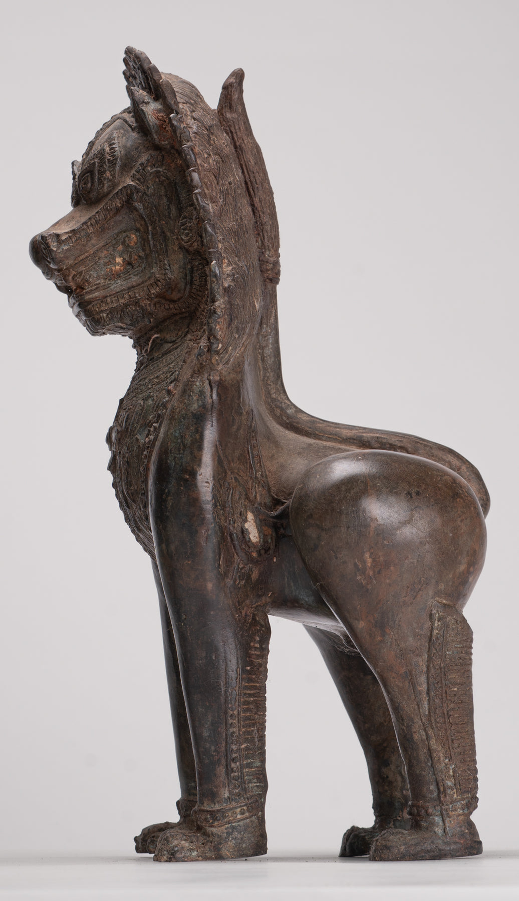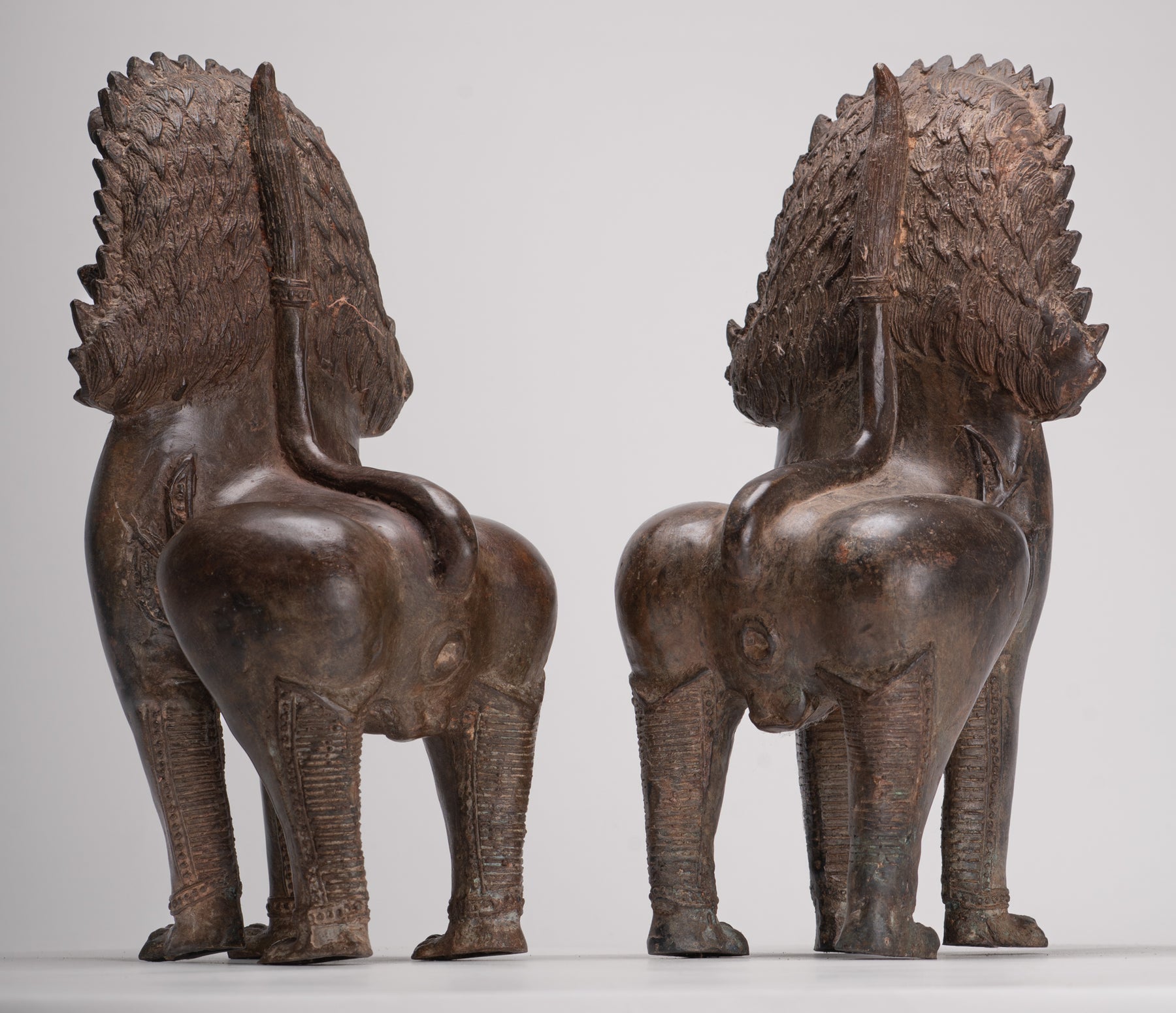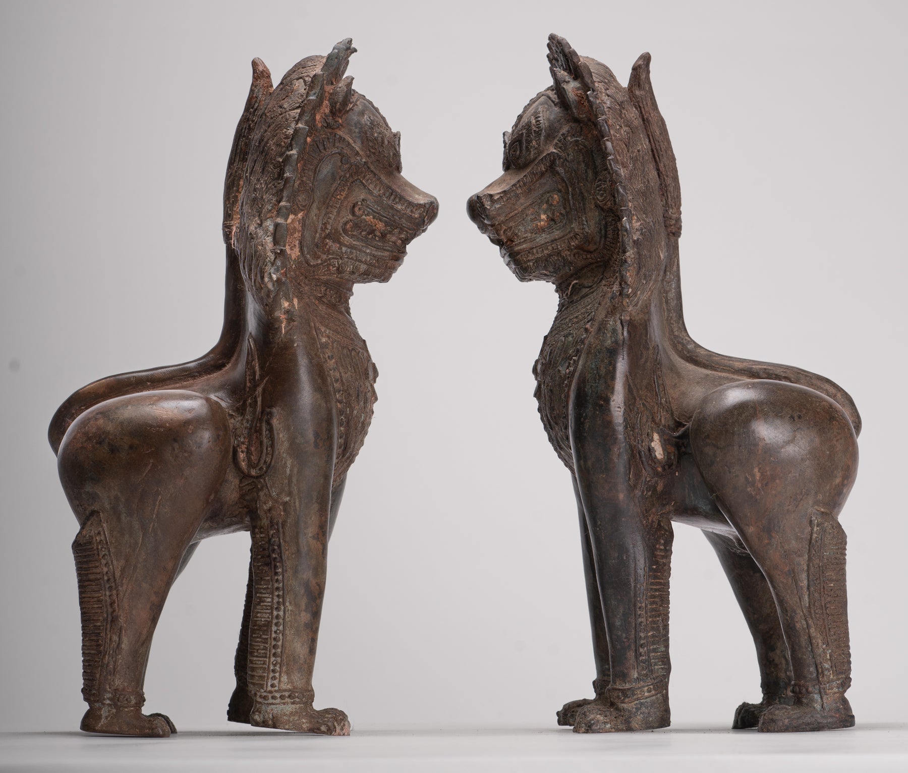 Temple Lion - Antique Thai Style Bronze Standing Singha Temple Guardians or Lions - 31cm/12" (Pair)