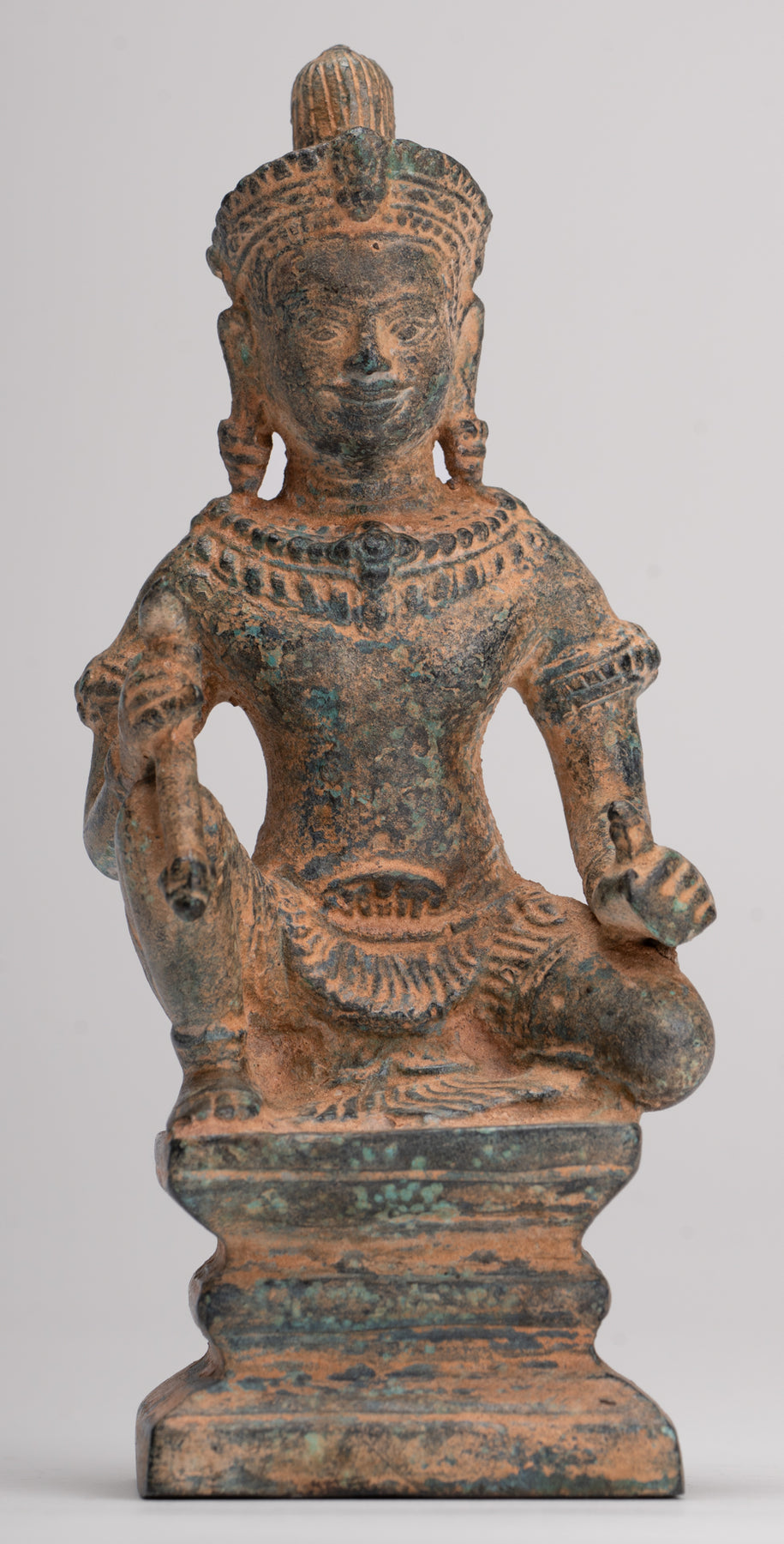 This lovely bronze sculpture shows a male deity (probably Vishnu) seated panhandle. He is clothed in a pleated sampot can kpin, in the Koh Ker style, with a bow behind that has been naturalistically represented to accommodate the kneeling pose. The artist's ingenuity is particularly noticeable in the way the left foot is shown sideways at the back.