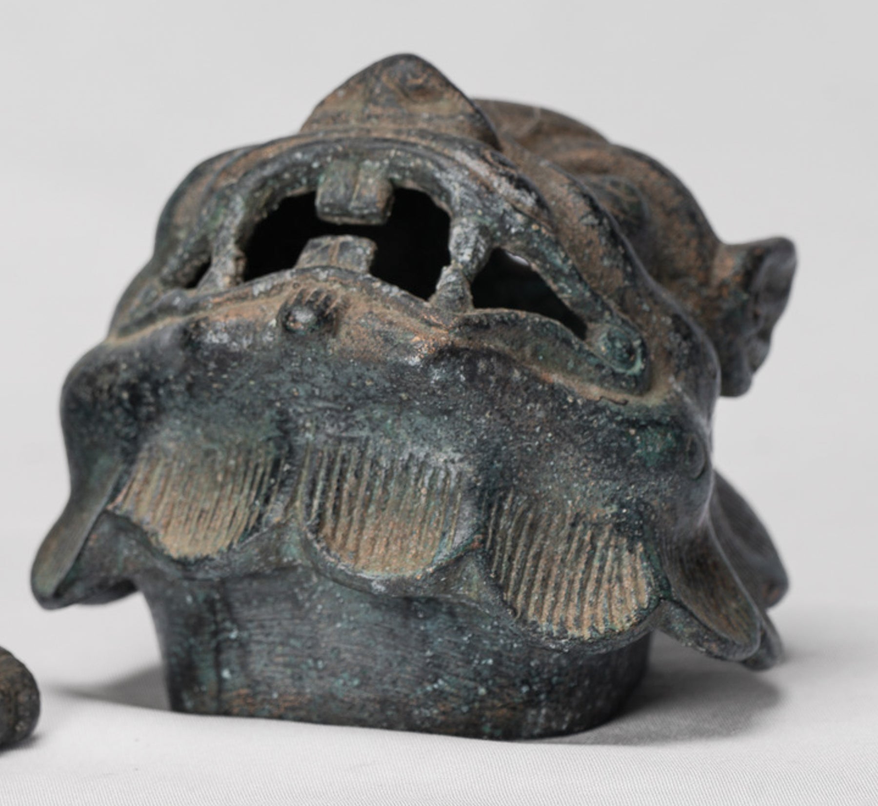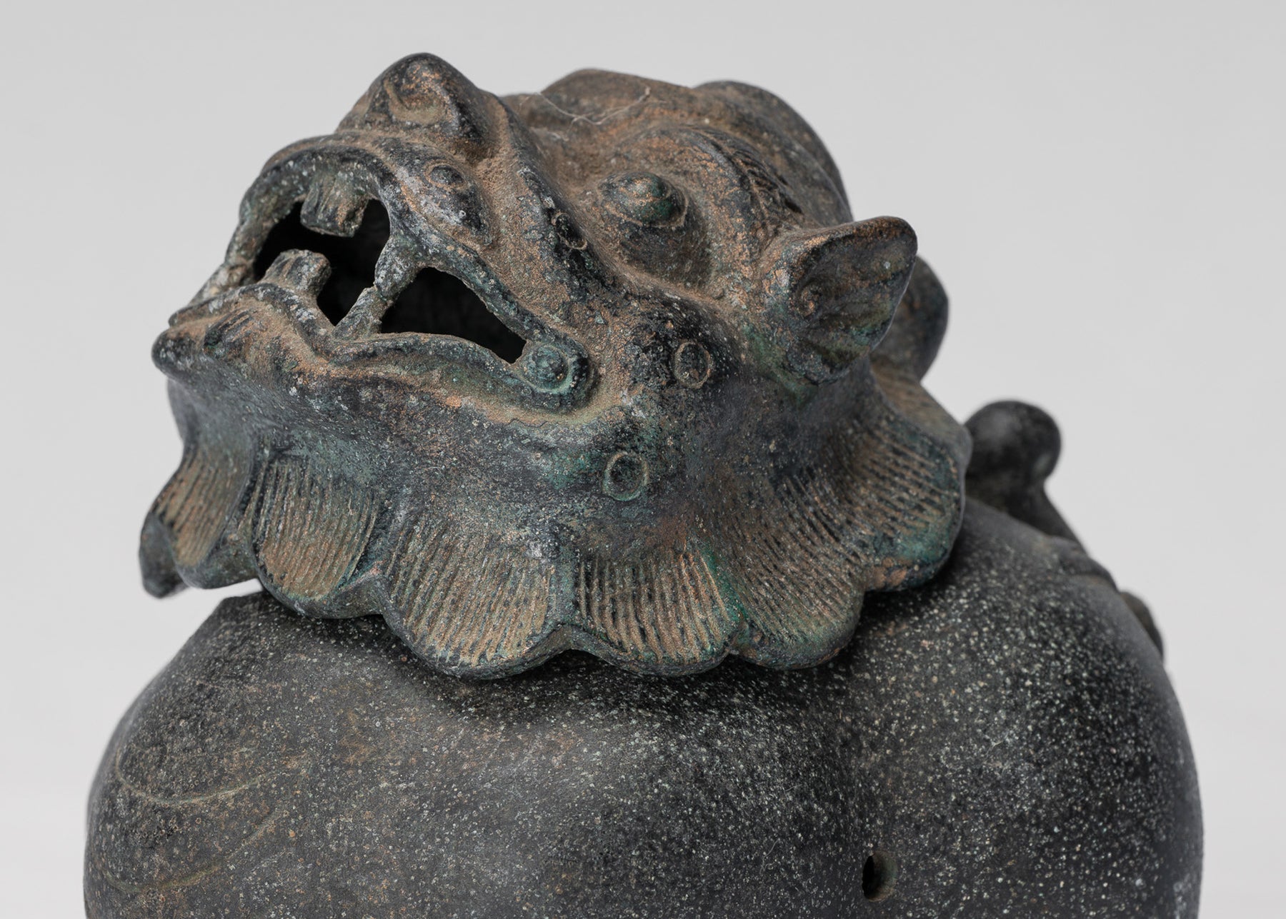 The casting is of particularly high quality, evident in the crisp modelling of the dragon’s face and scales; each detail is cleanly and confidently rendered. A distinctive, time‑softened patina enriches the bronze surface, adding depth, character, and a sense of age.
