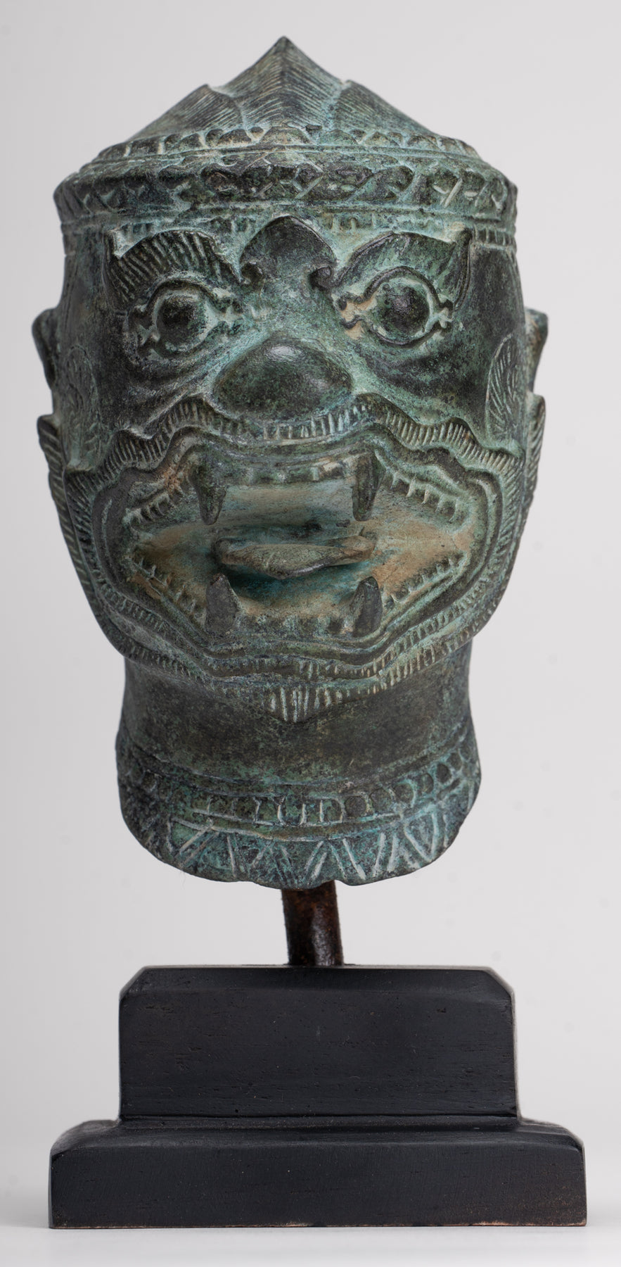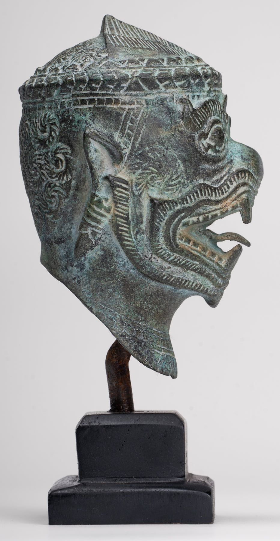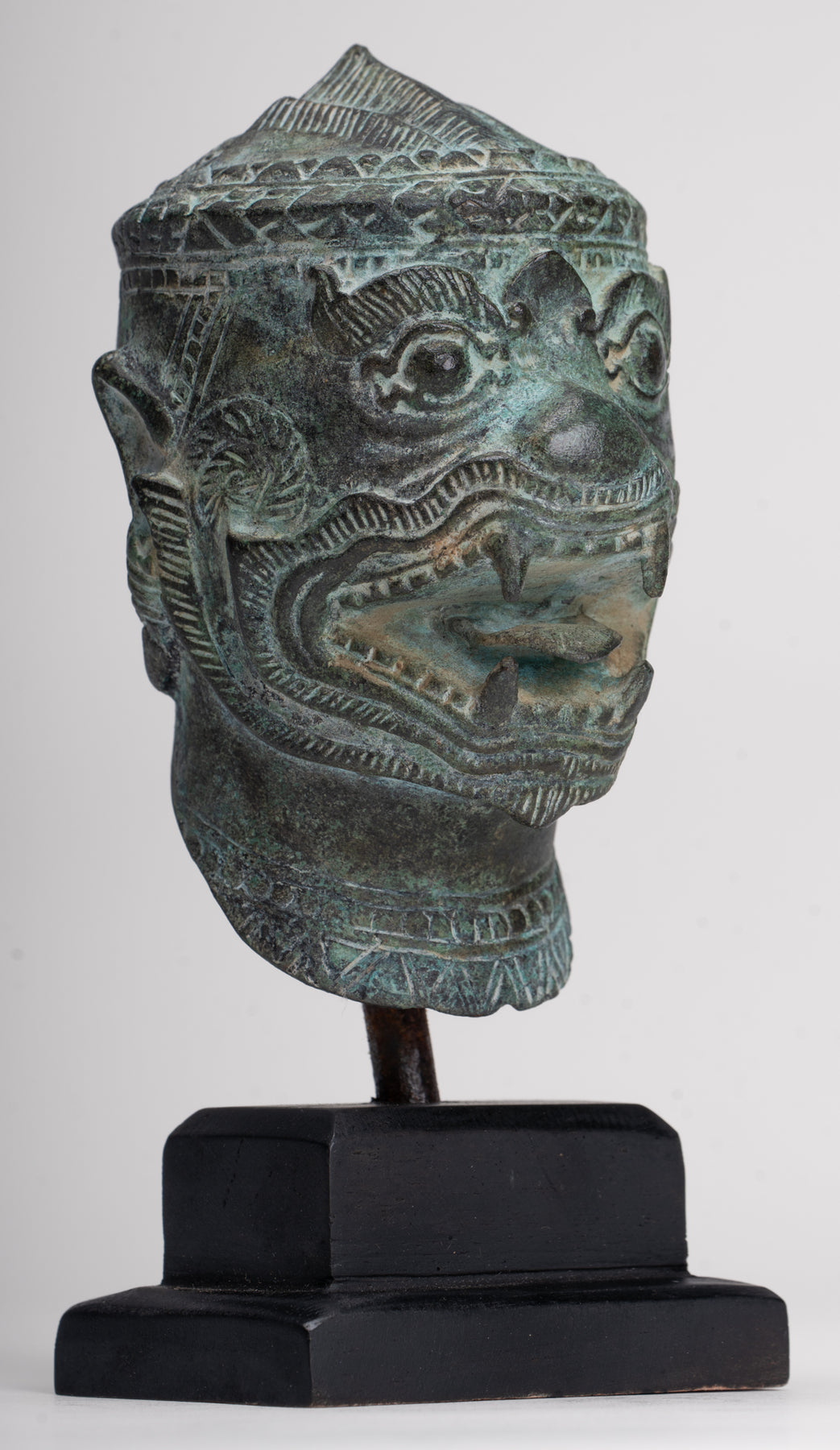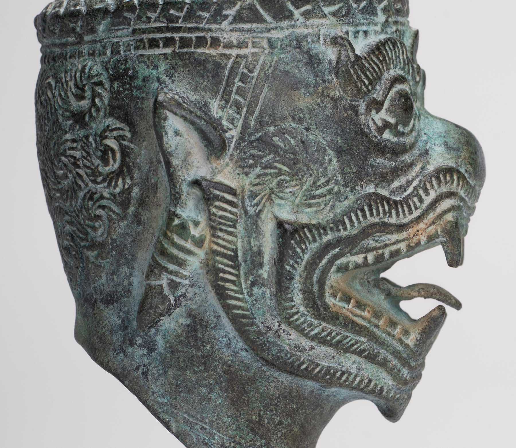 This sculpture is executed in the Bayon style, with a dynamic, expressive face that immediately captures attention. Similar depictions of Hanuman and other figures can be found in the reliefs of the Bayon temple, illustrating 12th-century battle scenes. The idea of a powerful military commander in monkey form comes from the Hindu epic Ramayana, where Prince Rama’s army is led by the valiant monkey general Hanuman.