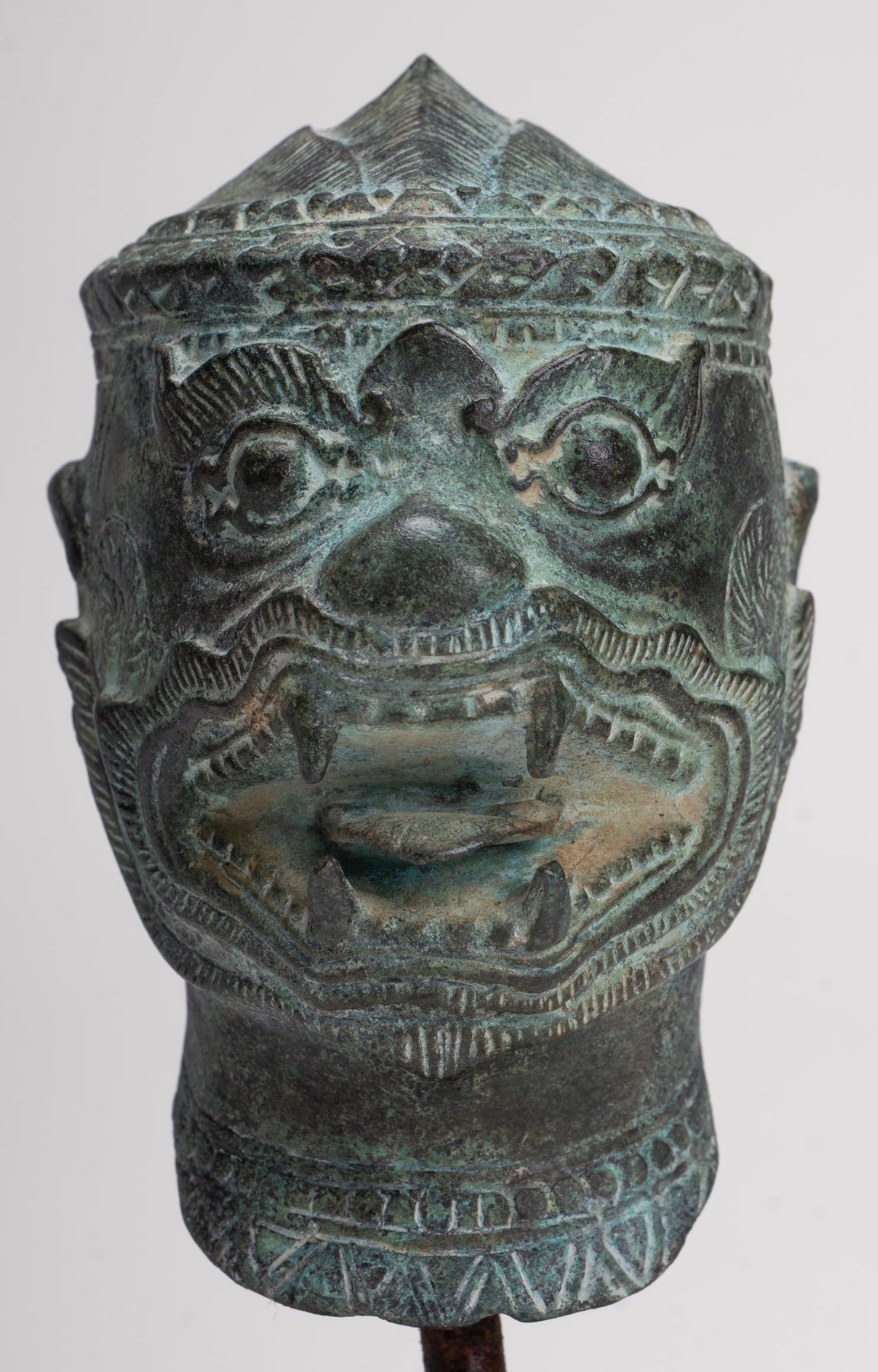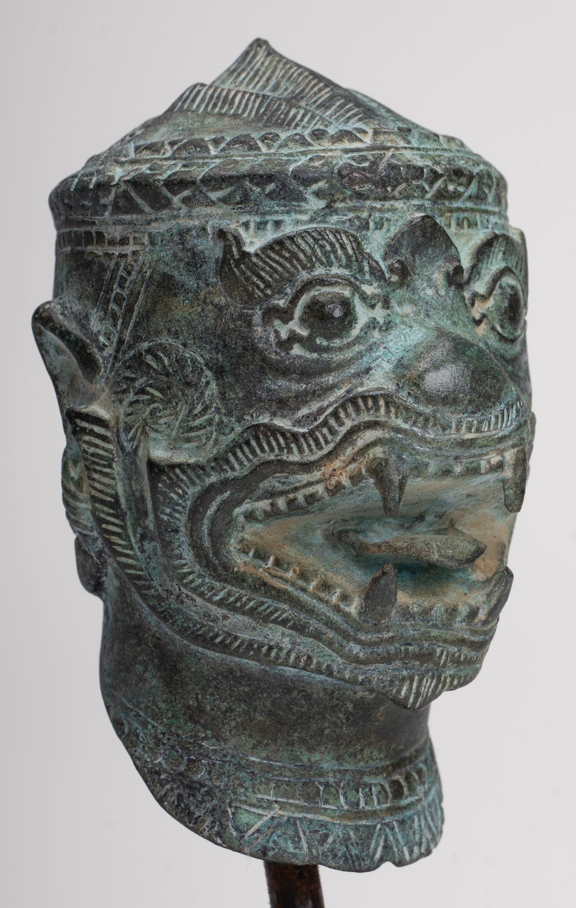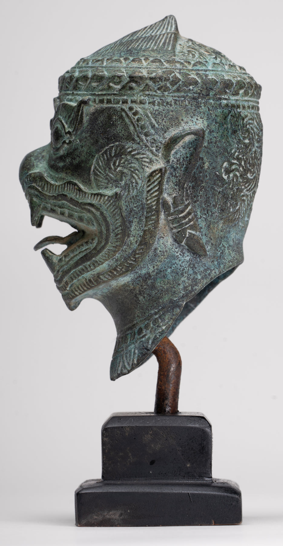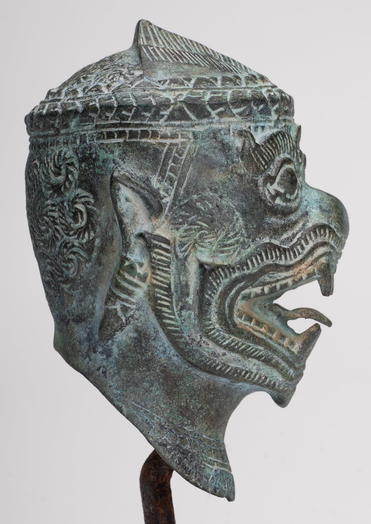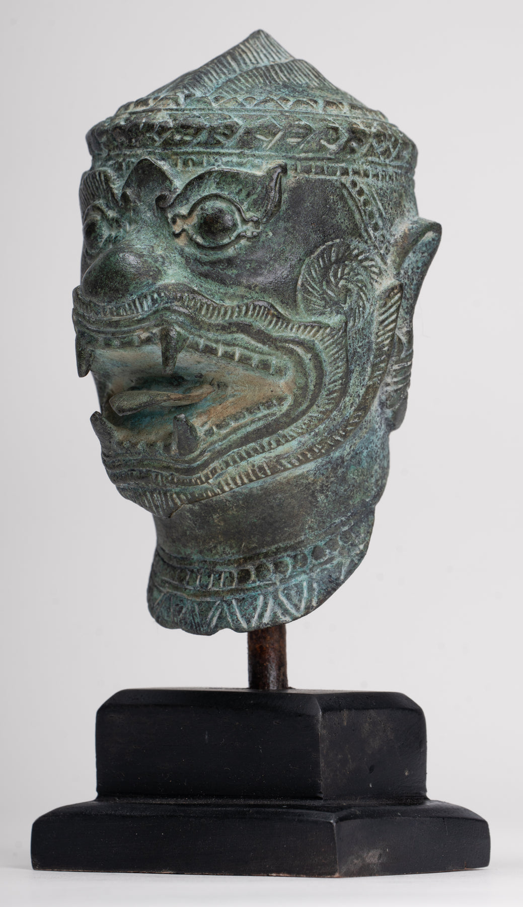 This sculpture is executed in the Bayon style, with a dynamic, expressive face that immediately captures attention. Similar depictions of Hanuman and other figures can be found in the reliefs of the Bayon temple, illustrating 12th-century battle scenes. The idea of a powerful military commander in monkey form comes from the Hindu epic Ramayana, where Prince Rama’s army is led by the valiant monkey general Hanuman.