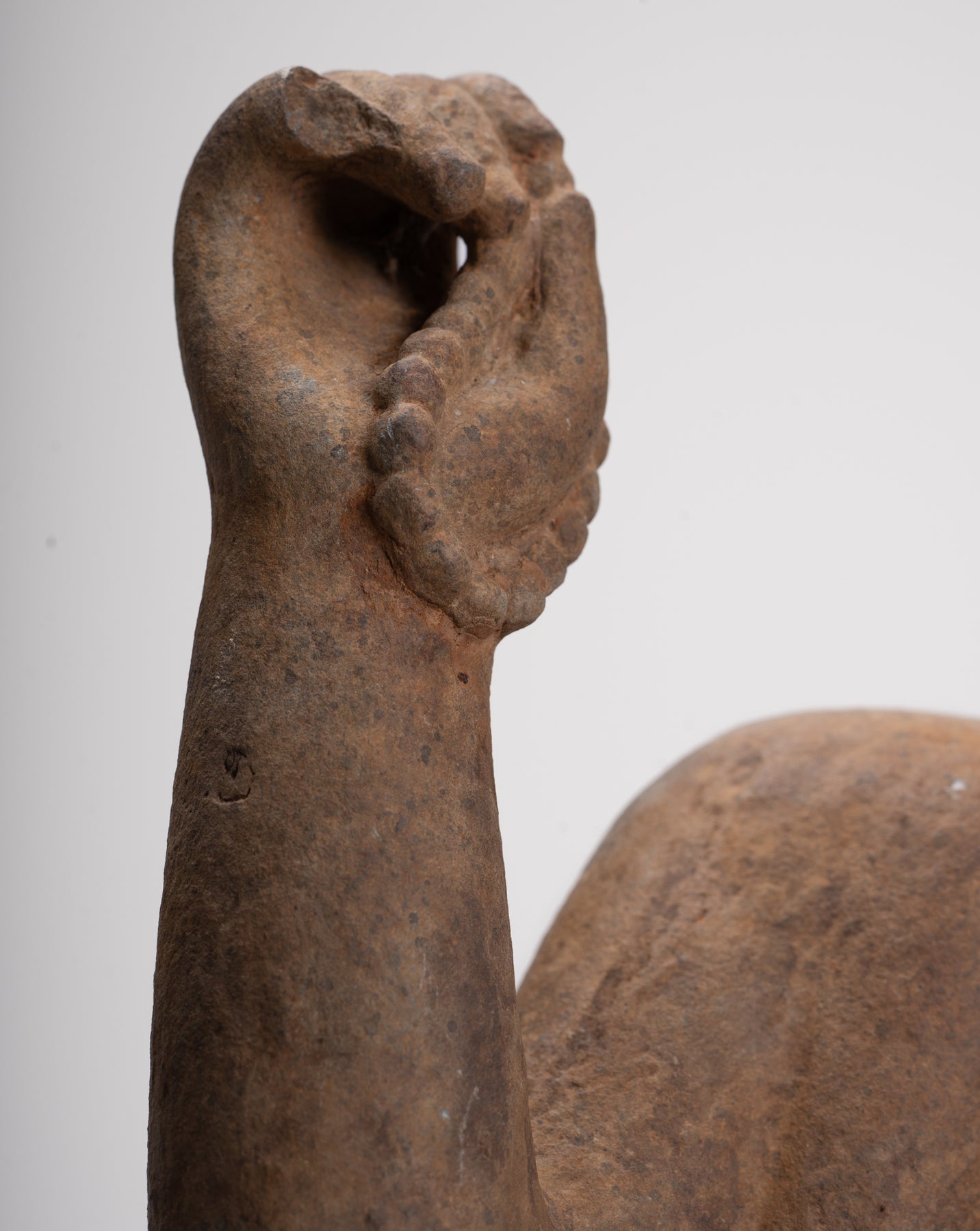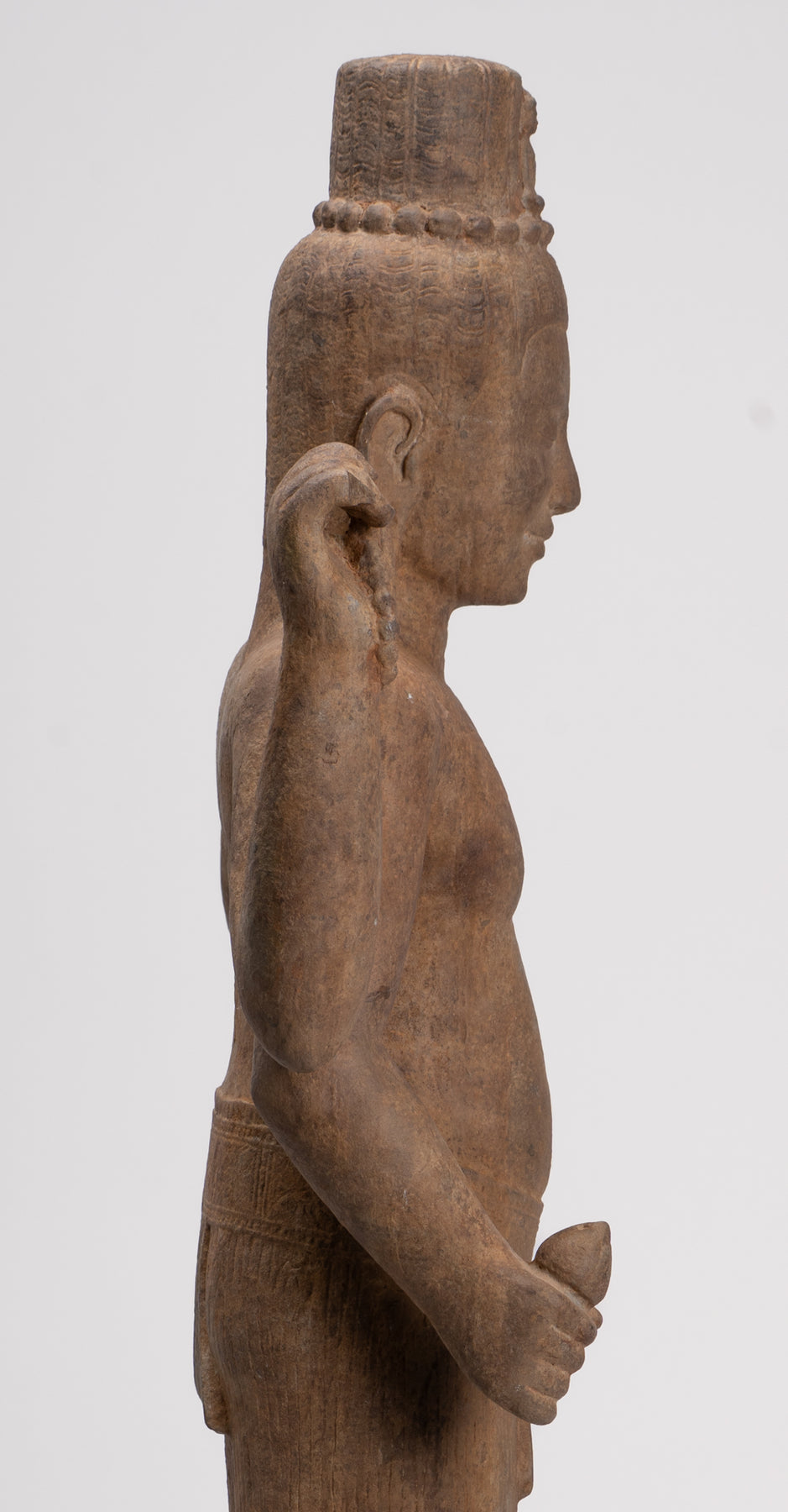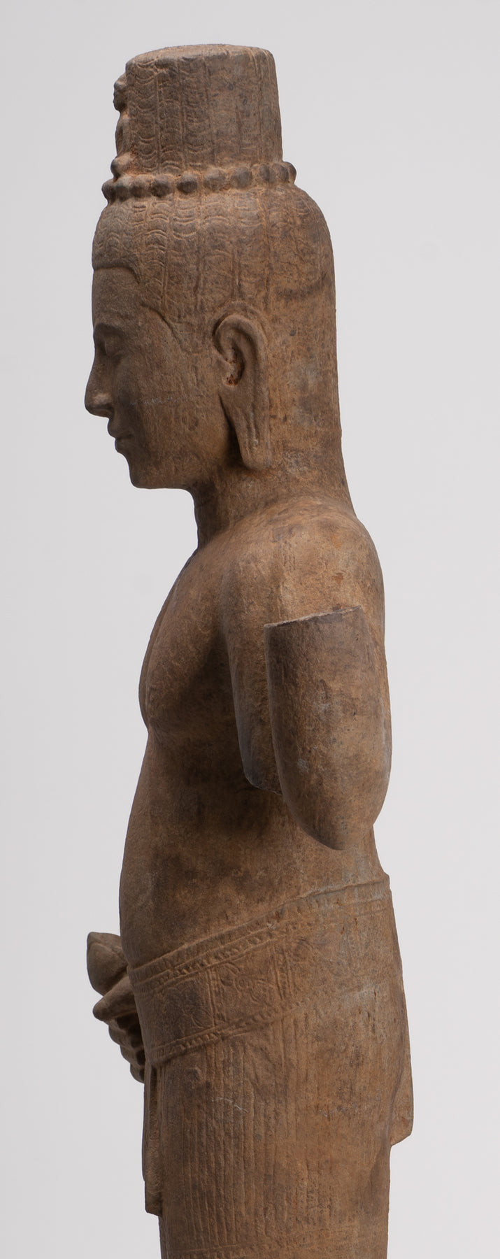 This lovely sculpture of the saviour Avalokitesvara bears eloquent witness to the importance of the Mahayana Buddhist cult of the bodhisattva in pre-Angkorian Cambodia. It signals a taste for large devotional sculptures, undoubtedly installed in well-endowed temples where they would have served as important cult icons. The sensitively modelled and incised facial rendering and the distinctive braided crown of matted hair (jatamukuta) links this sculpture to other tenth-century style figures.