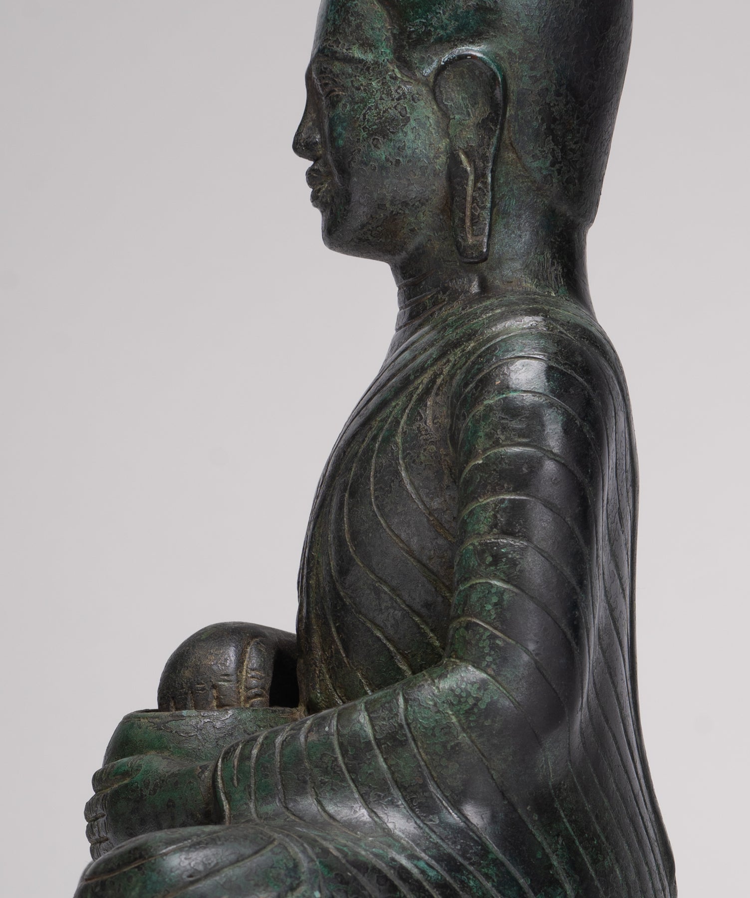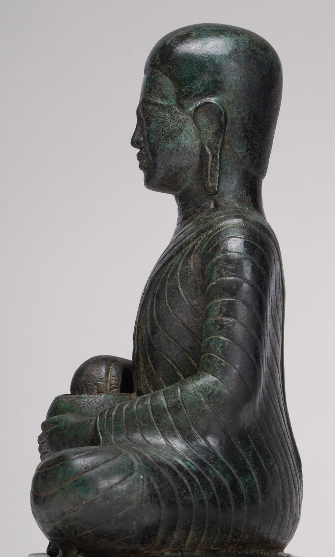 This enlightened Disciple of Buddha, is remarkable for his realistic yet delicate delineation of the limbs and the simple sanghati cascading over the left leg The garment (sanghati) covers only his left shoulder.