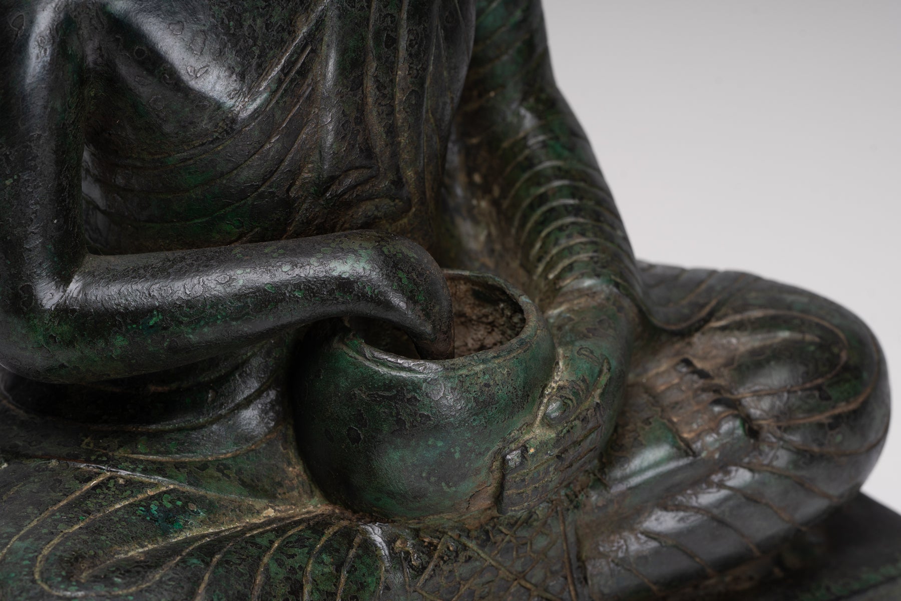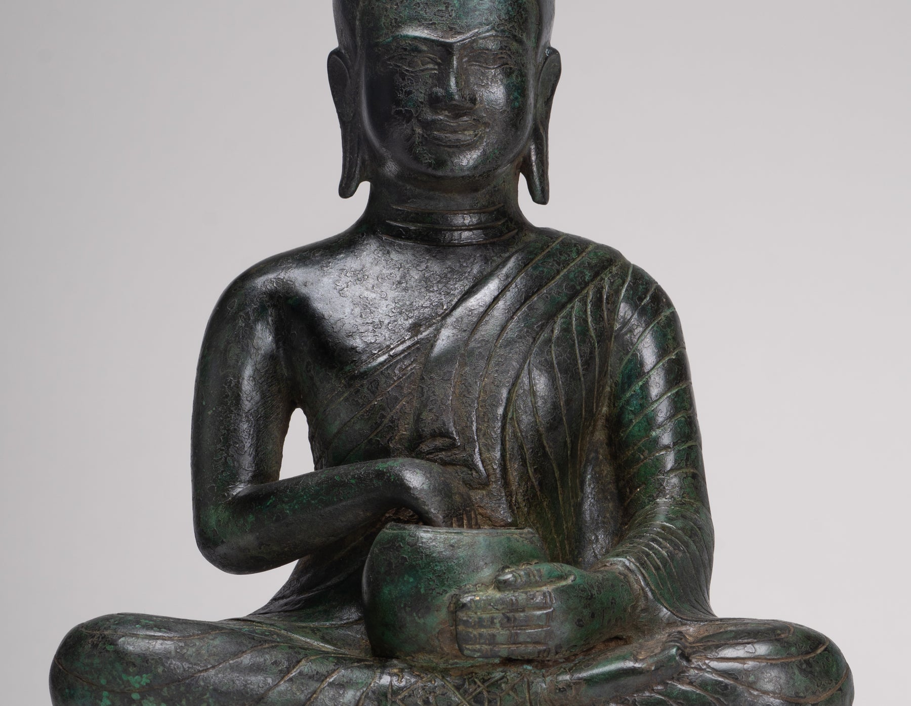 An antique Thai style seated Monk or Disciple of Buddha, holding his alms bowl.
