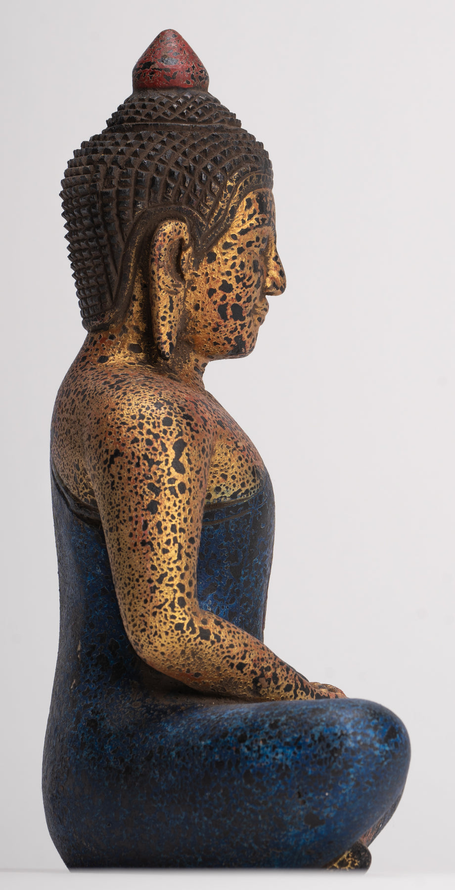 As is traditional, the Meditation Buddha is depicted here in a seated posture, with both legs crossed in the half-lotus position. The hands are placed in the Dhyana Mudra, where the right hand rests on top of the left hand, with the thumbs gently touching, forming a subtle triangle or circle. The Buddha's back is straight, and the gaze is lowered, signifying deep concentration and inner reflection.