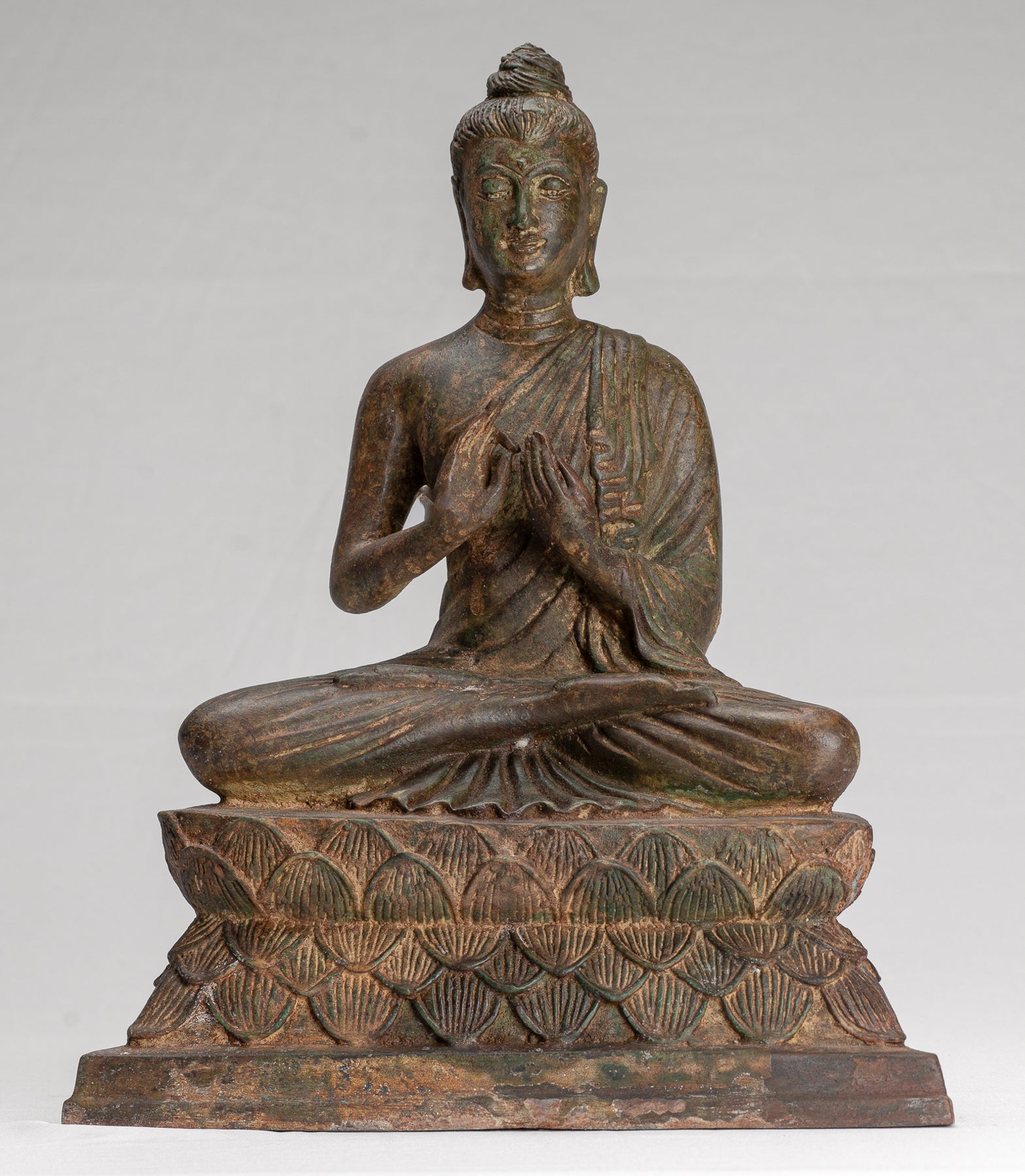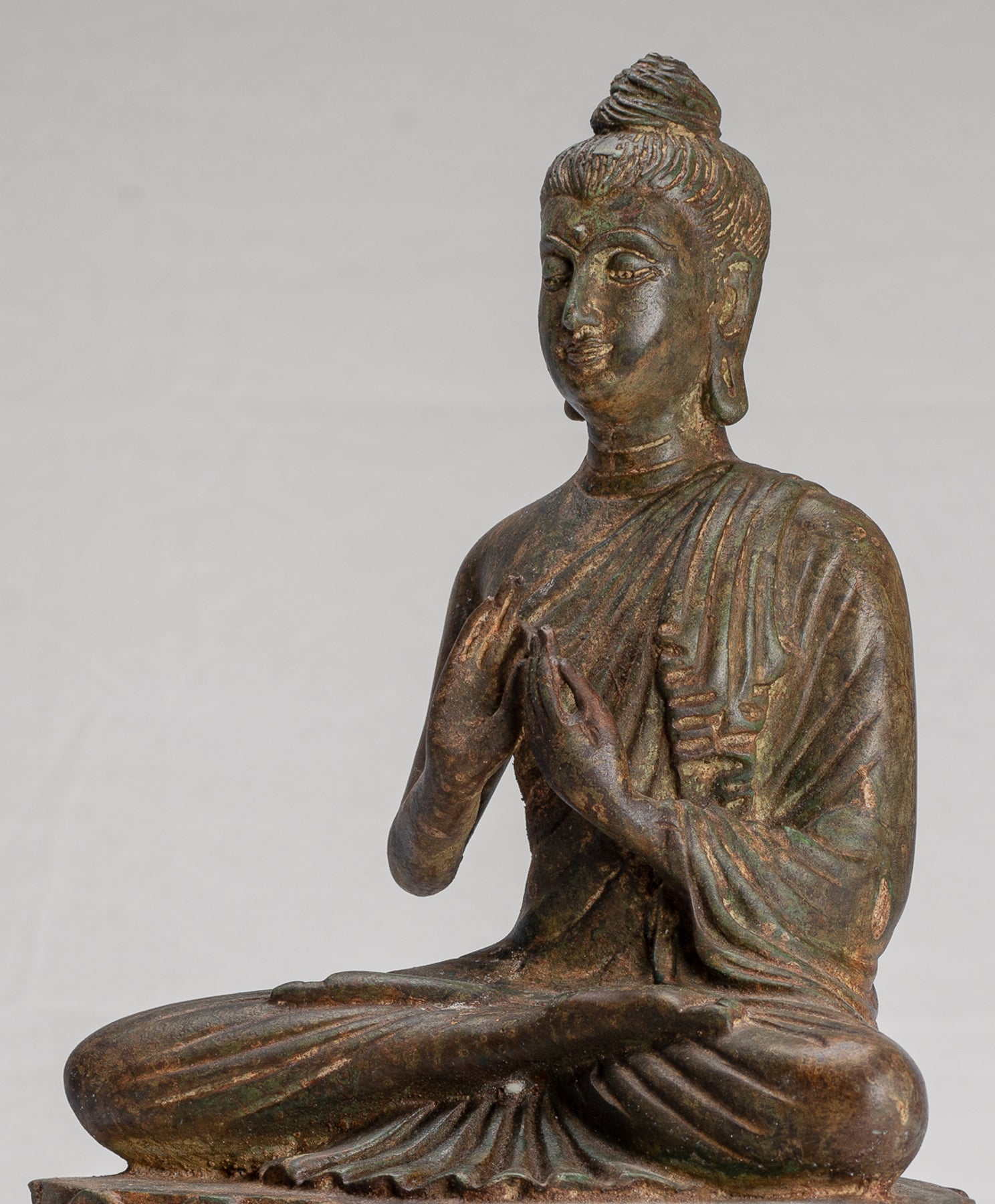 Esta imagen muy venerada del “Buda docente” es central en el arte y la doctrina budistas, y captura el momento en que Buda expuso por primera vez el Dharma a sus compañeros en Deer Park en Sarnath después de su iluminación. Sentado en profunda serenidad meditativa, el cuerpo de Buda muestra hombros anchos y una cintura esbelta, envuelto en una túnica sanghati usada en diagonal sobre el hombro izquierdo, con una solapa muy plisada que cae en cascada hasta el ombligo, mientras que el hombro derecho permanece desnudo.