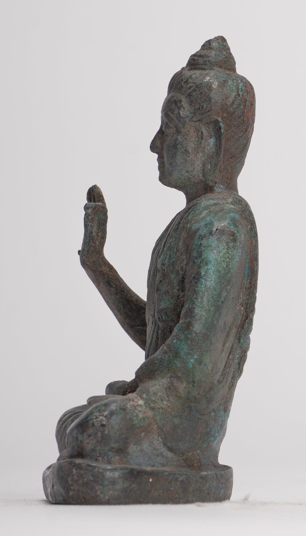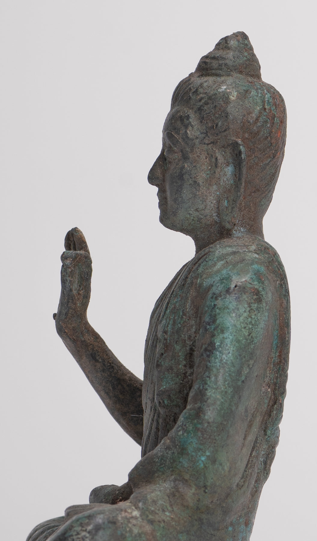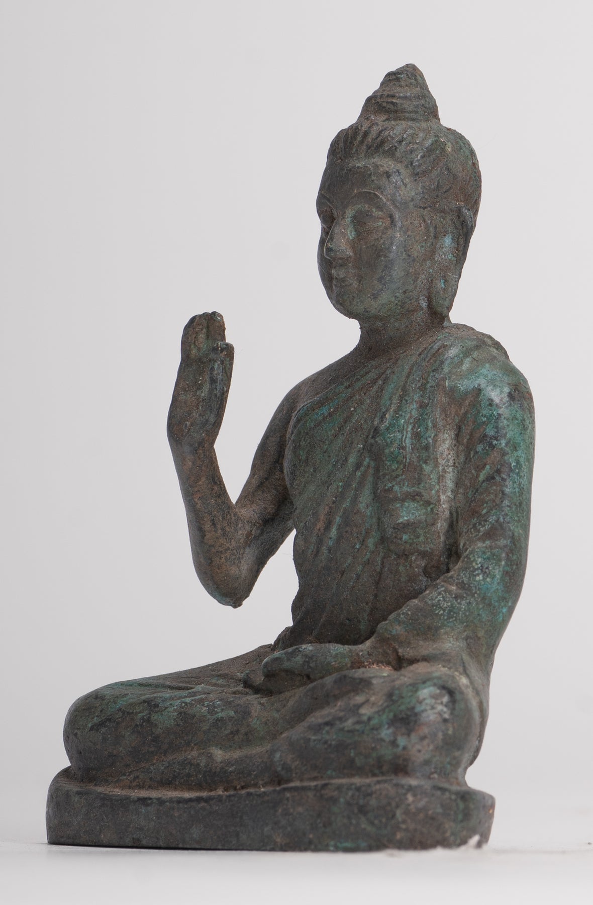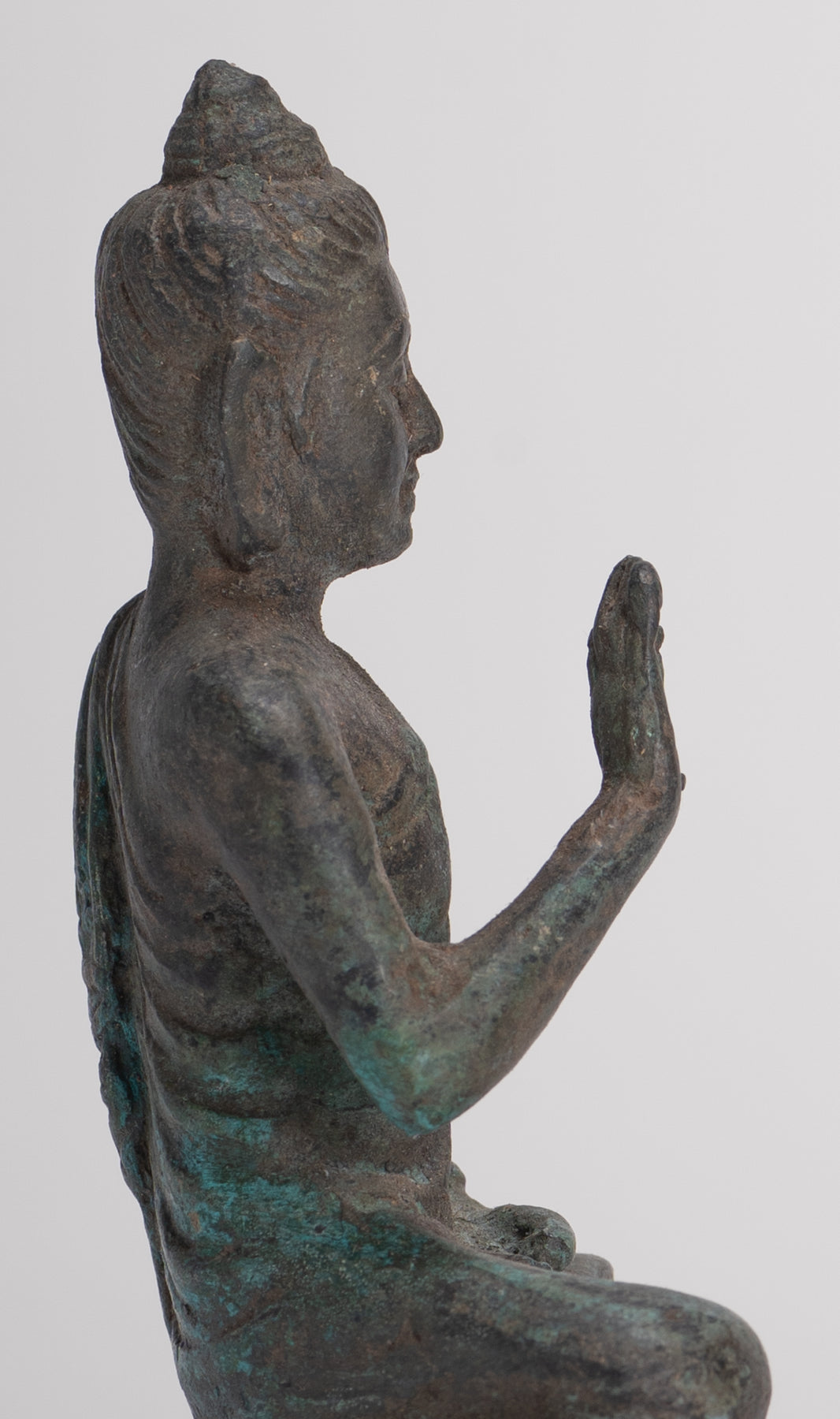 Un Buda antiguo de estilo Gandhara sentado en posición de loto o Padmasana, con cada pie colocado en el muslo opuesto y manos levantadas en el doble Dharmachakra o mudra de enseñanza. Su túnica cae fluidamente en cascada desde ambos hombros.En sánscrito dharmachakra significa "Rueda del Dharma". Este mudra simboliza uno de los momentos más importantes en la vida de Buda, la ocasión en que predicó a sus compañeros el primer sermón después de su Iluminación en Deer Park en Sarnath. Por lo tanto, denota la puesta en movimiento de la Rueda de la enseñanza del Dharma. En este mudra, las puntas del pulgar y el índice se tocan para formar un círculo. Este círculo representa la Rueda del Dharma, o en términos metafísicos, la unión del método y la sabiduría. Esto simboliza la generosidad.