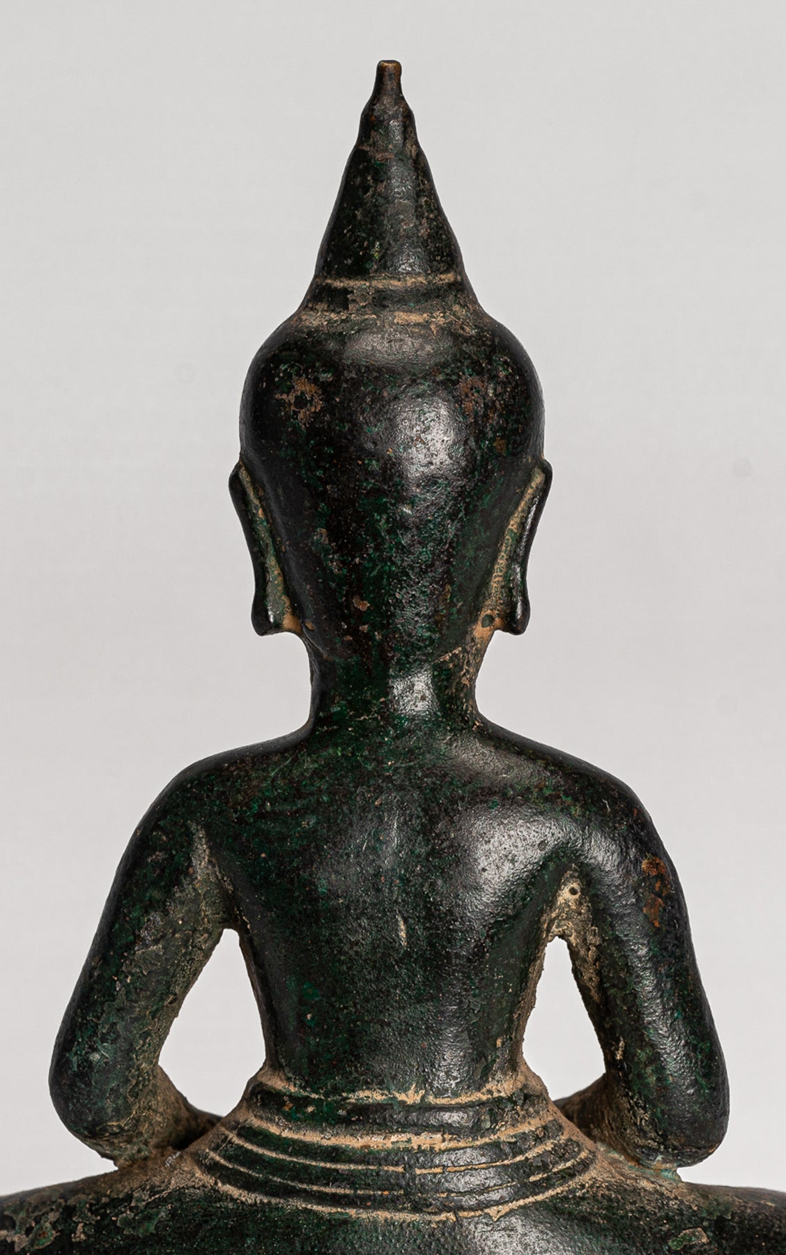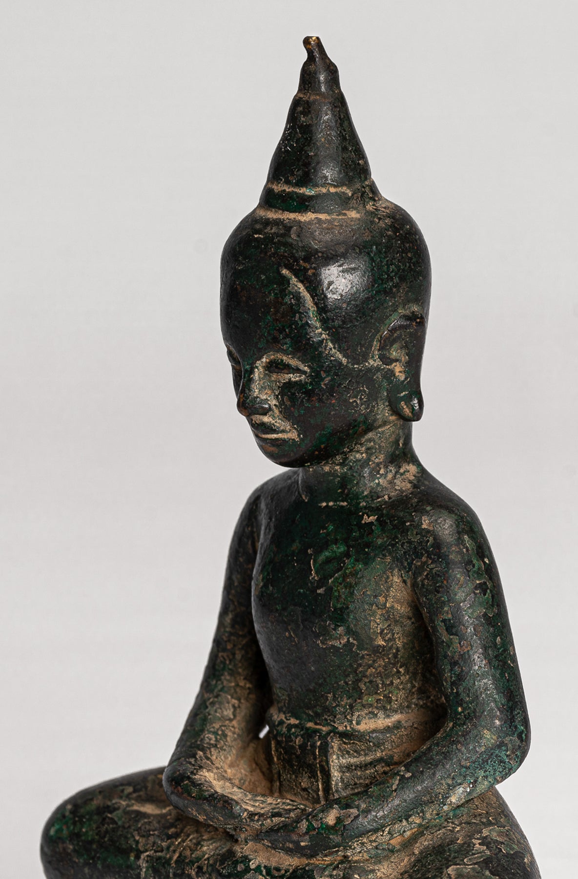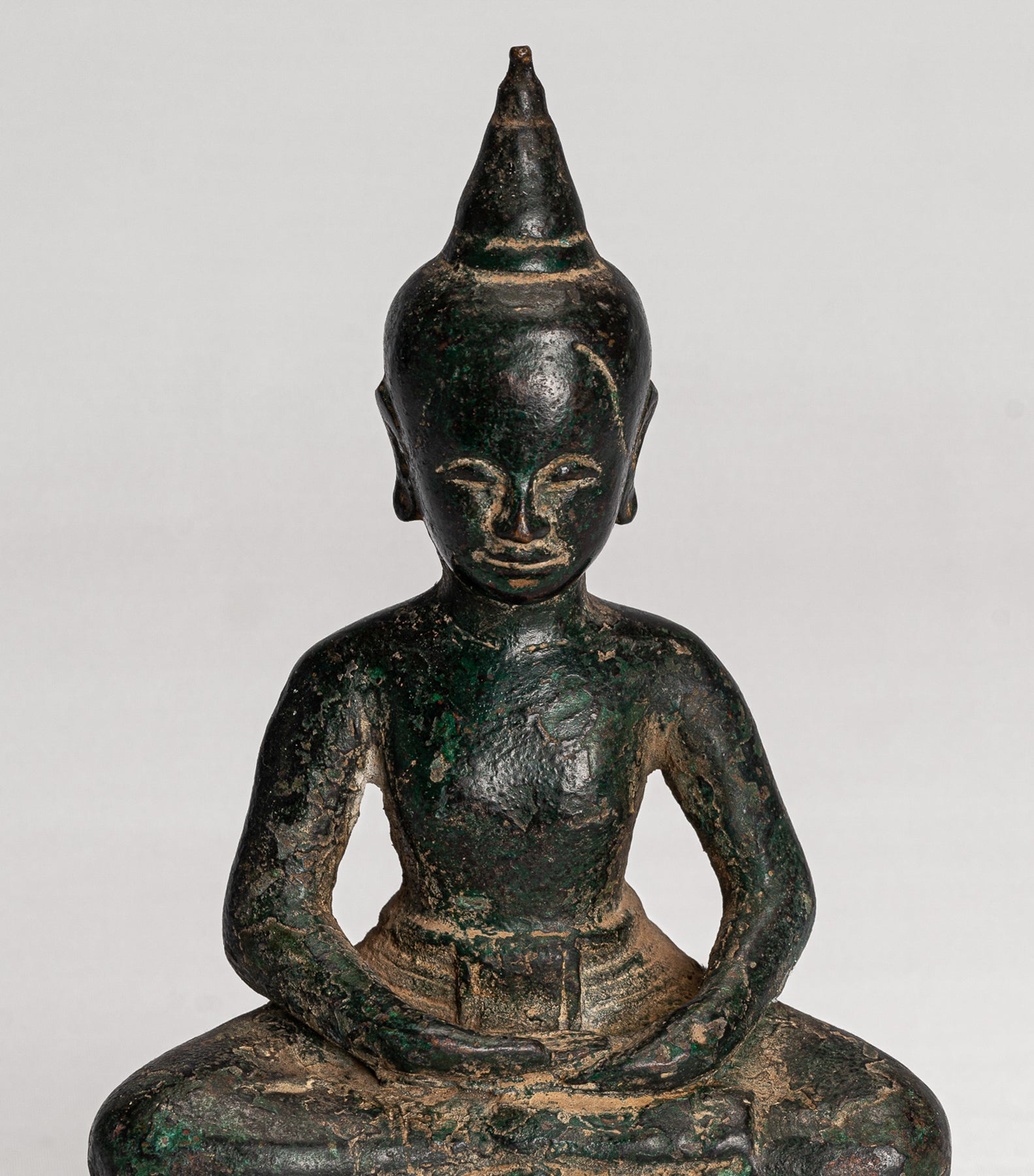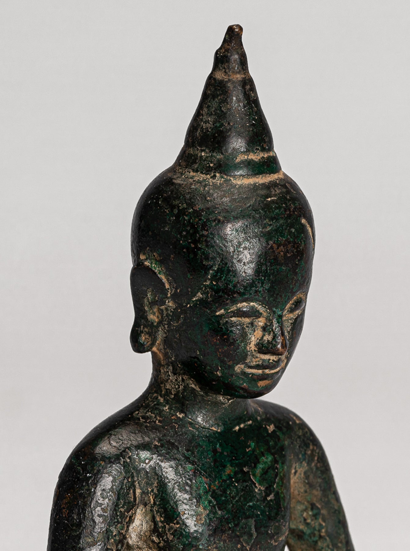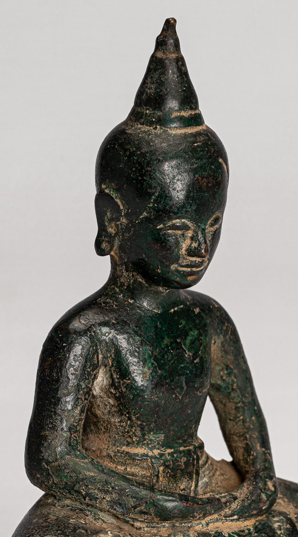 La cara del Buda es serena, con una expresión naturalista y cálida. El cabello simplemente se representa a medida que se eleva a la flor de loto en forma de Ushnisha, simbolizando su alto nivel de desarrollo espiritual. La cara tiene ojos medio cerrados que sugieren una meditación interna, una boca bastante sensual y una barbilla apenas hoyisina.La superficie del Buda tiene un verde de malaquita profunda muy atractiva.