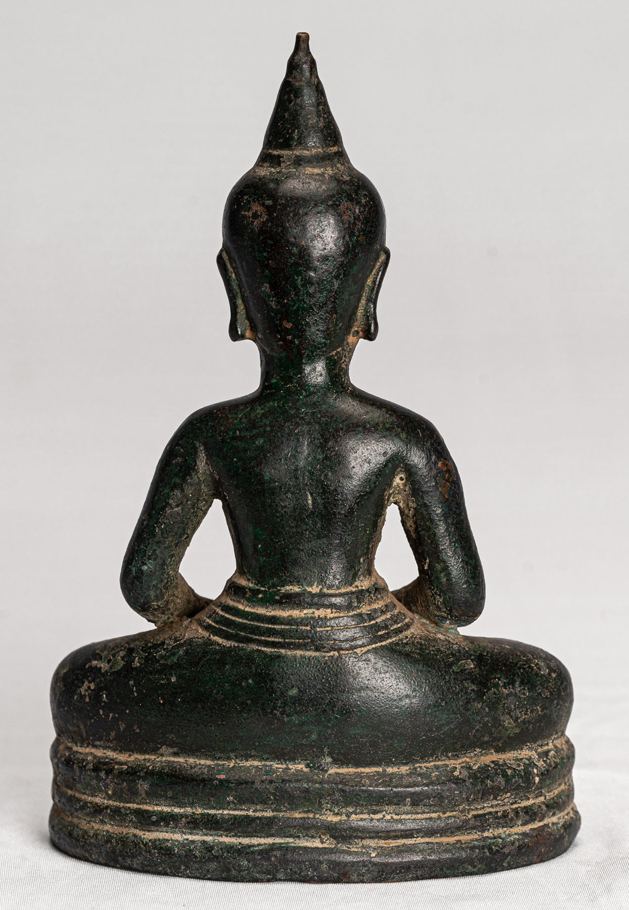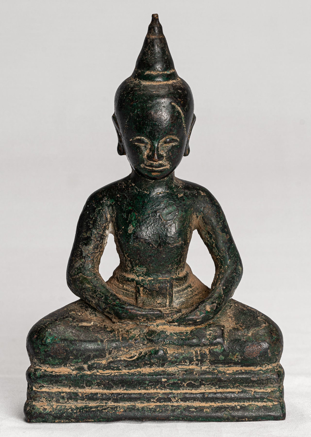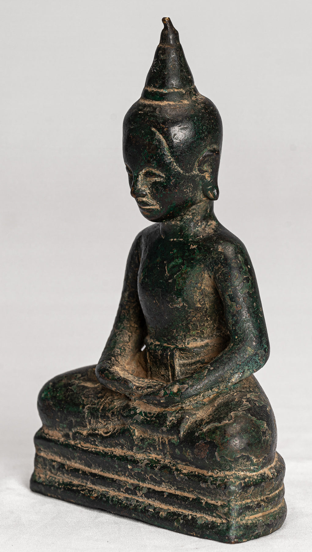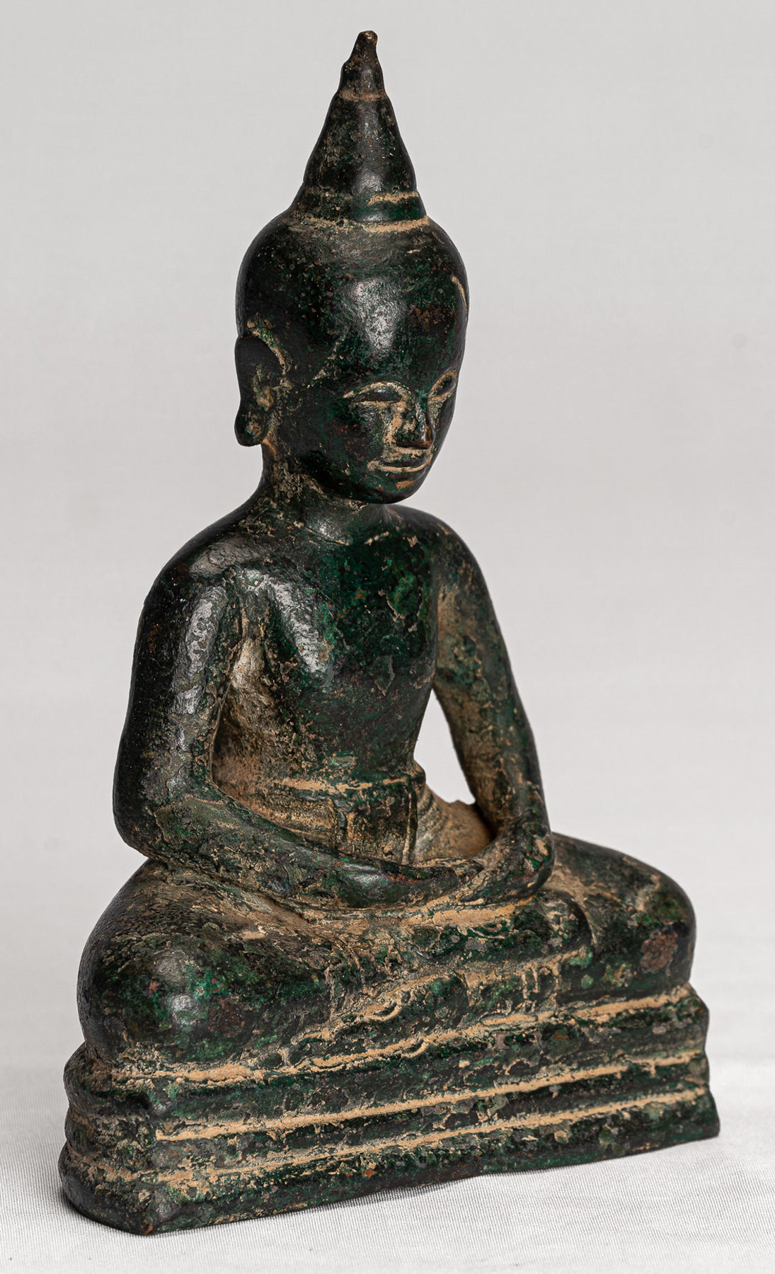 Este encantador Buda está sentado en un simple pedestal. Está vestido con un vestido monástico compuesto por dos elementos tradicionales, una ropa interior que consiste en una larga pieza de tela alrededor de las caderas y una larga suelta. Sanghati Bobo que cubre su hombro izquierdo. La ropa abraza sensualmente el cuerpo que revela la anatomía debajo, un estilo de cortinas inspirado en los estilos de Dvaravati de principios del siglo VII que se remontan a los estilos en el período Gupta India.Las manos de Budas están en Dhyana Mudra, el gesto de la mano que promueve la energía de la meditación, la profunda contemplación y la unidad con mayor energía.