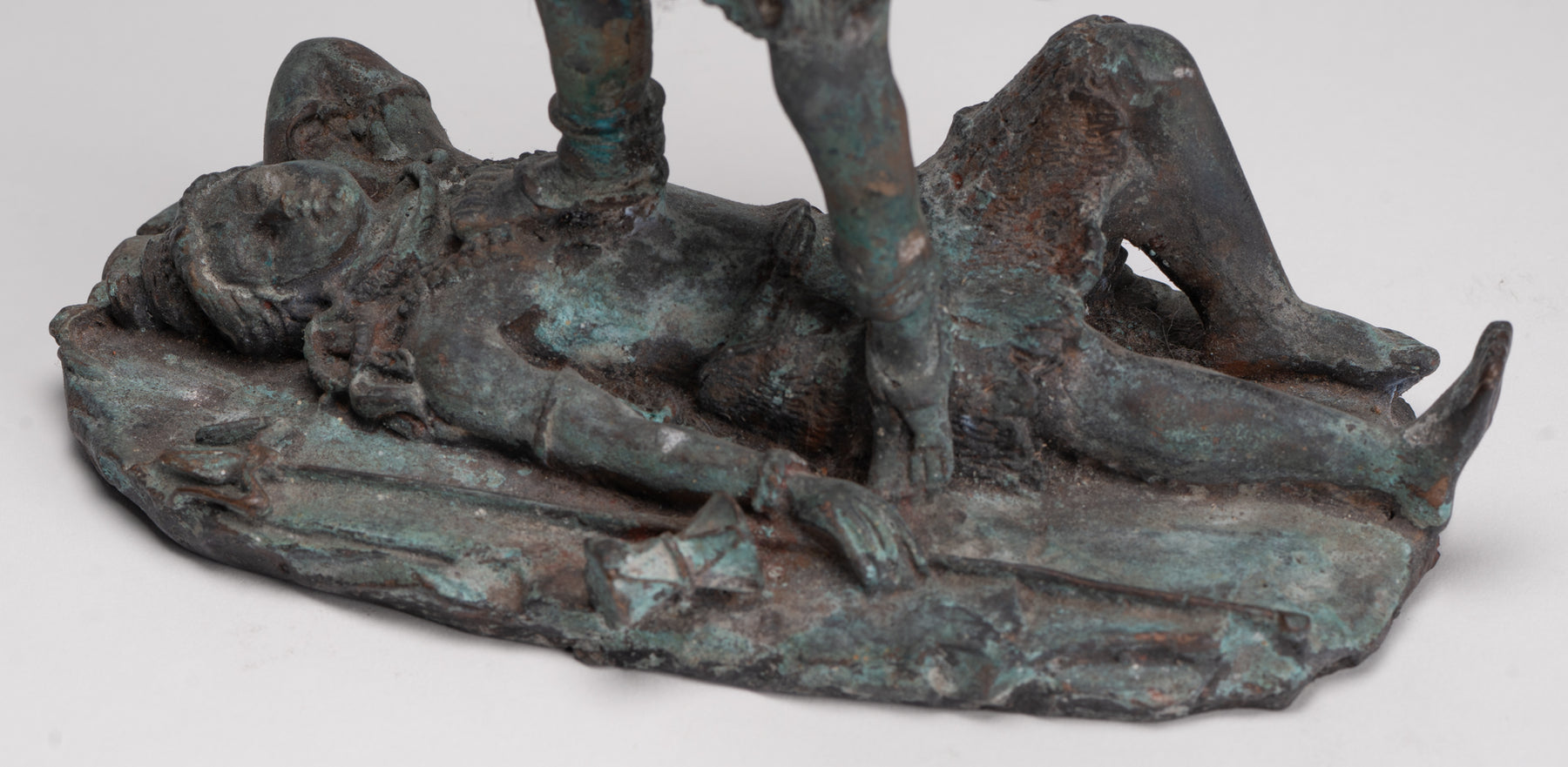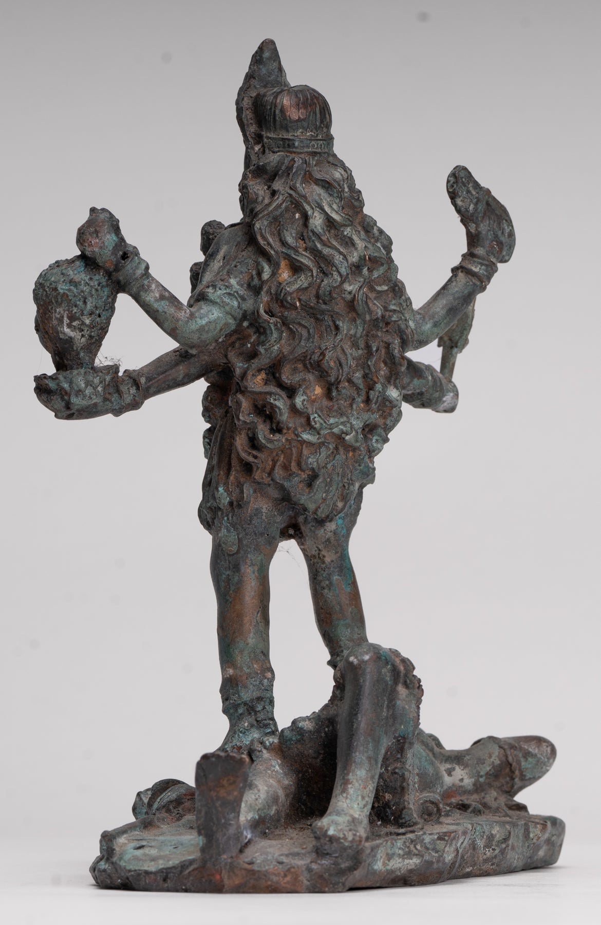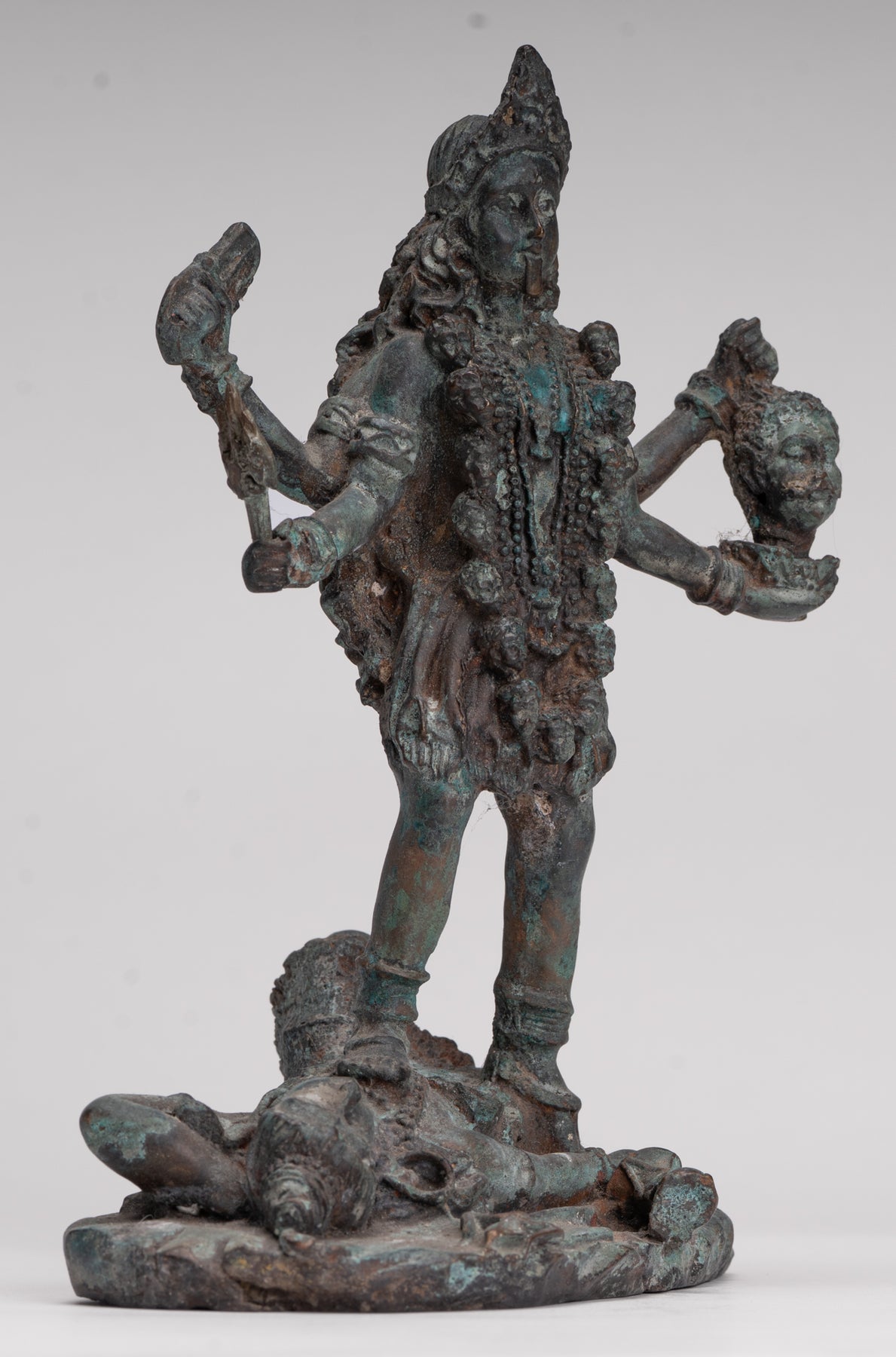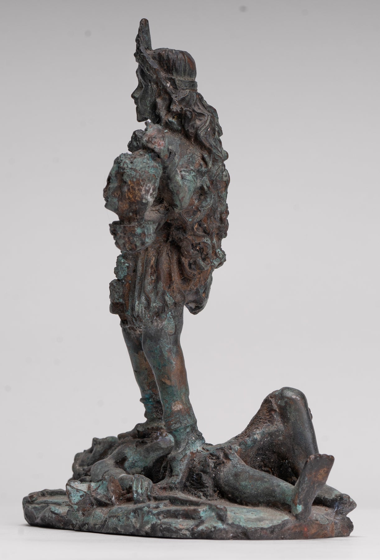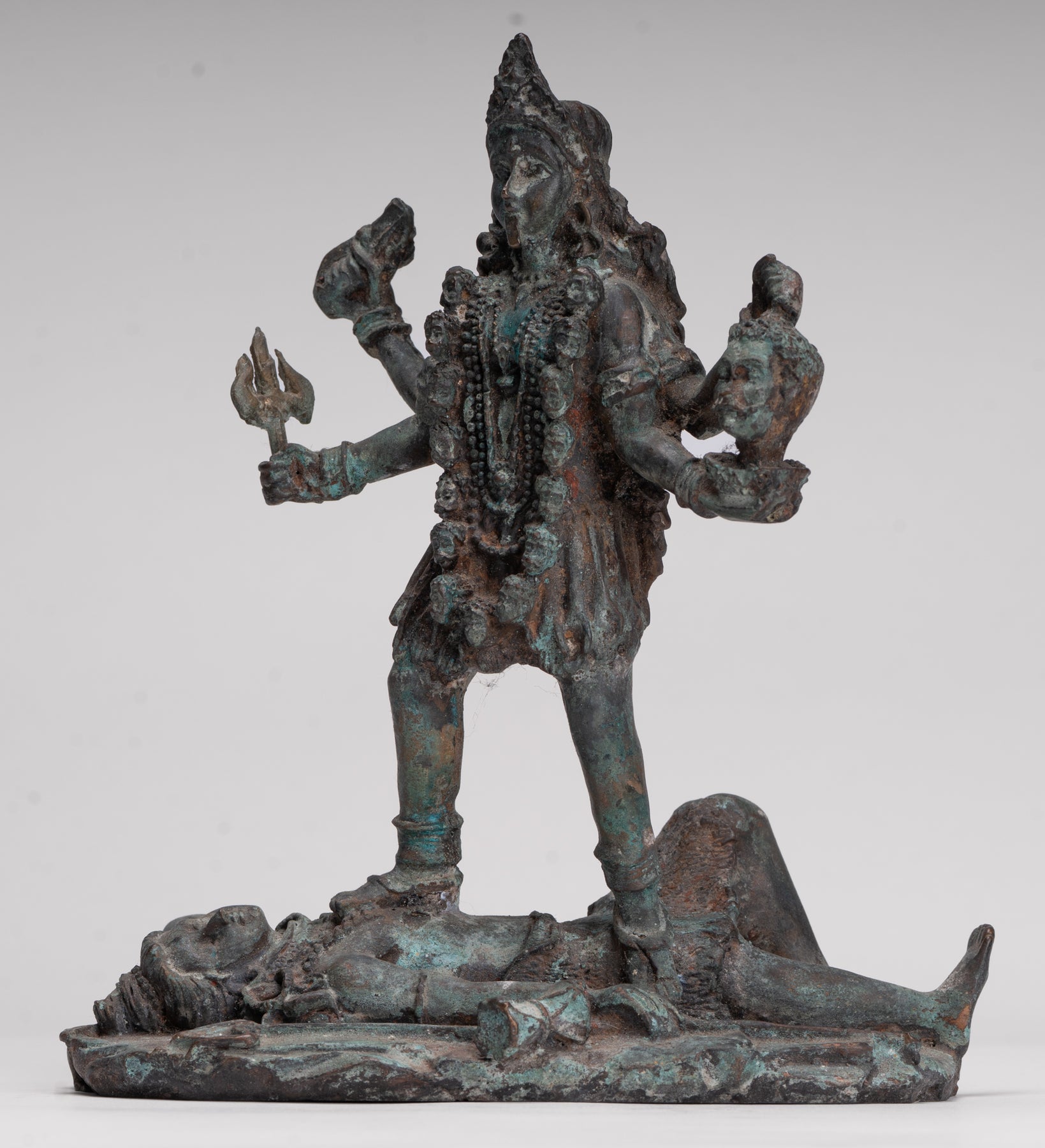 Un bronce antiguo de estilo indio. Kali (Mahakali) Escultura en una pose dinámica de victoria, esta sorprendente pieza está representada en el siglo XIII. estilo majapahit. Aquí, la temible pero protectora diosa se alza triunfante sobre un postrado shiva, que encarna el triunfo definitivo del poder divino y el orden cósmico.