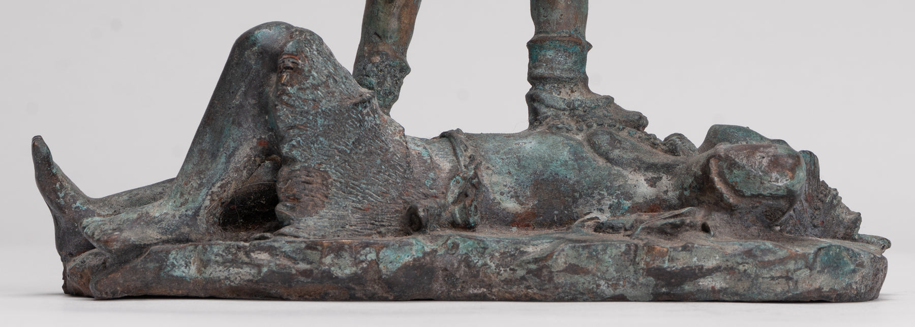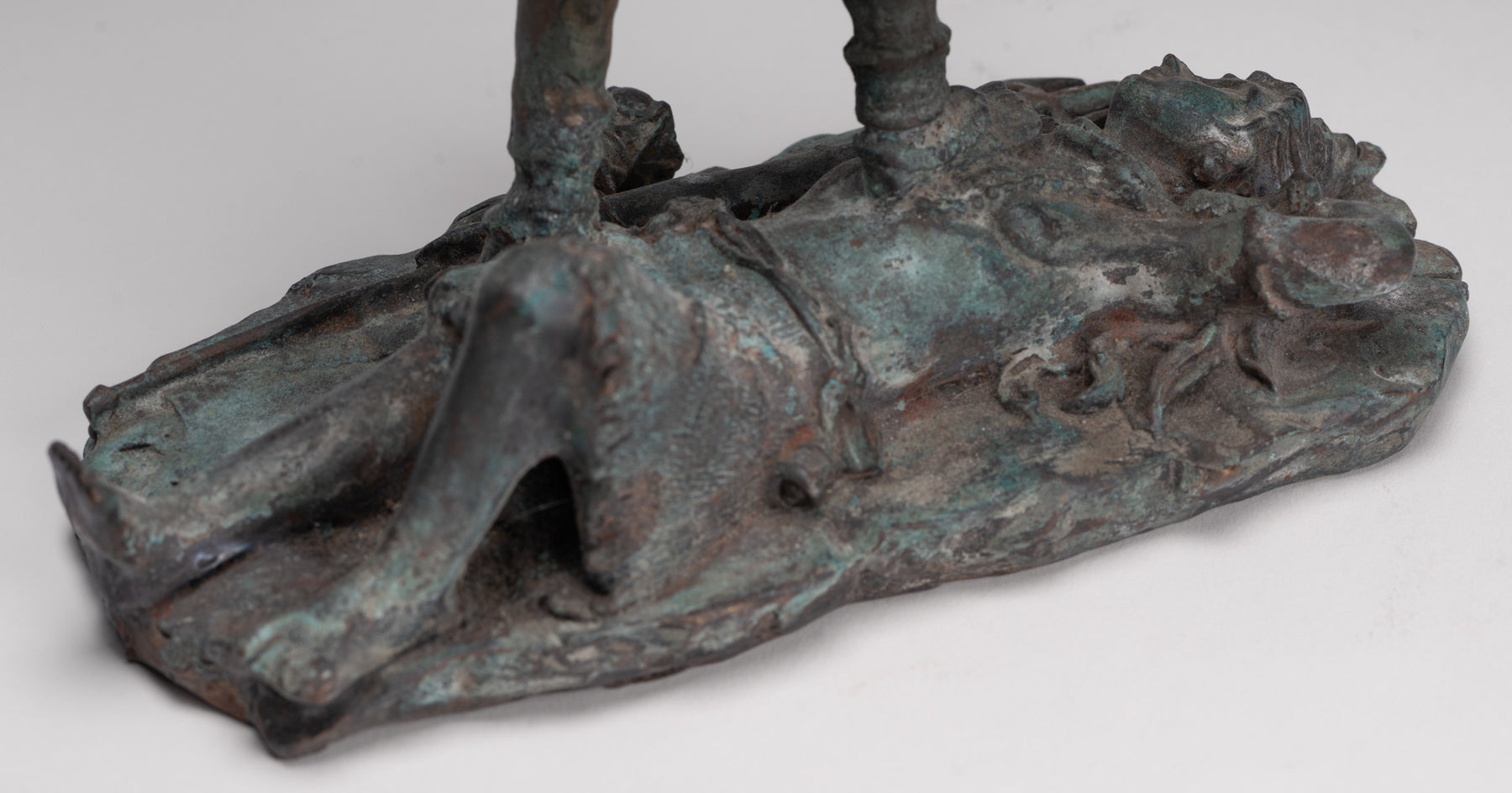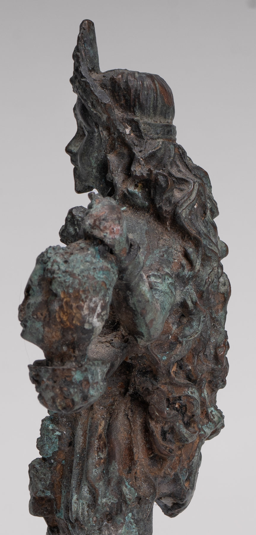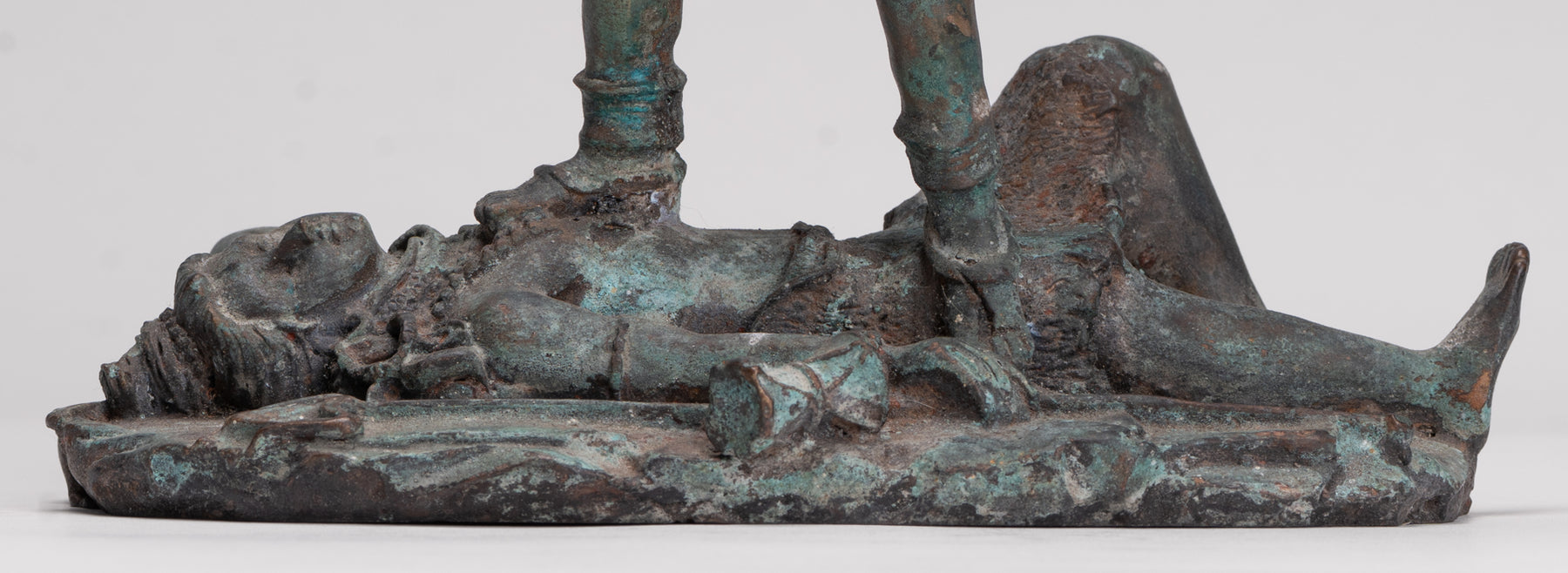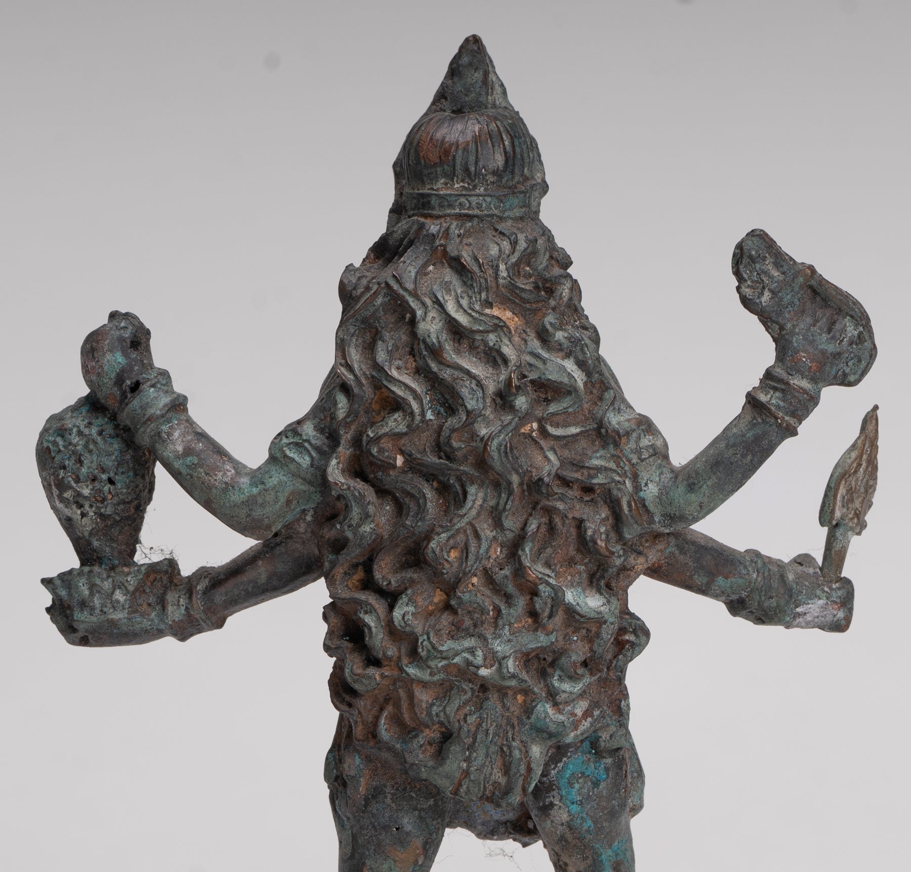 Un bronce antiguo de estilo indio. Kali (Mahakali) Escultura en una pose dinámica de victoria, esta sorprendente pieza está representada en el siglo XIII. estilo majapahit. Aquí, la temible pero protectora diosa se alza triunfante sobre un postrado shiva, que encarna el triunfo definitivo del poder divino y el orden cósmico.