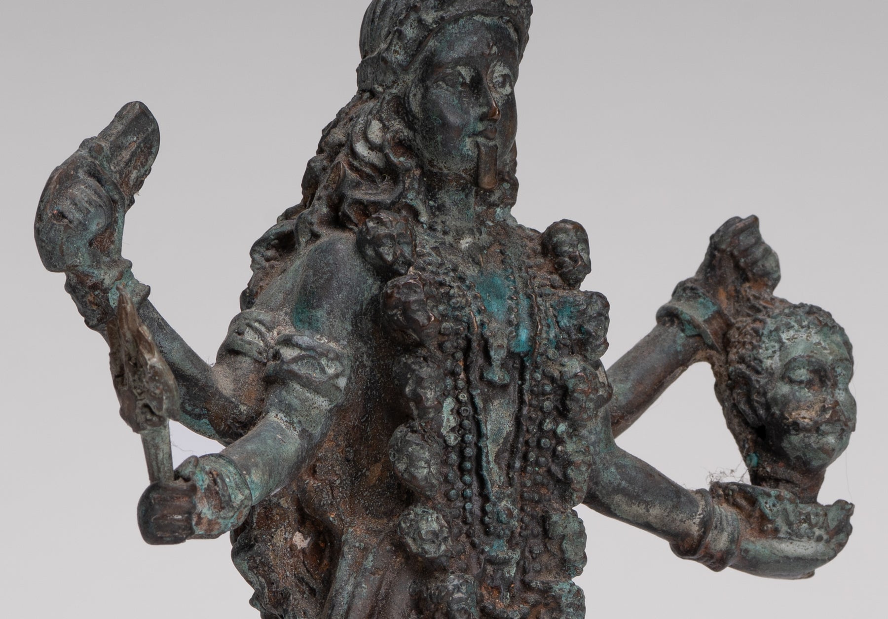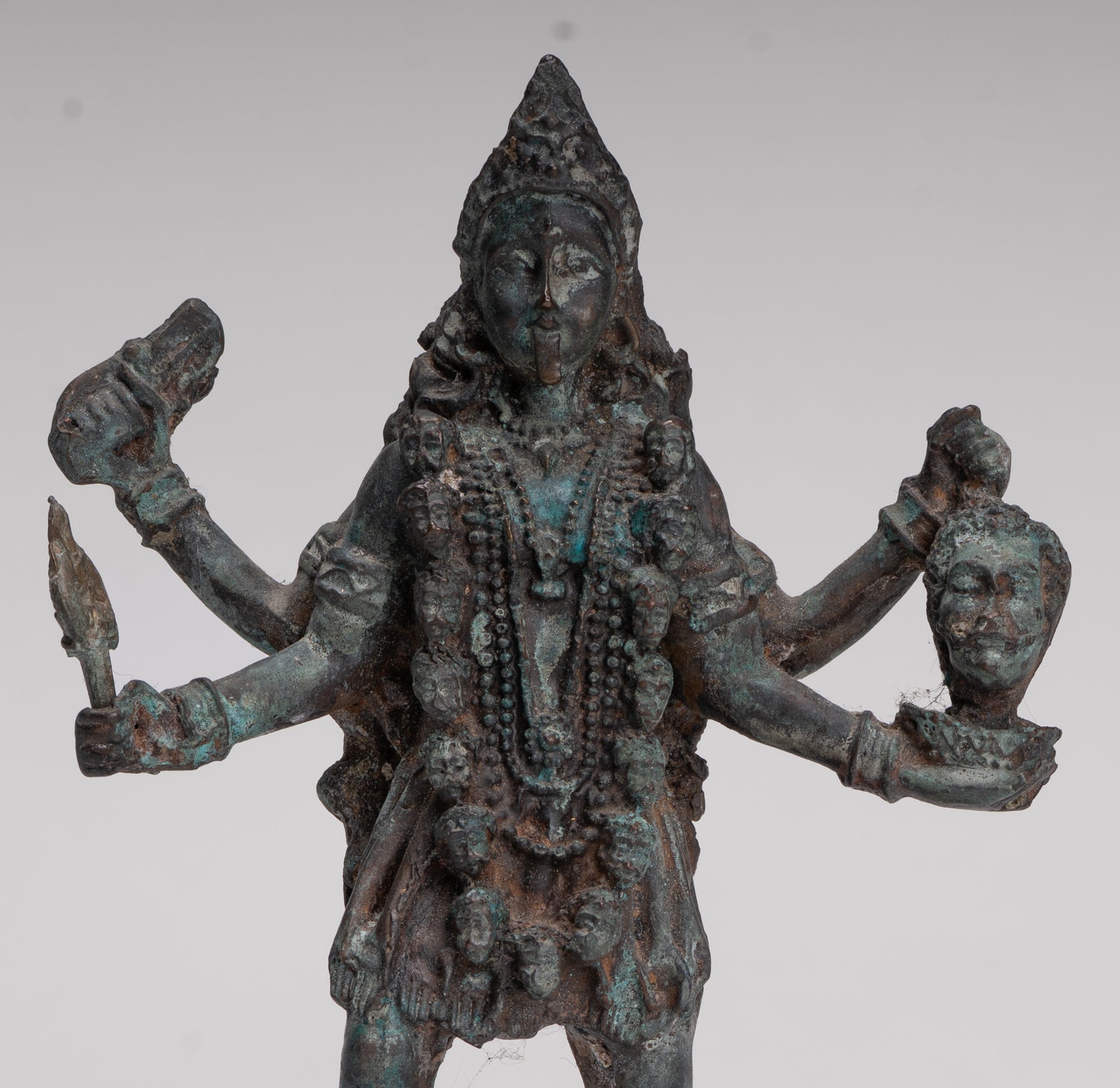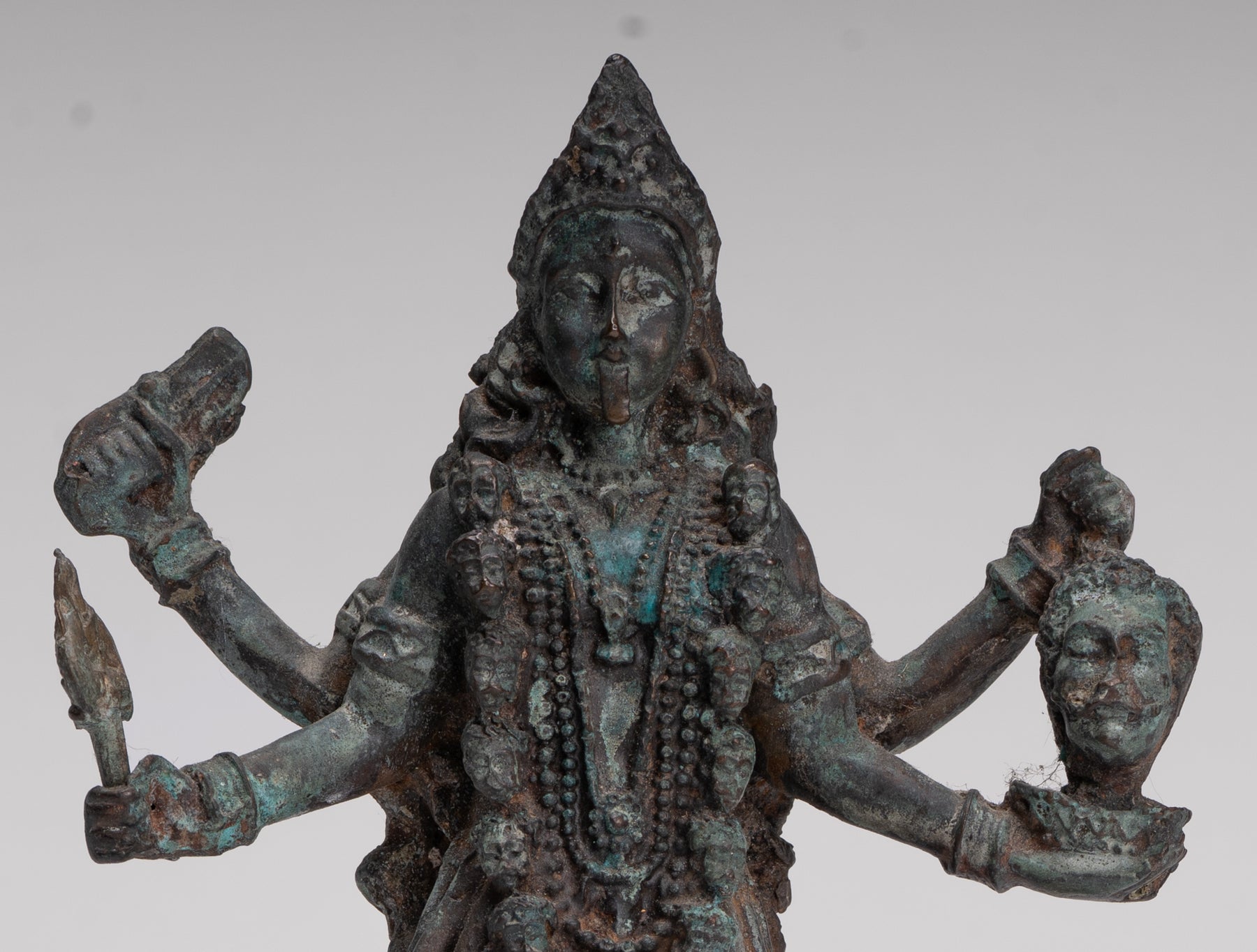 Alrededor de su cuello cuelga un dramático guirnalda de cabezas humanas, entendido como el Varnamala, la guirnalda de letras sánscritas (Devanagari). Cada letra es considerada una forma de energía y un aspecto de la propia Kali, afirmando su papel como madre de la lengua y los mantras. Sobre su cabeza lleva un ornamentado estilo indio. tiara ante un alto kirita-makuta (corona cónica), que simboliza el dominio sobre las fuerzas positivas y negativas. un tercer ojo (urna) en su frente significa una visión espiritual elevada más allá de la percepción ordinaria.