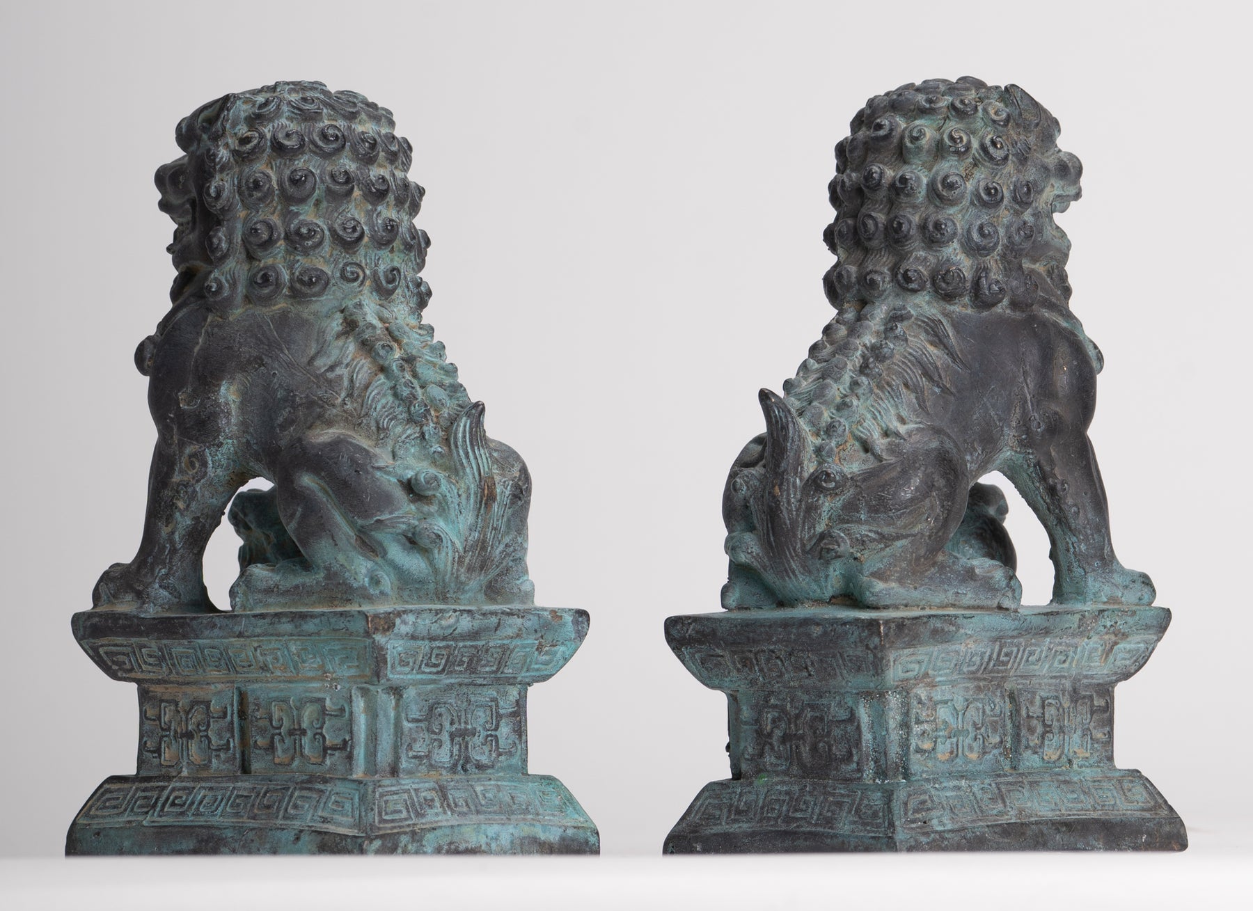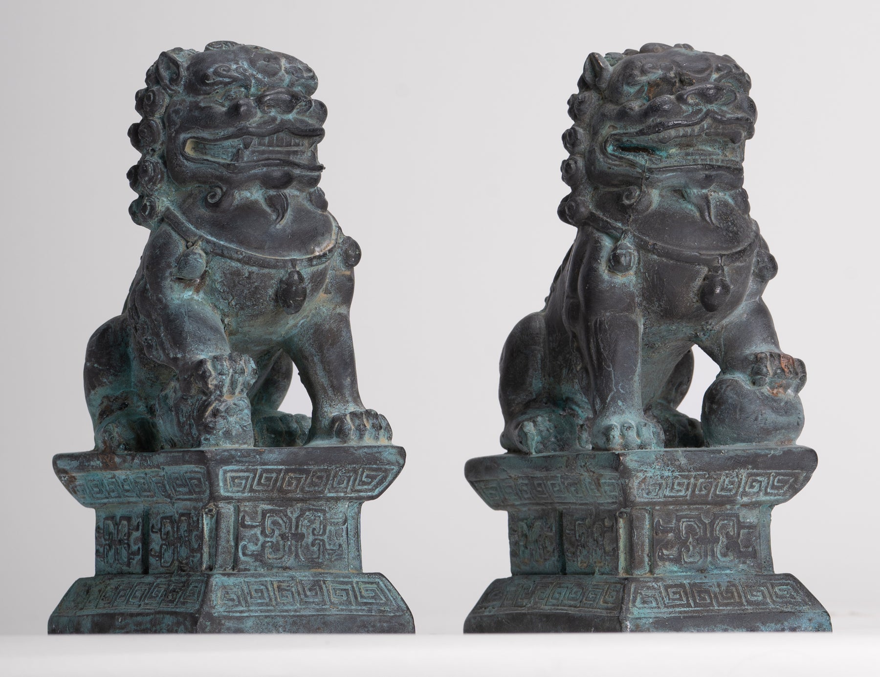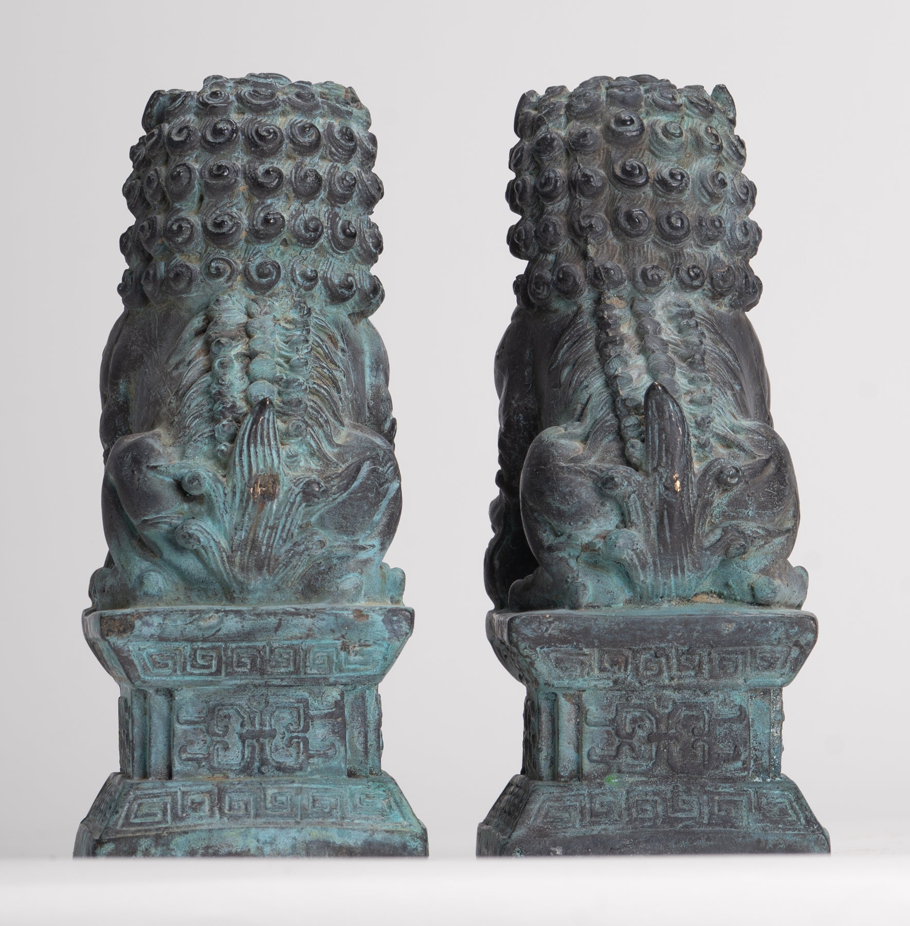 Antique Chinese Style Bronze Temple Guardian Lions Shishi Lions Foo Dogs Imperial Lions (Pair) - 16.5cm/7"