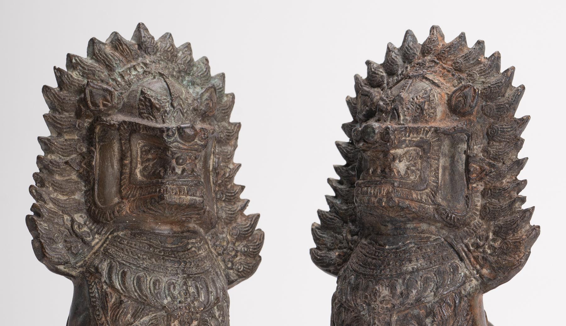 Un precioso par de figuras antiguas de Guardián del Templo o León/Singha de estilo tailandés.
