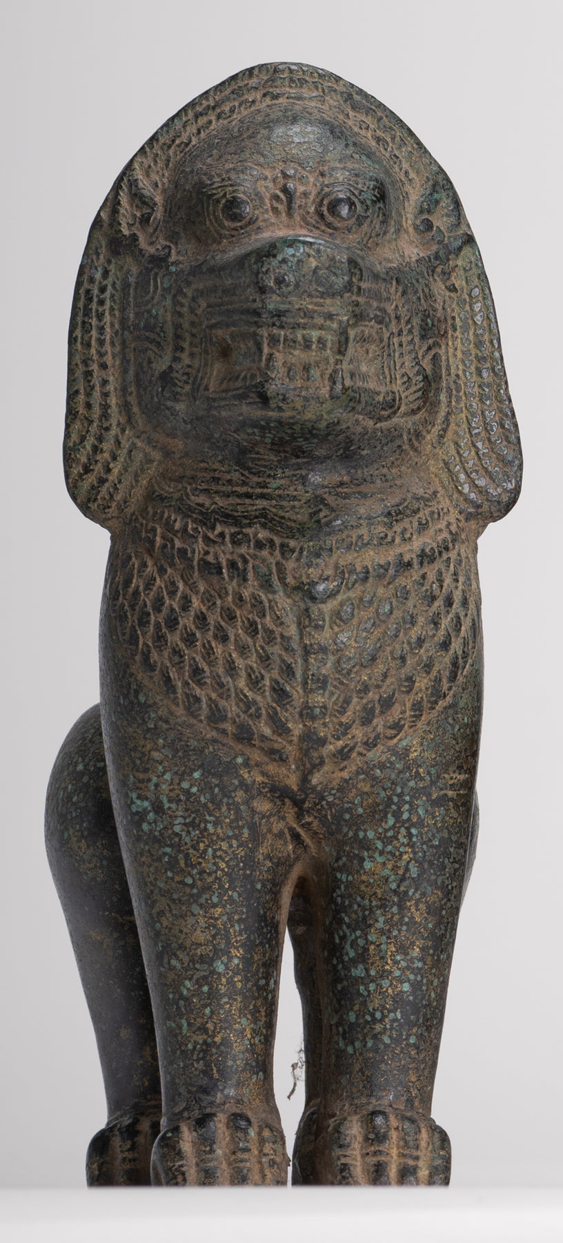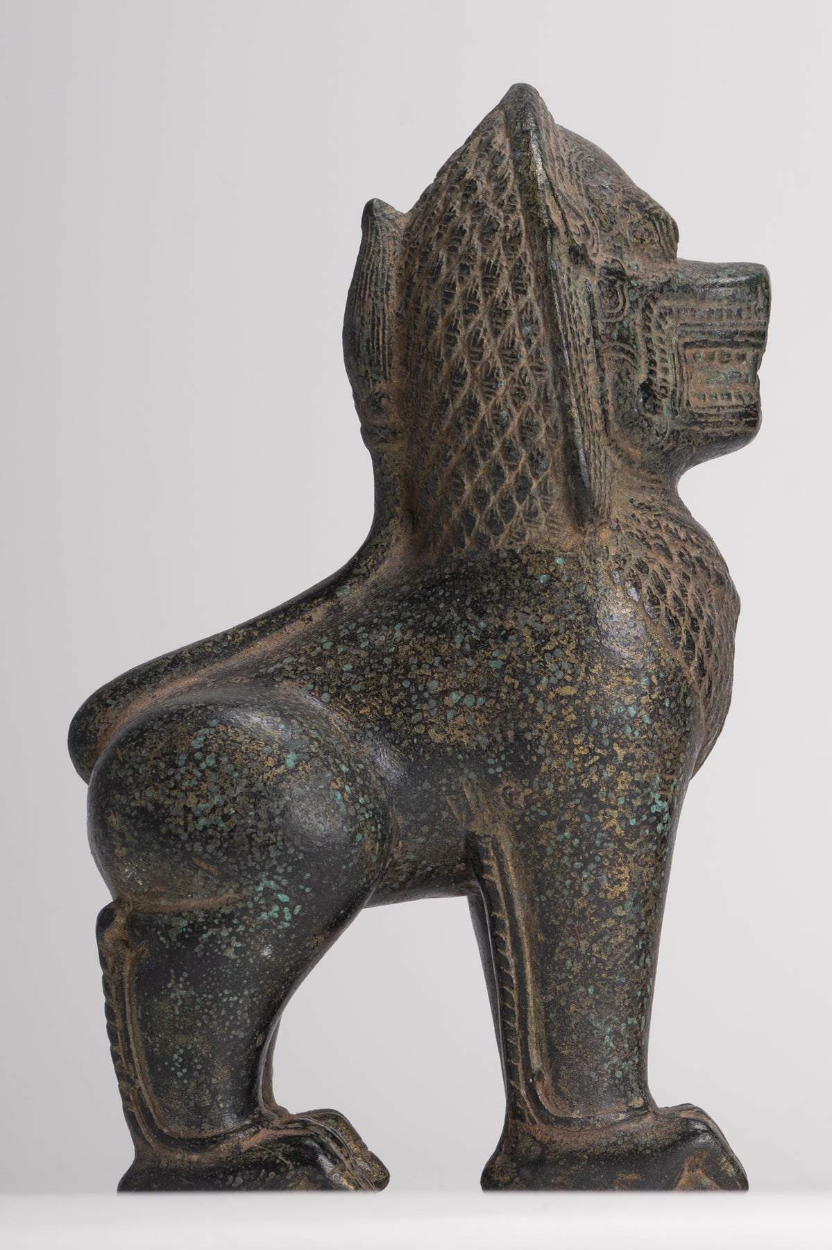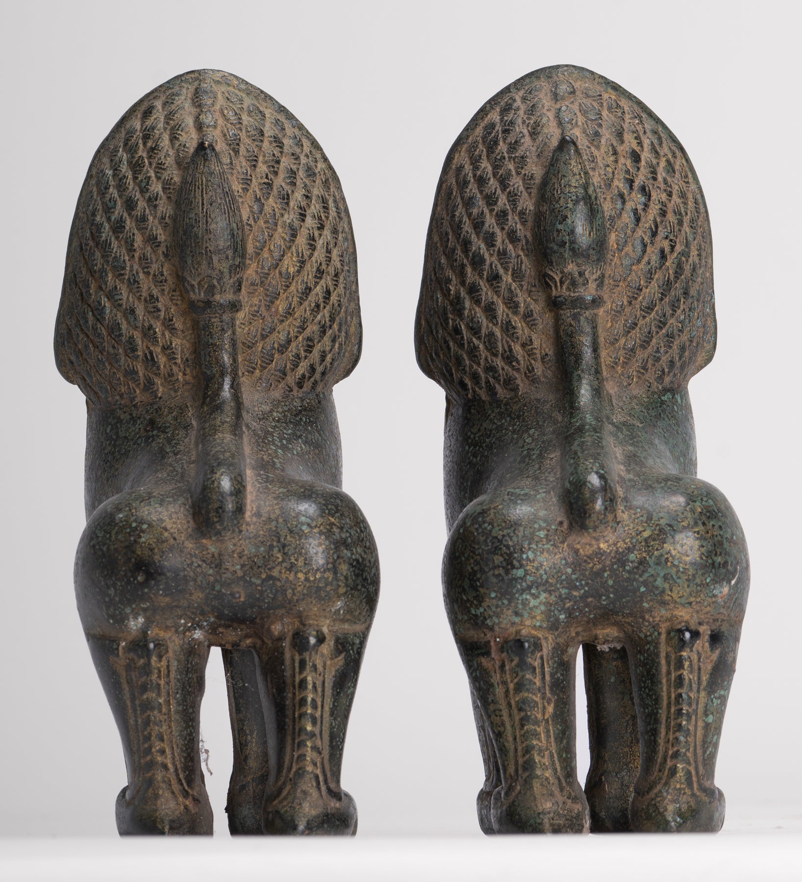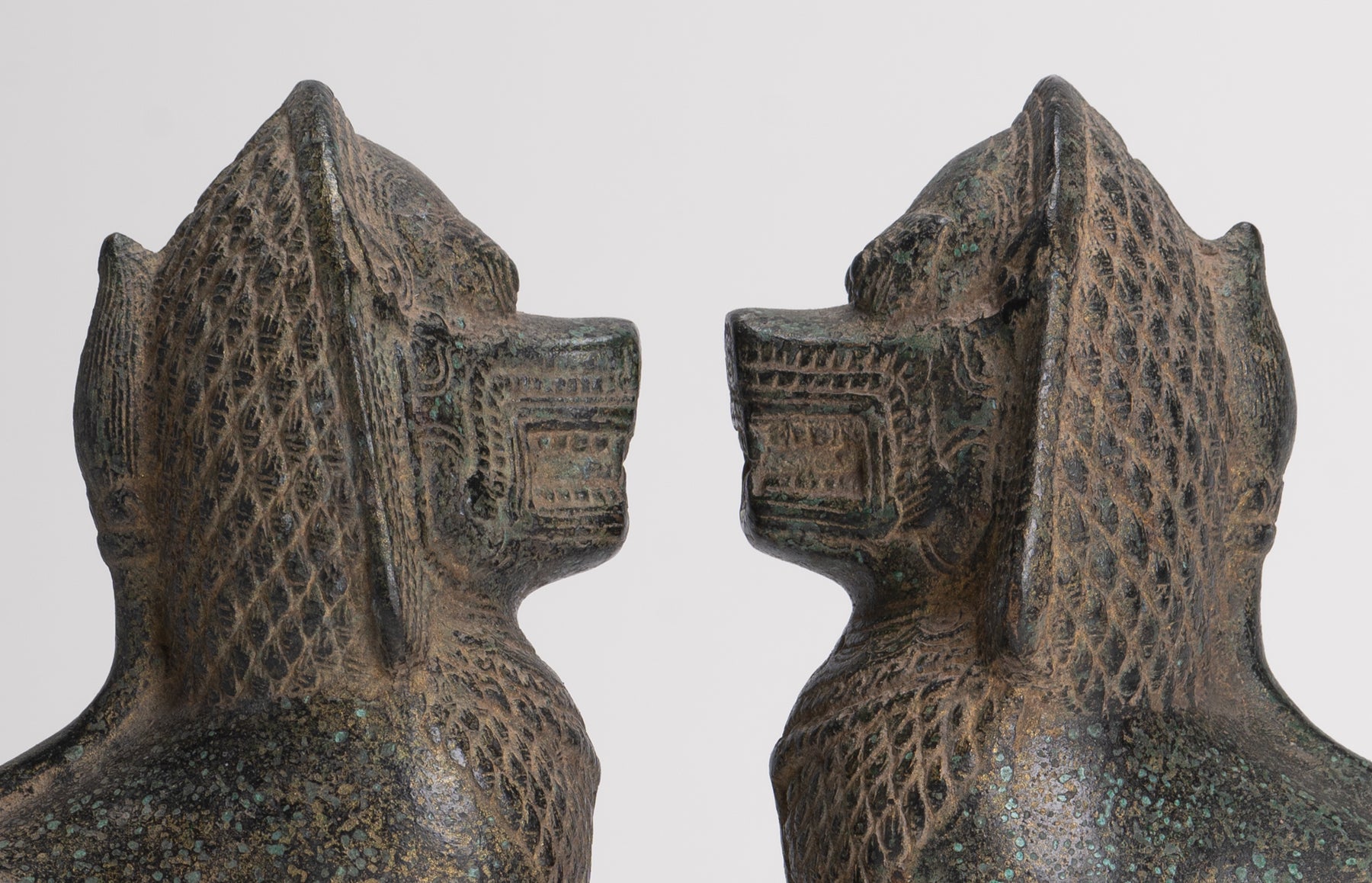 Guardián o leones del templo de pie de bronce estilo jemer antiguo (par) - 20 cm/8"