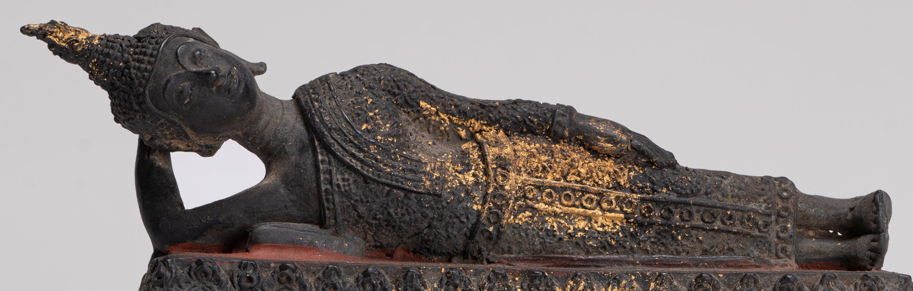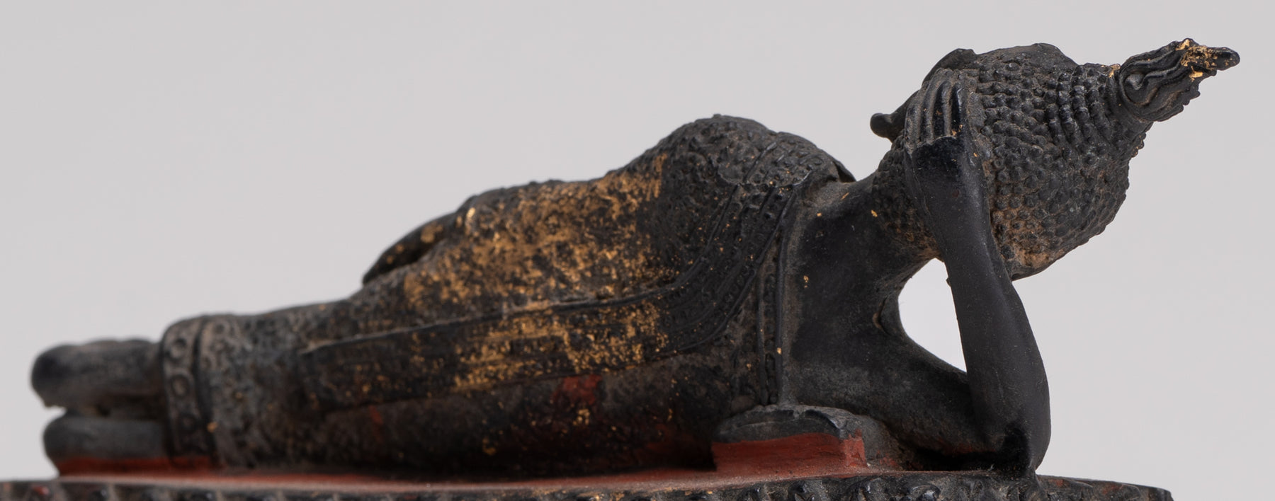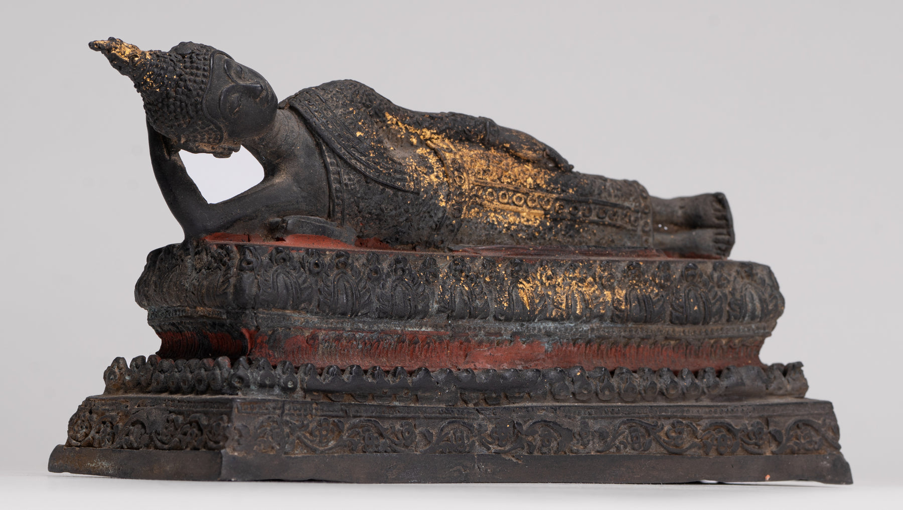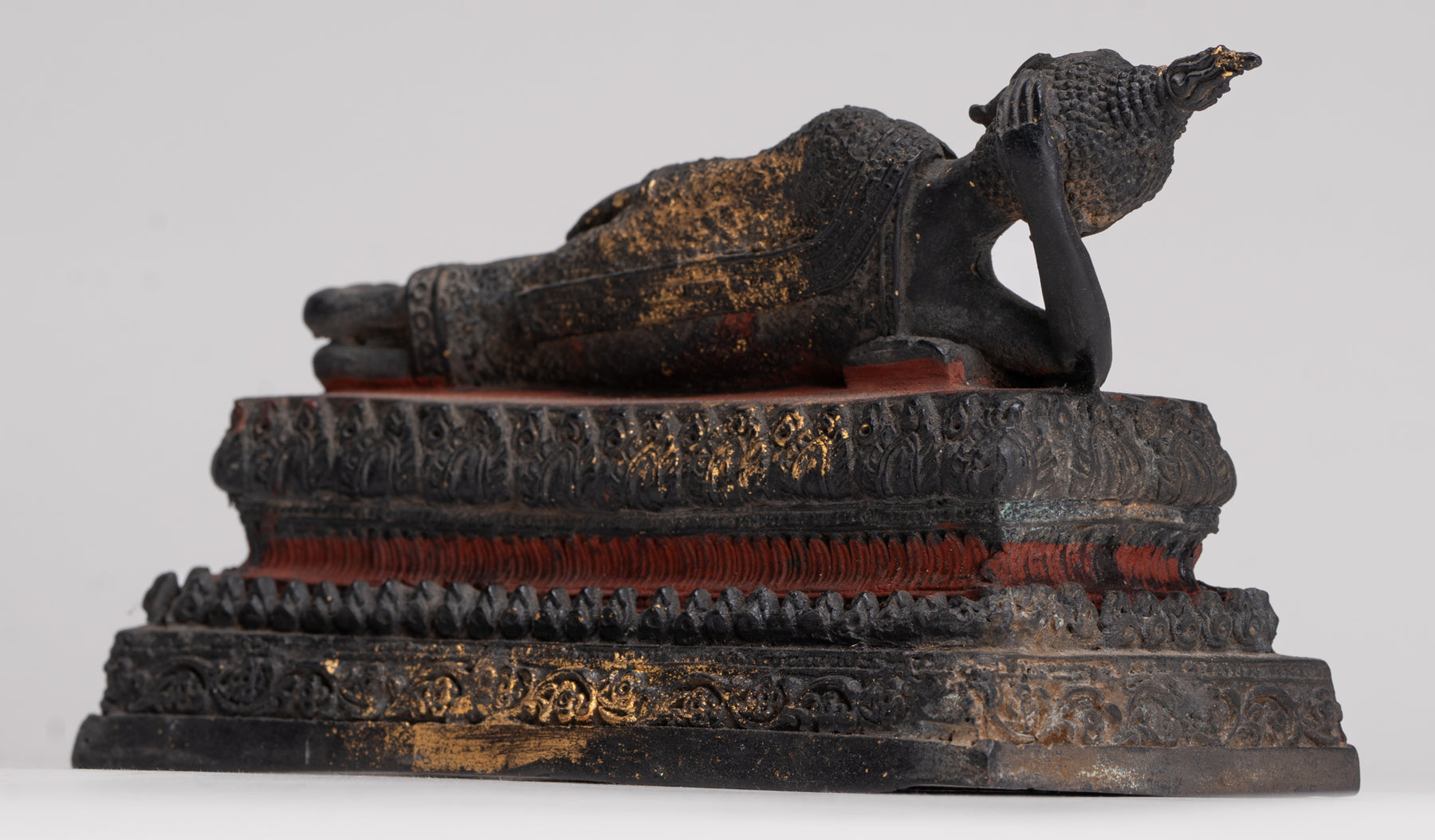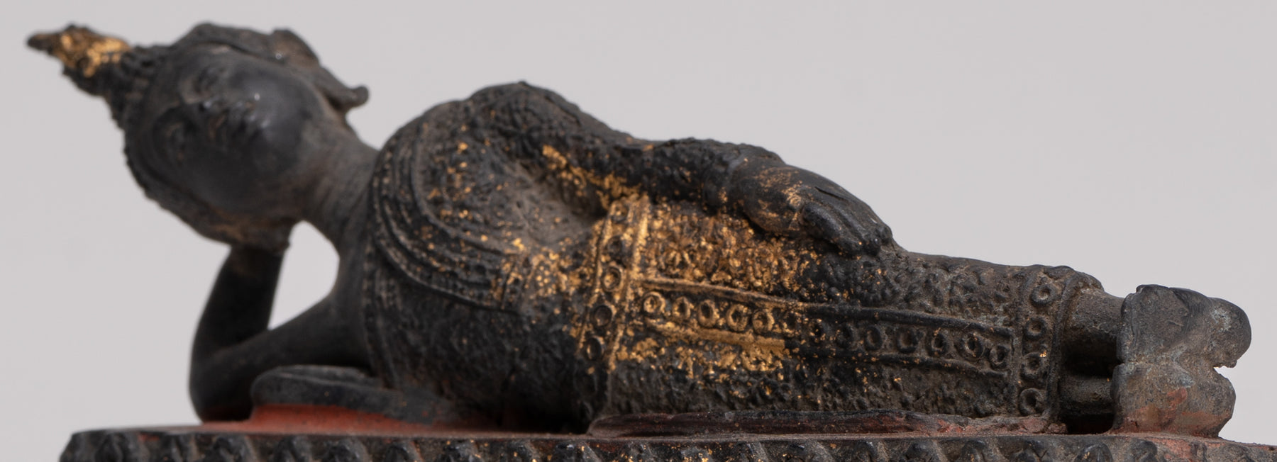 Buddha Statue - Antique Thai Style Bronze Rattanakosin Reclining Nirvana Buddha Statue - 19cm/8"