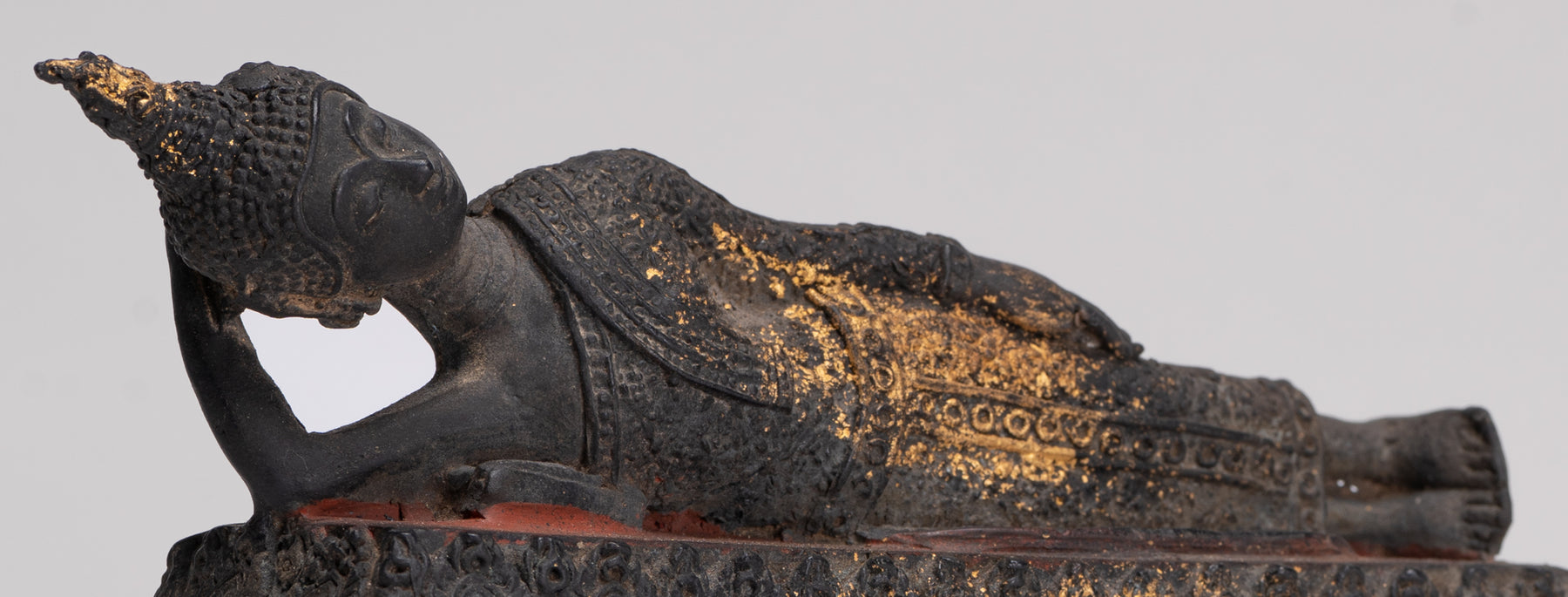 El rostro pacífico del Señor Buda irradia armonía. El Buda está acostado de lado en tranquilo reposo. Esta pose lo captura en sus momentos finales antes de su muerte. La postura también se conoce como el Buda dormido y simboliza el logro del nirvana o la iluminación del Buda. El Buda supo el momento exacto de su muerte y en ese momento se acostó a dormir y simplemente falleció pacíficamente con su alma iluminada escapando eternamente del ciclo de samasara.