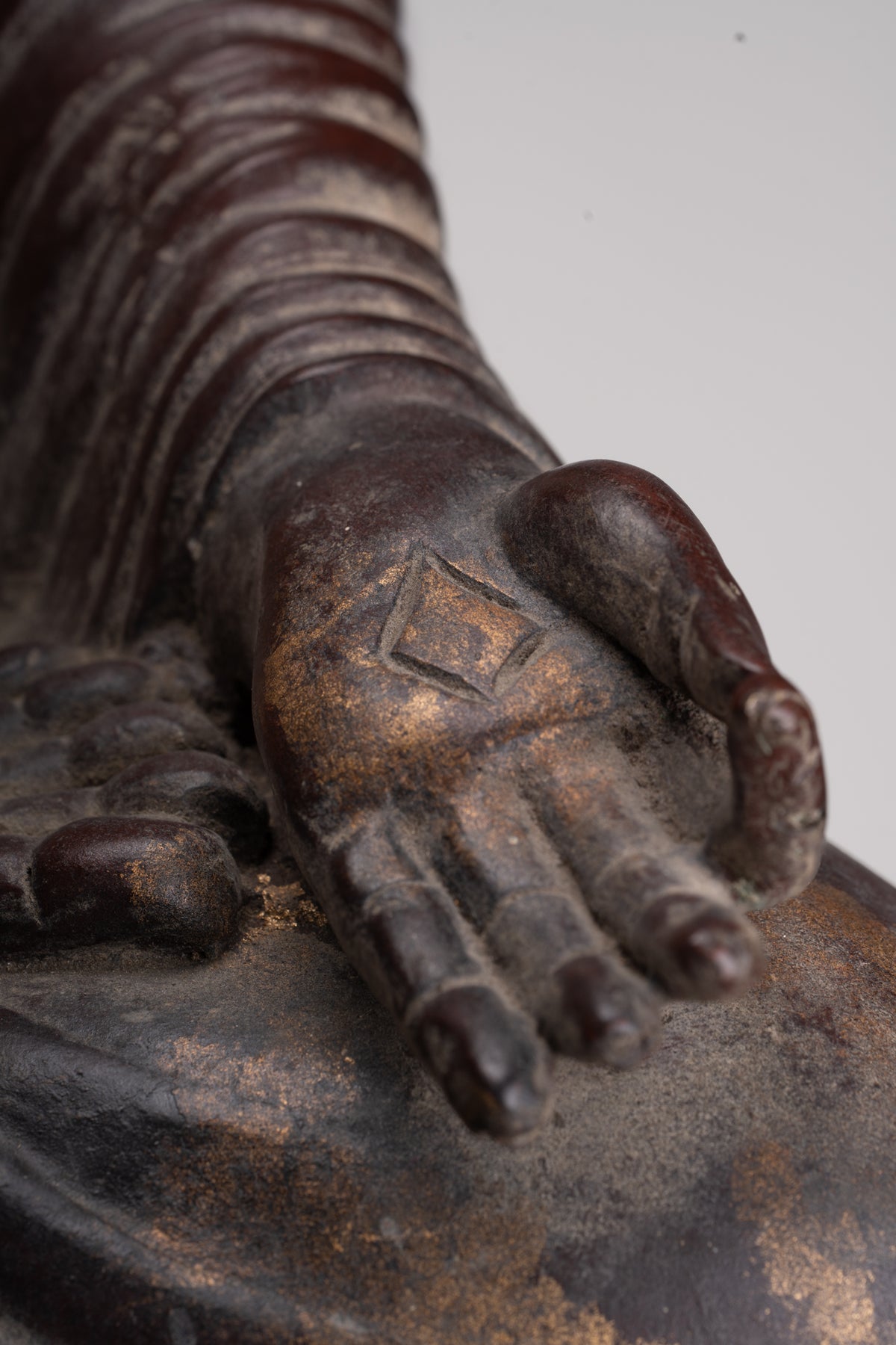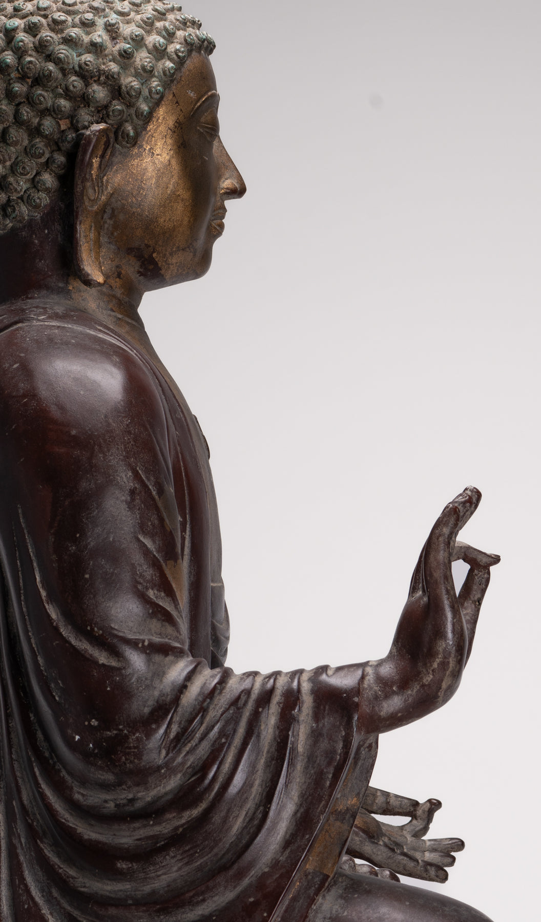Un buda de estilo tibetano antiguo sentado en la publicación de Half Lotus o Ardha Padmasana, con las manos sostenidas en el dharmachakra o enseñanza Mudra.